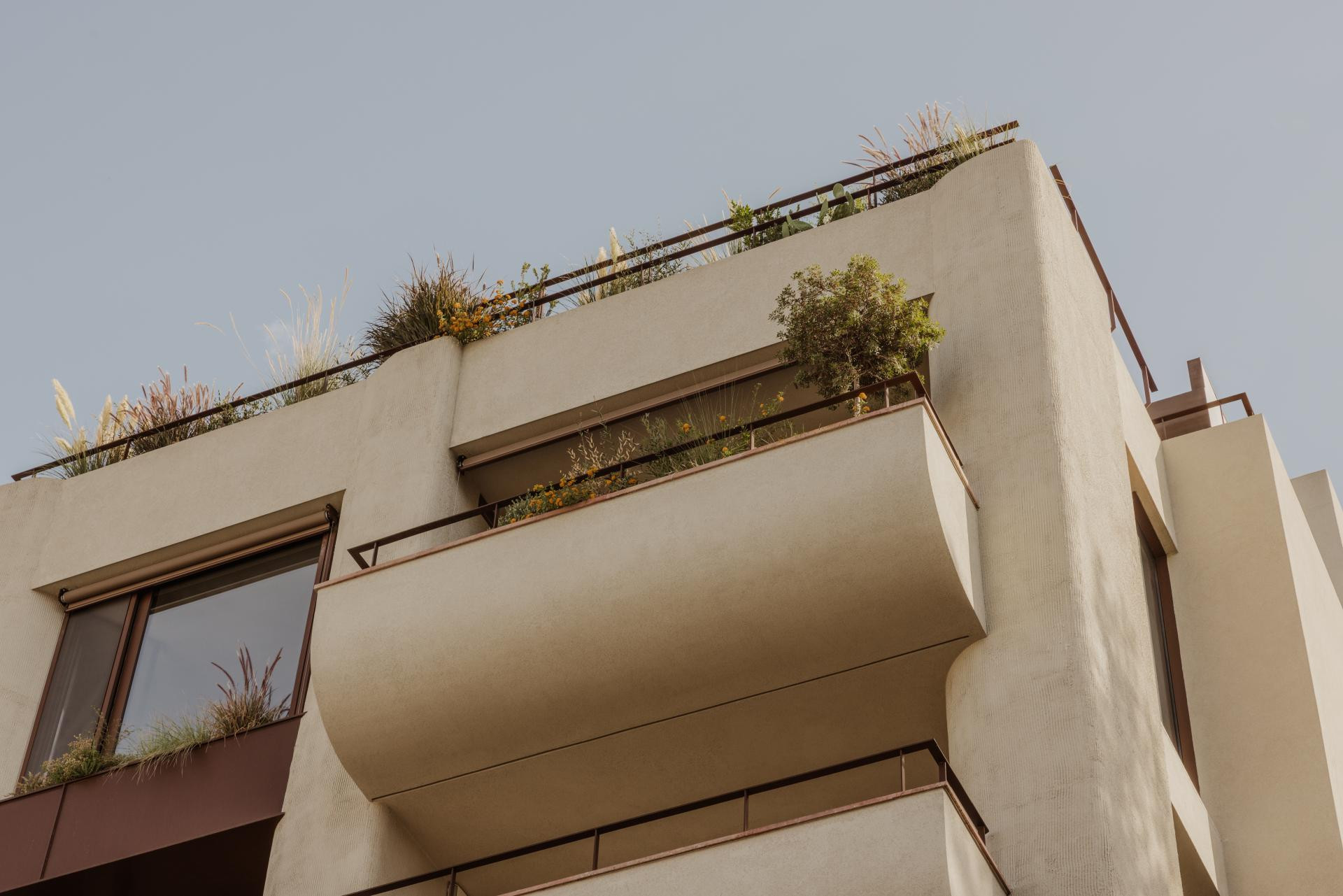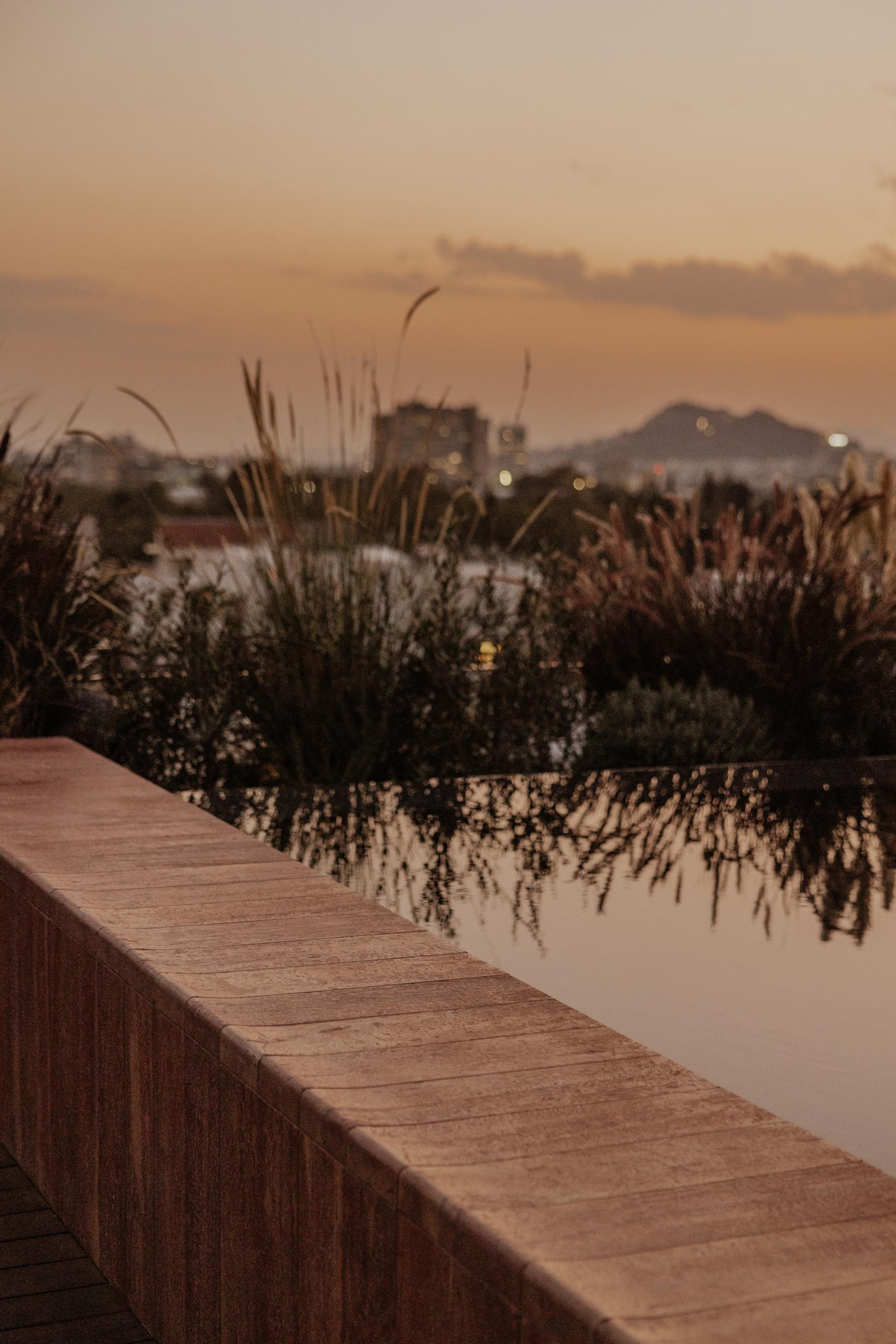 Eksterijer zgrade povezuje geometrijsku strogoću internacionalnog stila, karakterističnog za razvoj Papagoua u 20. stoljeću, s meko modeliranim oblinama, drvenim akcentima i raskošnim mediteranskim zelenilom. Na tragu je modernističkog naslijeđa, ali potpuno usklađen s potrebama i estetikama 21. stoljeća.