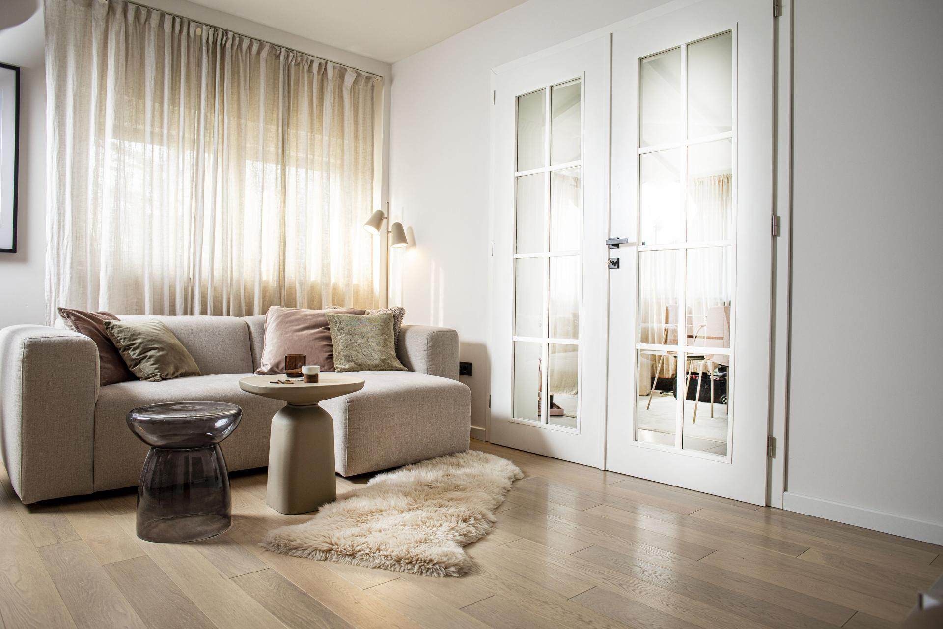 U stanu prevladavaju ugodne pastelne boje, a detalji su u tamnijim tonovima kako bi prostor dobio na karakteru. Kolorit daju vaze i cvijeće, koje vlasnica jako voli i koje su joj glavne za dekoriranje prostora. Na podu je hrastov parket pogodan za podno grijanje, a zidovi su obojeni Dulux bojama. Zavjese su od prirodnog lana kako bi se naglasila udobnost prostora, a tapecirani namještaj, sofa i barske stolice od finog su buklea. Po mjeri su rađeni namještaj u kupaonici, ormari u spavaćoj sobi, kuhinja i TV komoda. Stolice su Pedrali, sofa Sits, kupljeno u Triki, a coffee stolovi su By-Boo.
