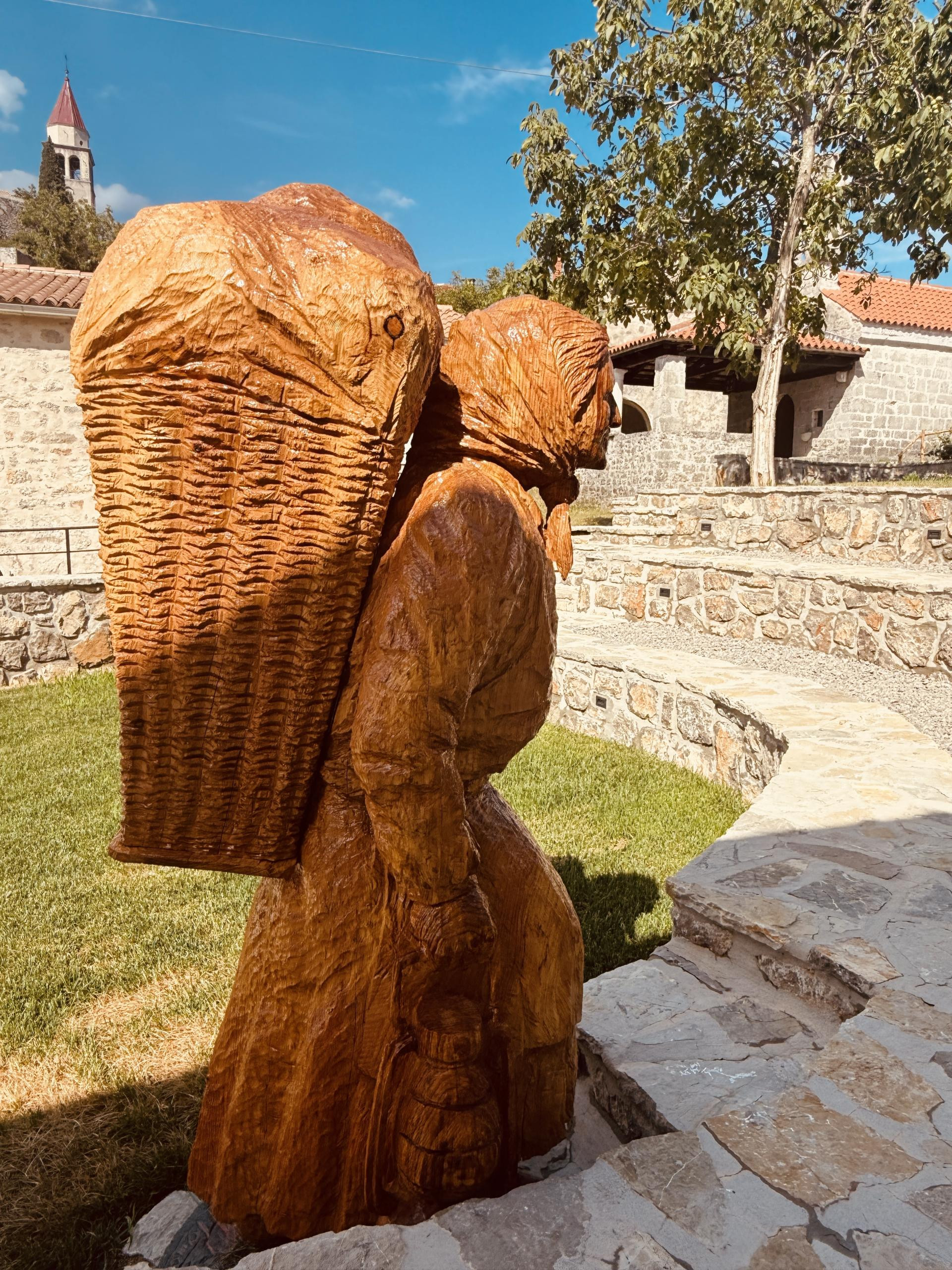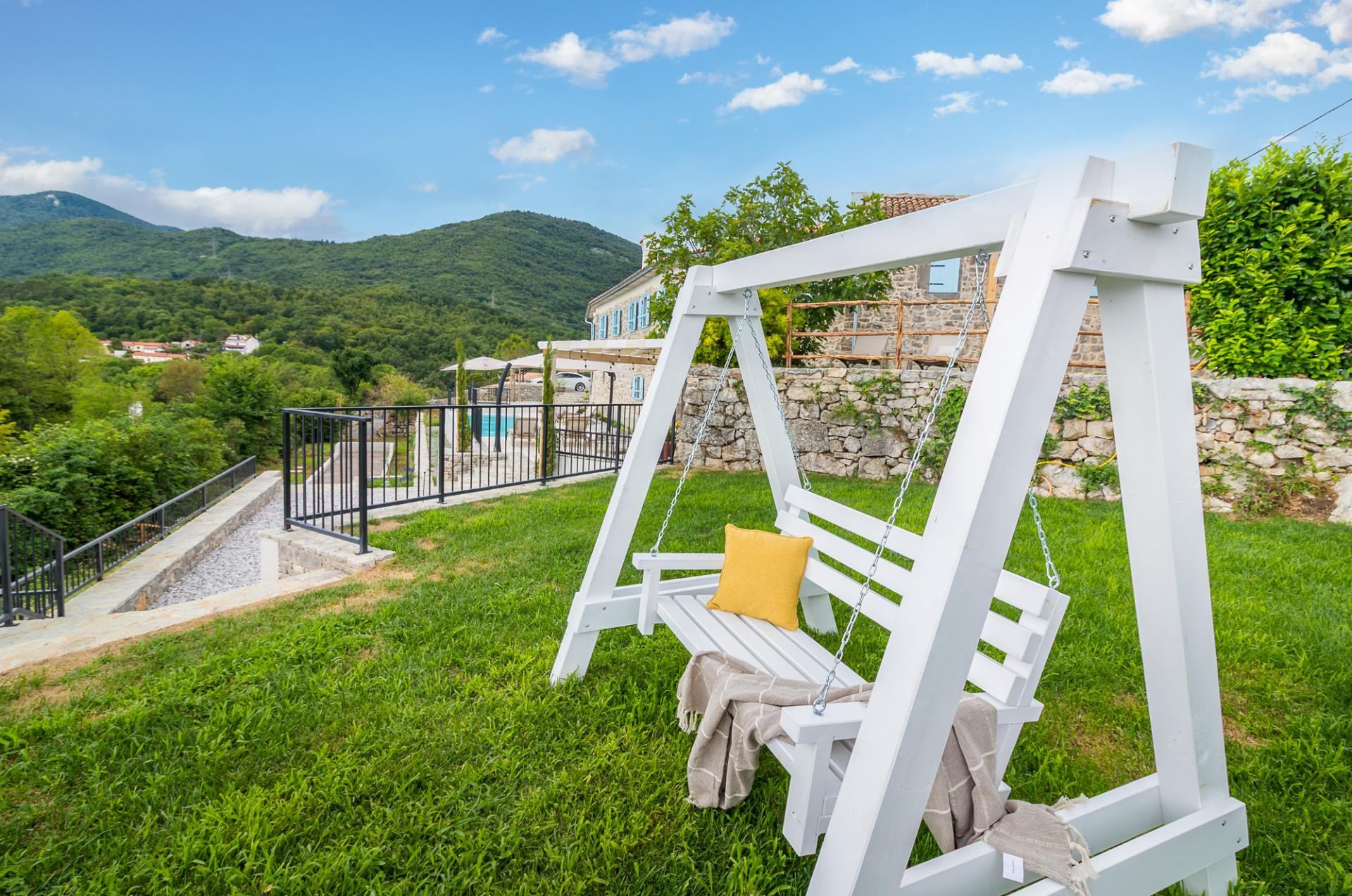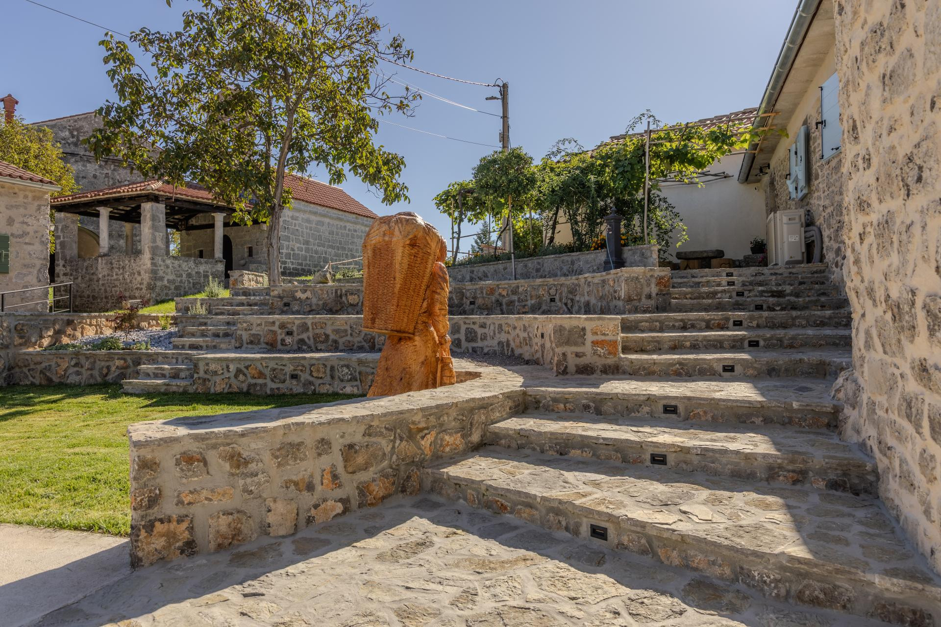 Kuća je puna detalja s pričom. U vrtu stoji kip pratete Anice, izrađen od cedra starog 120 godina, prikazujući mljekaricu kako nosi košaru na leđima, simbol svakodnevnog života predaka. Na ulazu je kamen s uklesanim stihovima pjesnika Josip Stanića: "Kamik, kamečina, spran i tučen, trudan i zmučen. A drag, tako drag, va srce zavučen".