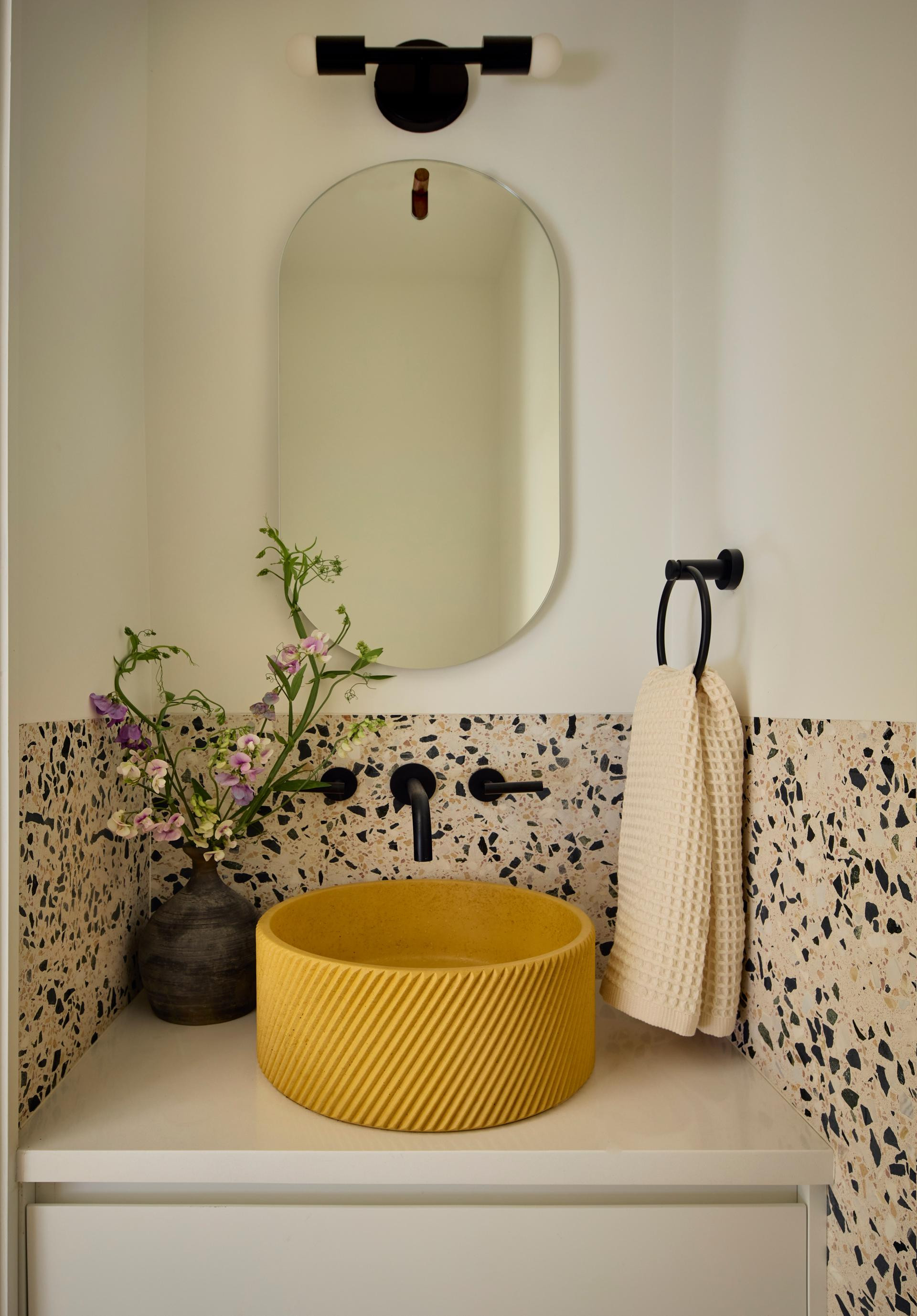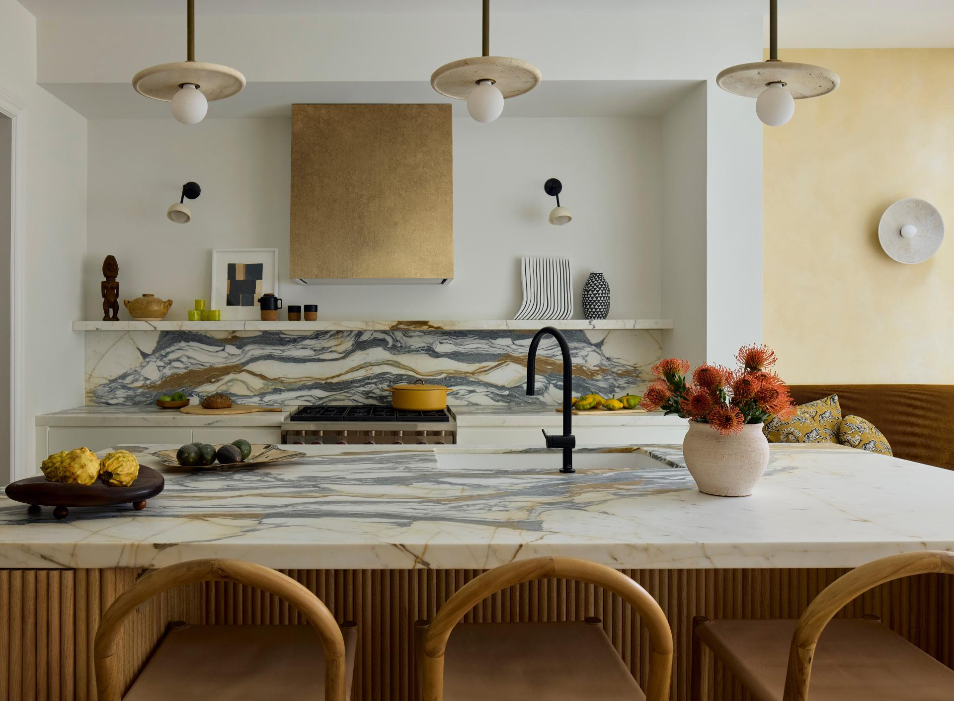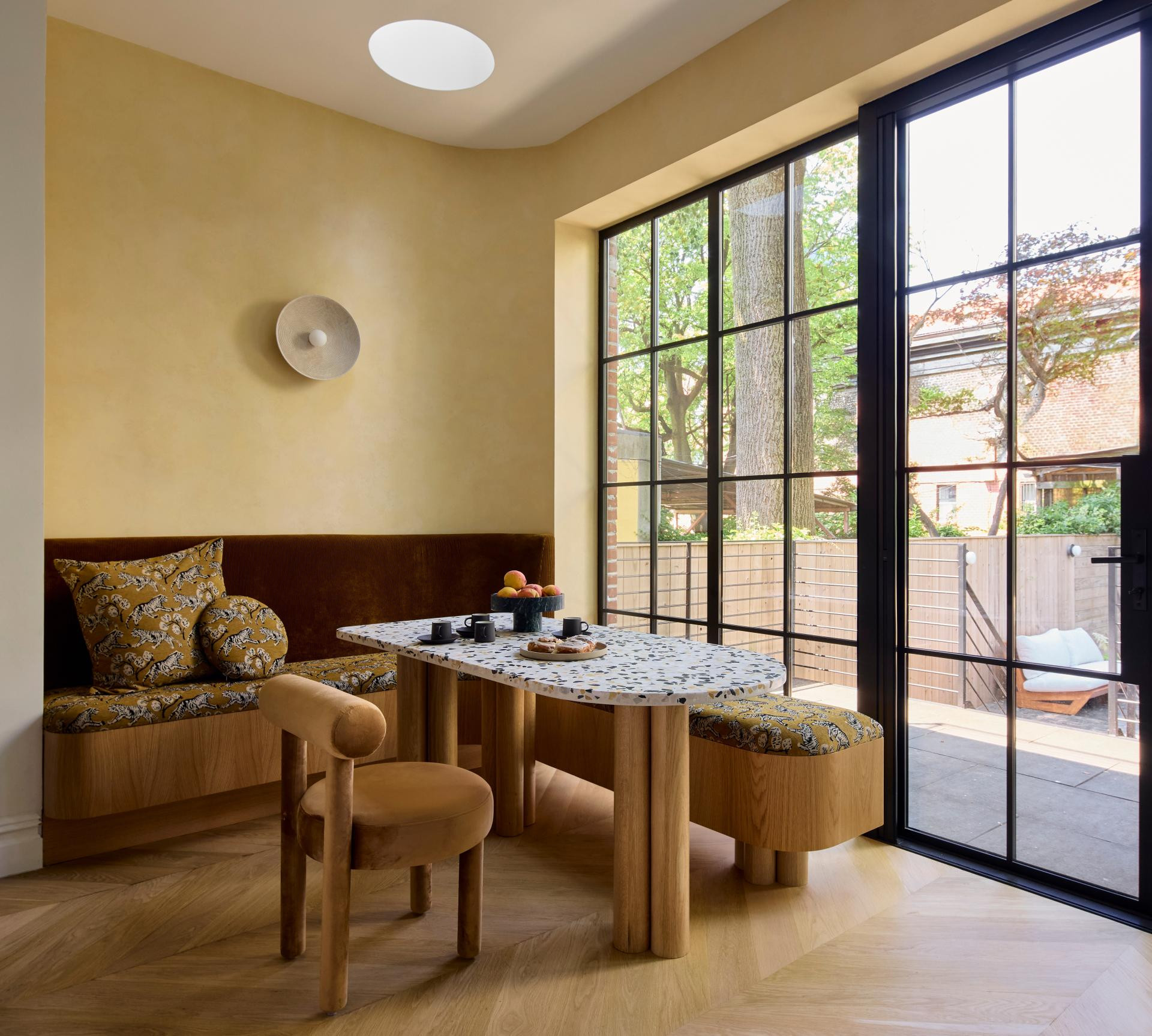 Dnevna soba ima kamin uokviren policama po mjeri, a blagovaonica je povezana s kuhinjom koja se otvara prema vrtu. Zahvaljujući podignutom podu u stražnjem dijelu kuće, kuhinja uživa u višim stropovima i obilju svjetla. Kombinacija žbukane žute pozadine, arabescato mramora i čeličnih prozora čini ovu zonu središtem života i okupljanja.