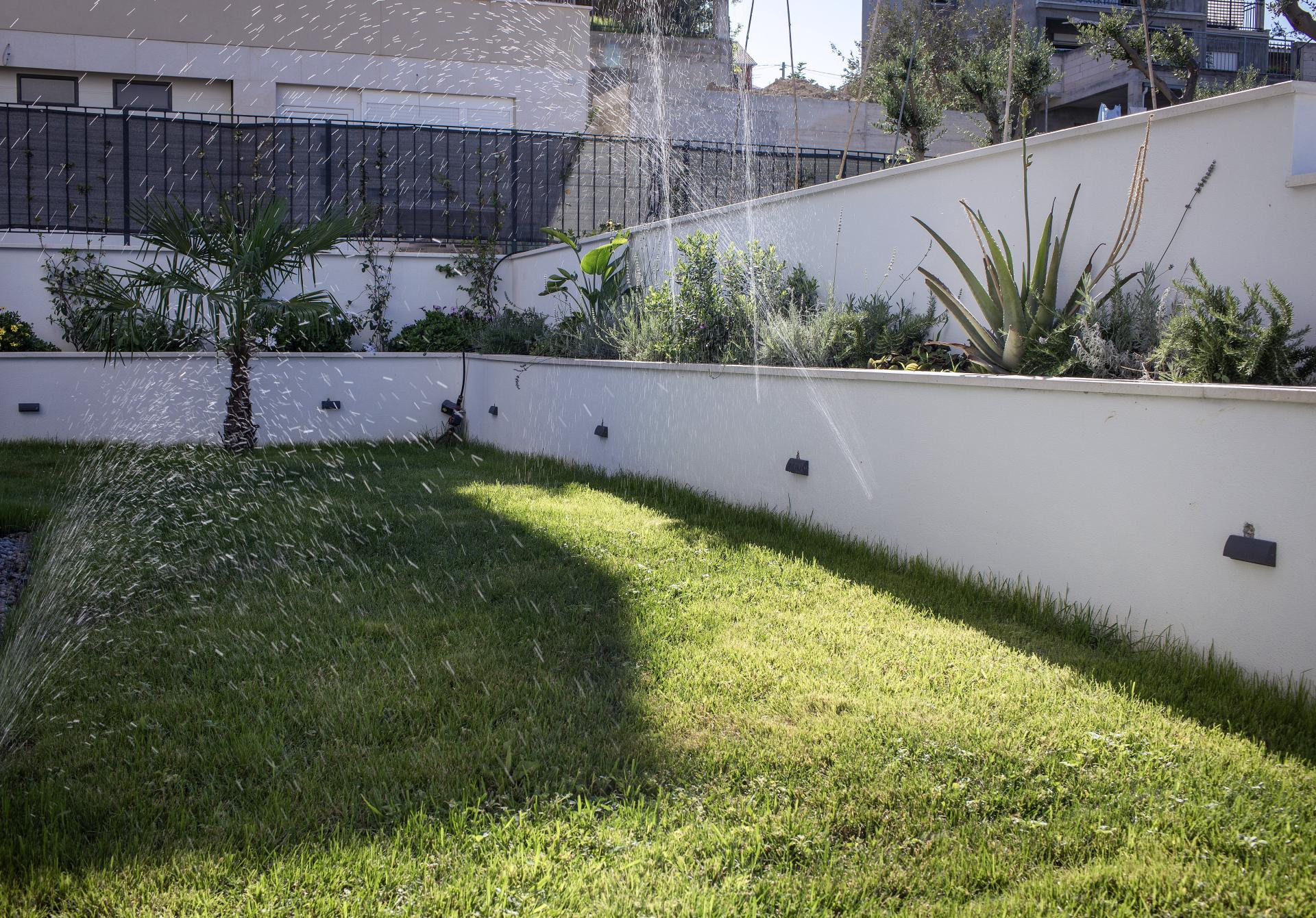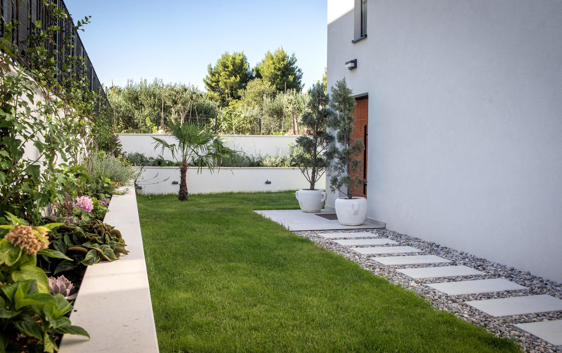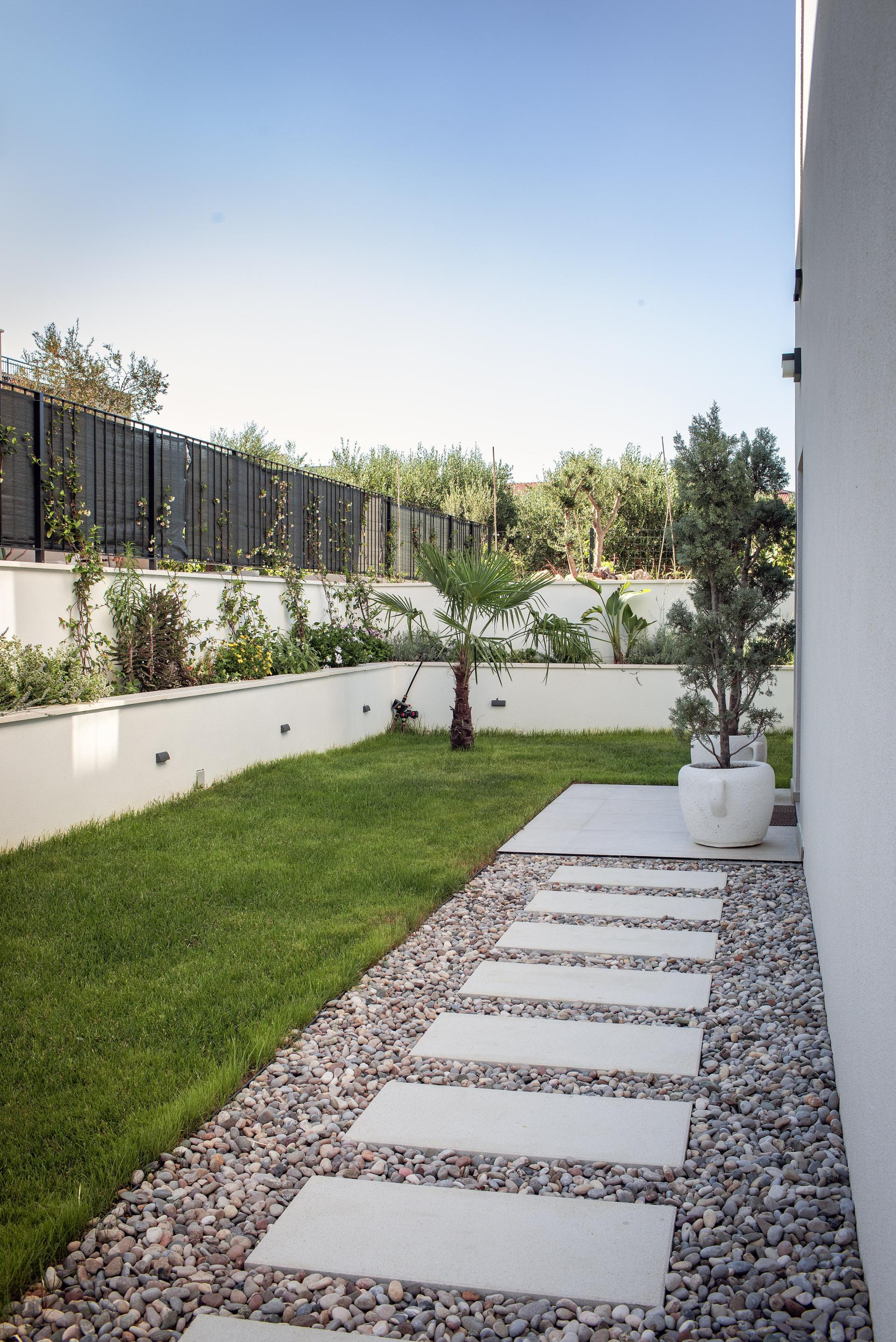 Vanjski prostor bio je prilično izazovan za uređenje jer su htjeli da se prirodno nastavlja na interijer. Htjeli su mnogo zelenila i mnogo raznih biljaka i cvijeća, i to sve u mediteranskom stilu, pa su sve sami sadili, uz veliku pomoć obitelji, jer oni sami do tada nisu imali iskustva s biljkama i sadnjom, ali su znali da žele imati vrt koji će djelovati smirujuće i lijepo - objašnjava Linda i dodaje da im je najzahtjevnije bilo sijanje trave u kasno proljeće i provlačenje navodnjavanja kroz čitavo dvorište.
