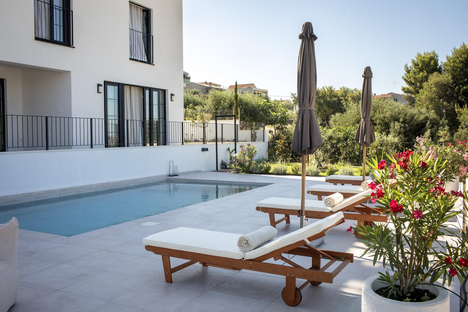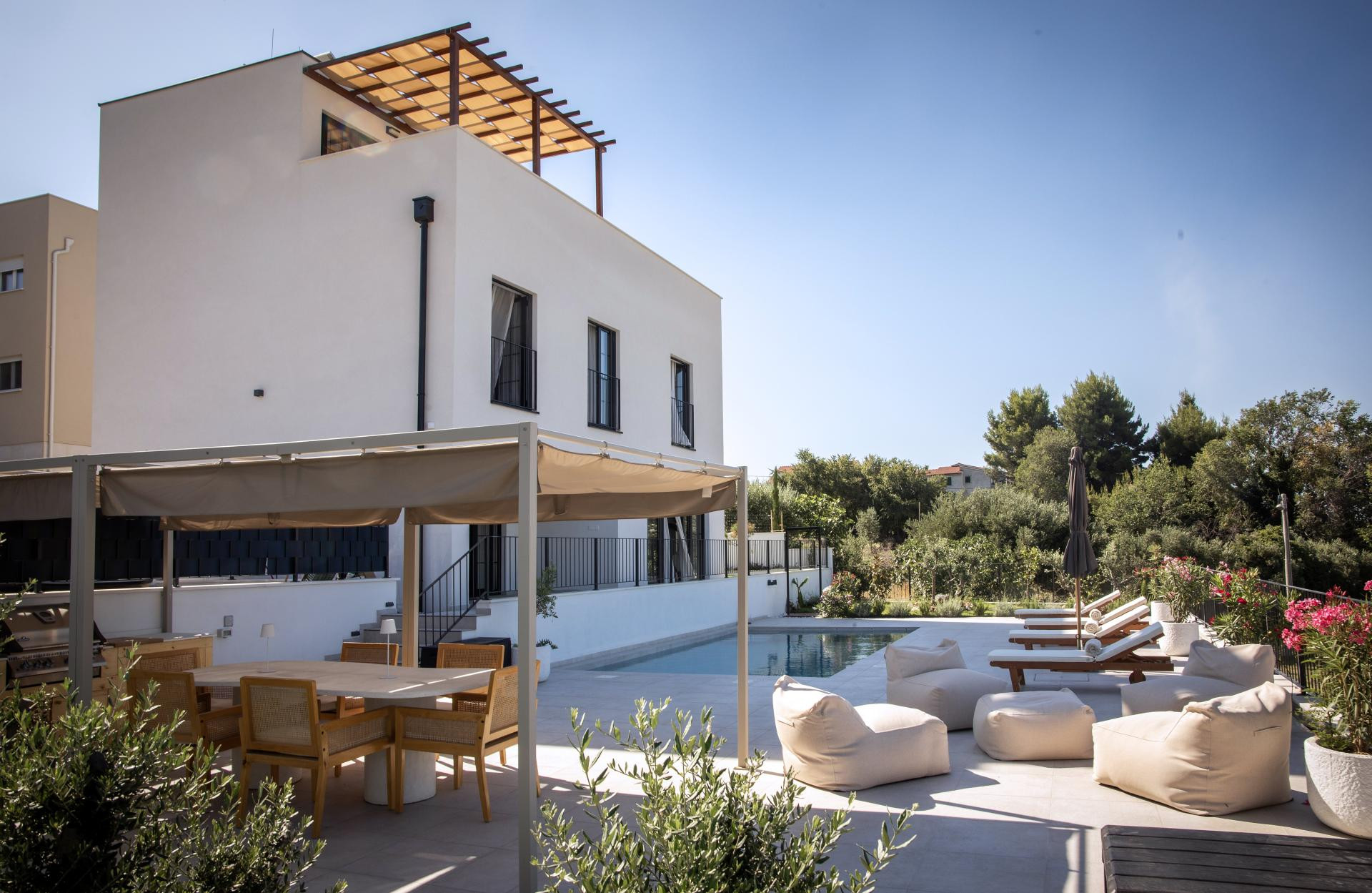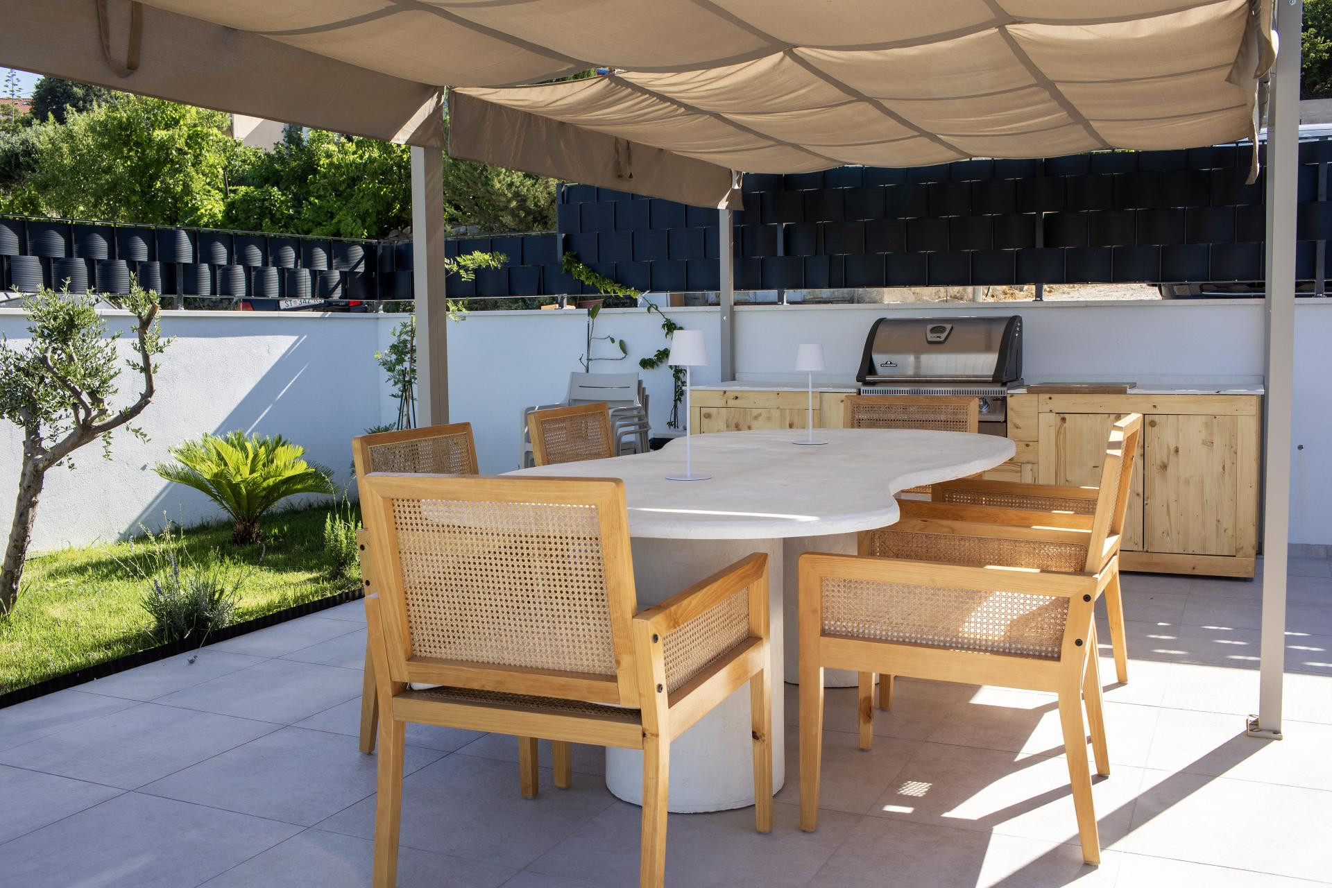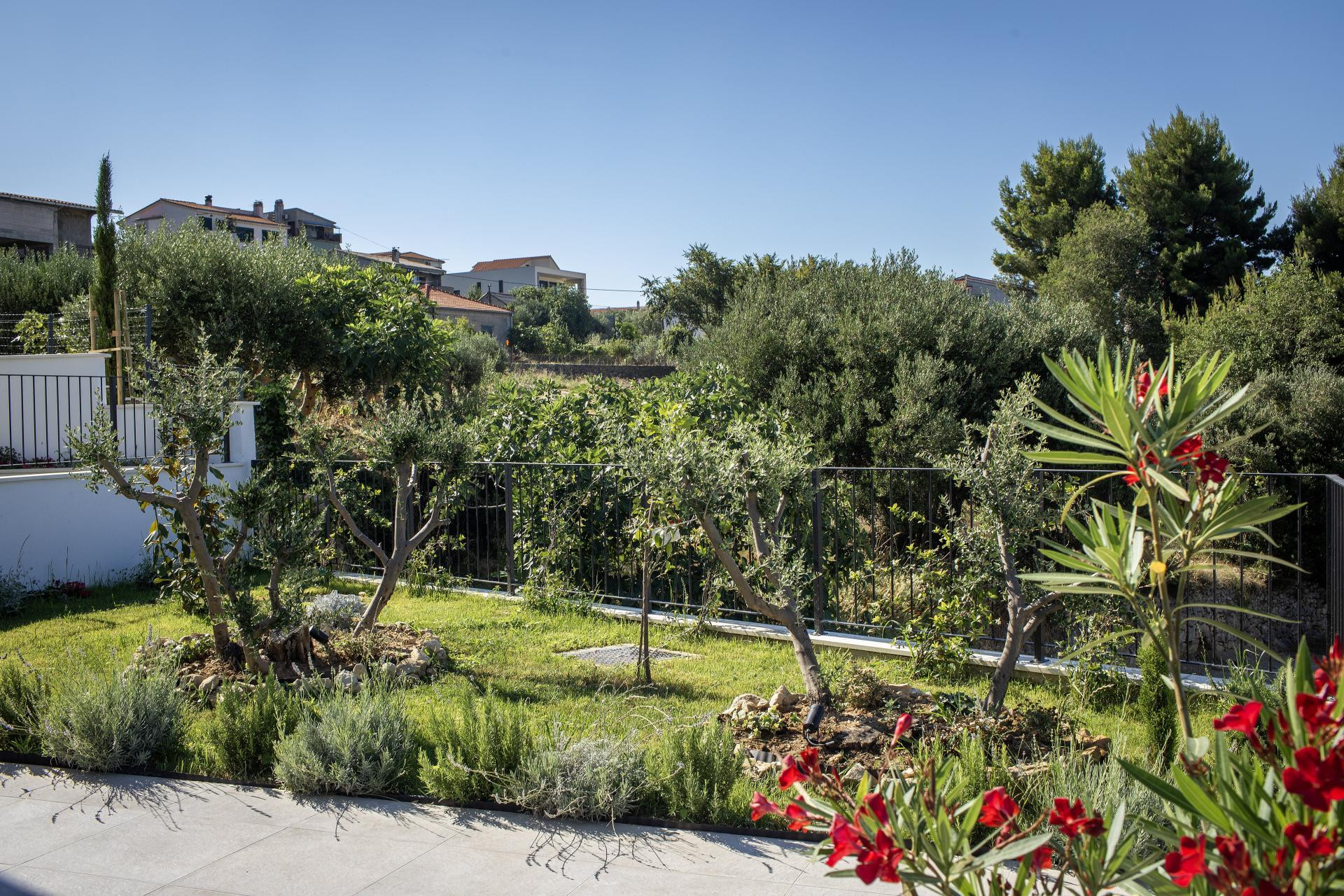 Vanjski prostor bio je prilično izazovan za uređenje jer su htjeli da se prirodno nastavlja na interijer. Htjeli su mnogo zelenila i mnogo raznih biljaka i cvijeća, i to sve u mediteranskom stilu, pa su sve sami sadili, uz veliku pomoć obitelji, jer oni sami do tada nisu imali iskustva s biljkama i sadnjom, ali su znali da žele imati vrt koji će djelovati smirujuće i lijepo - objašnjava Linda i dodaje da im je najzahtjevnije bilo sijanje trave u kasno proljeće i provlačenje navodnjavanja kroz čitavo dvorište.