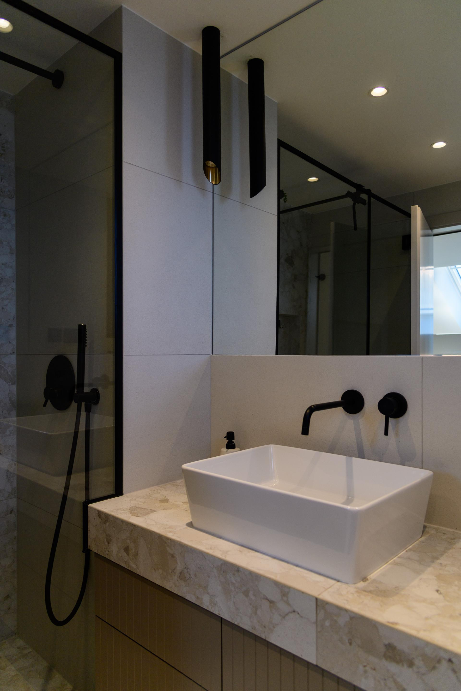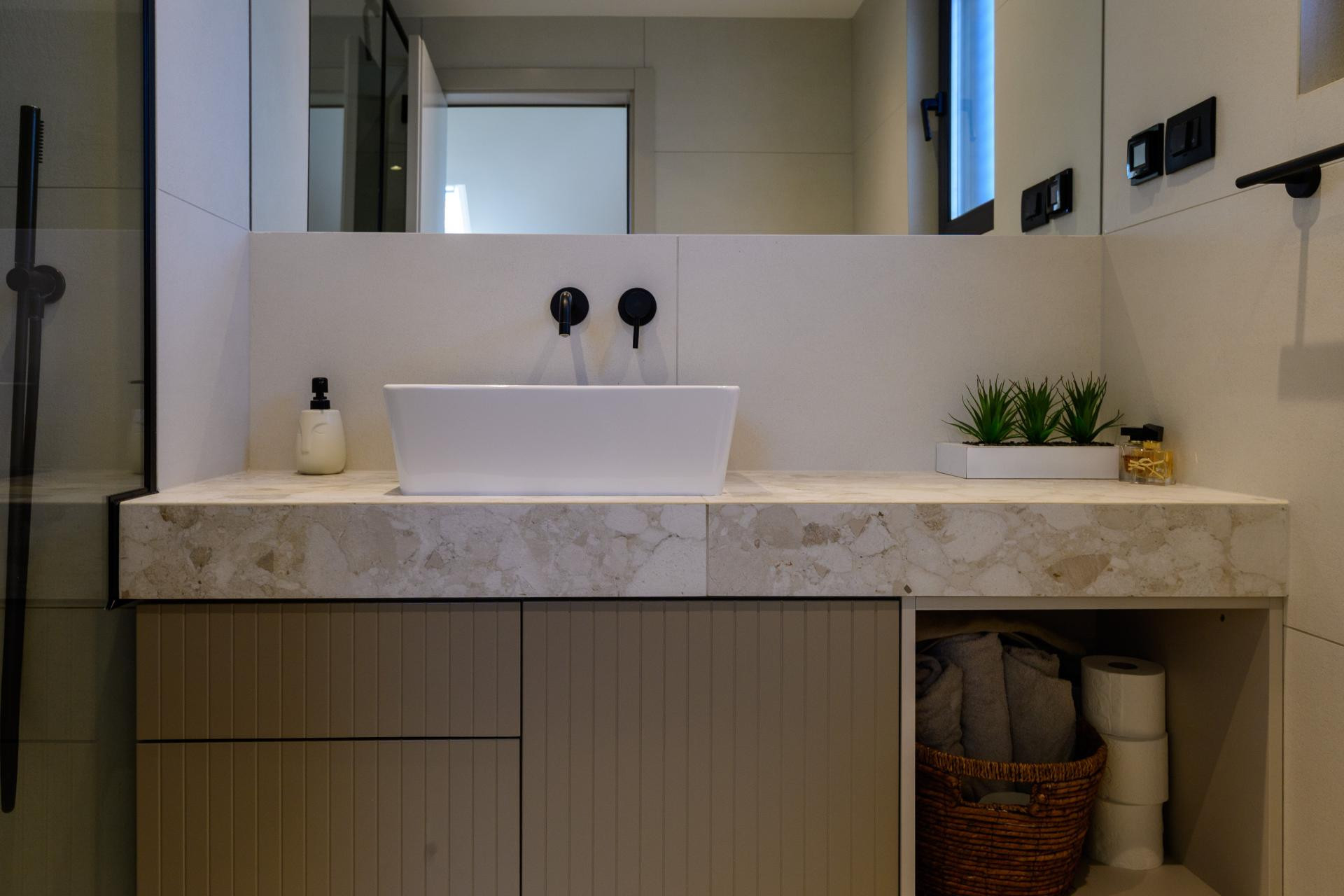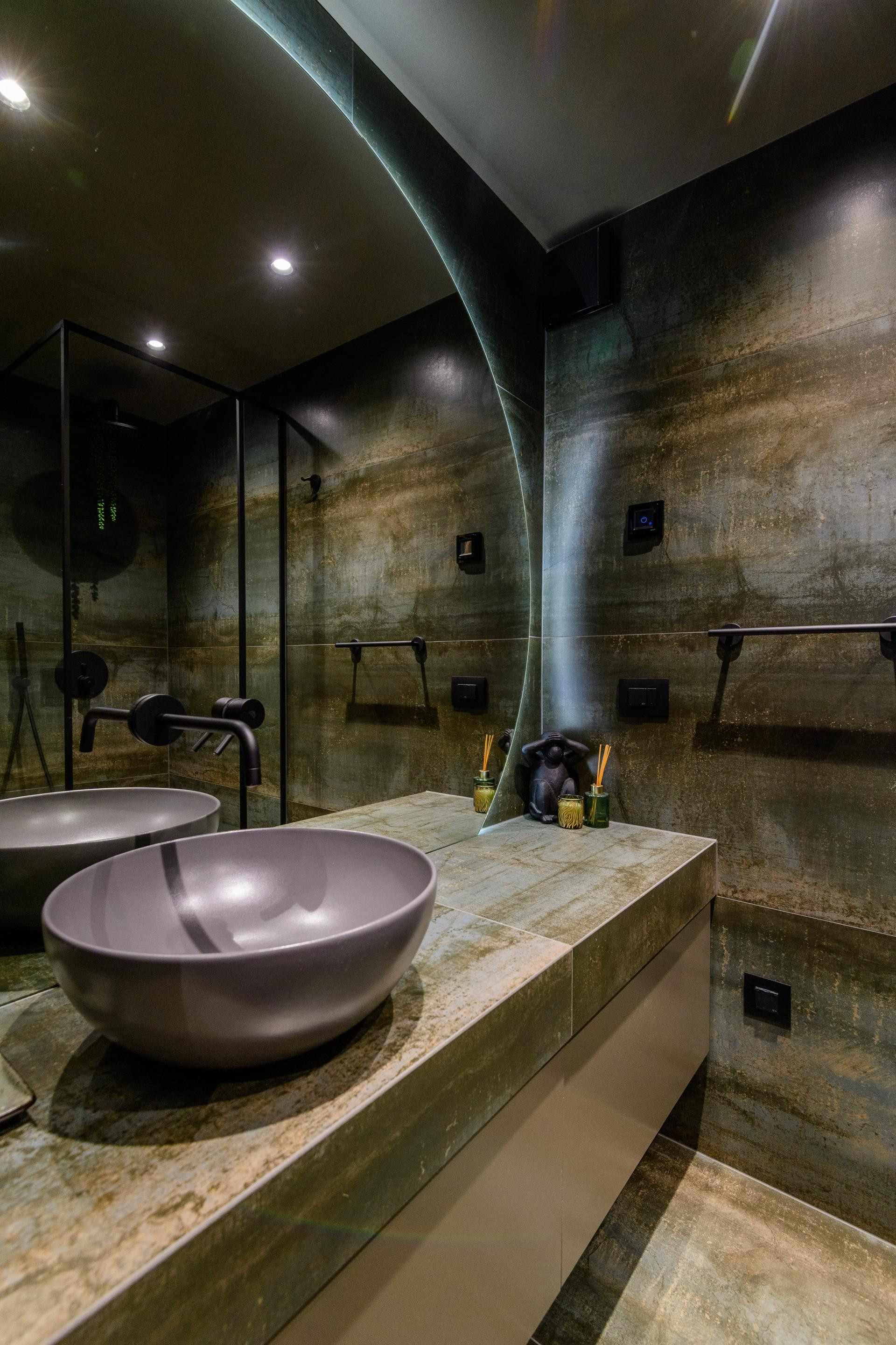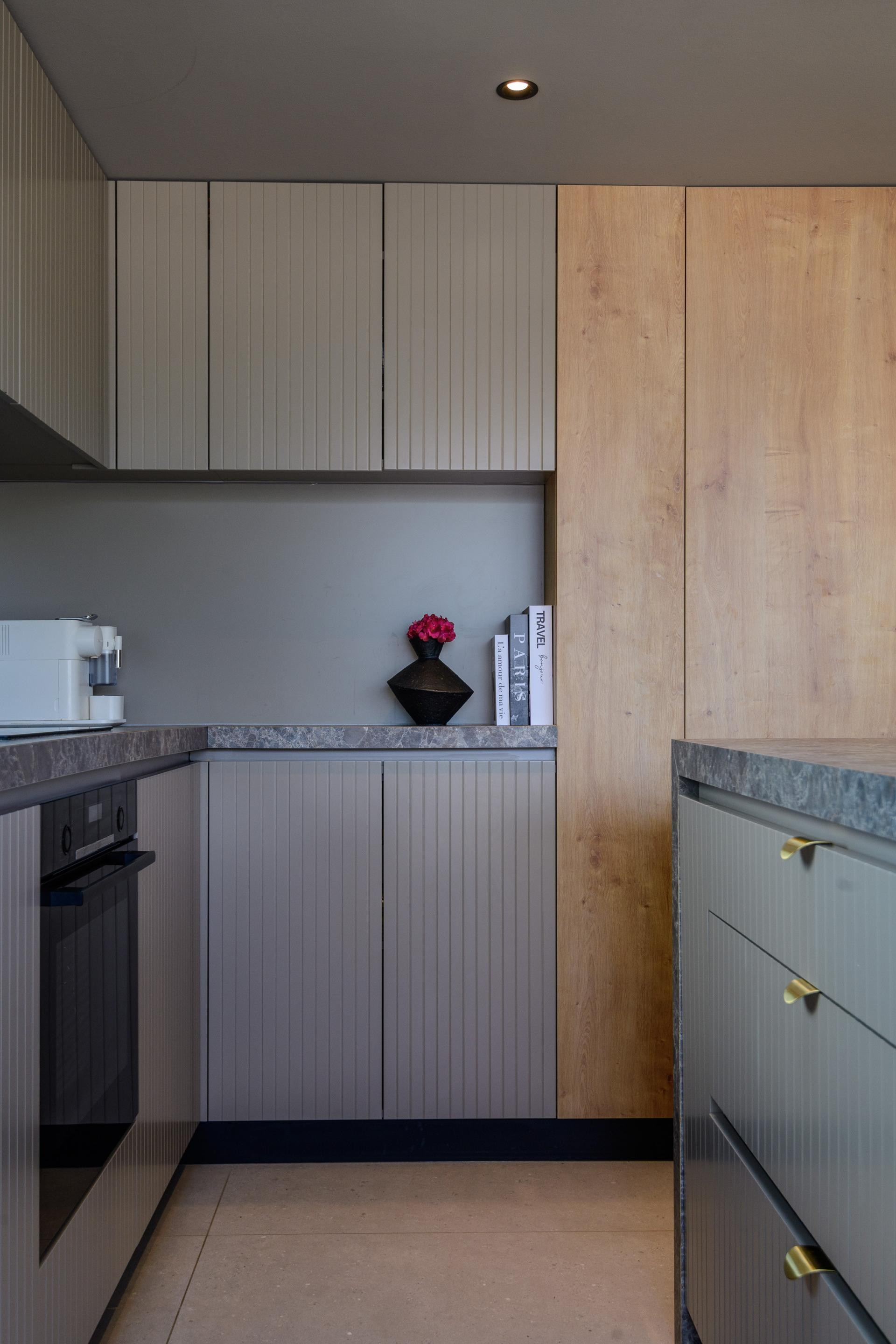 Kuhinja i kupaonice, kao najzahtjevniji za uređenje, također su prilagođene mogućnostima prostora. U kuhinji se viseći elementi nisu mogli ugraditi zbog prozora, pa su se rijetke radne plohe i skladišni prostor nadomjestili otokom.