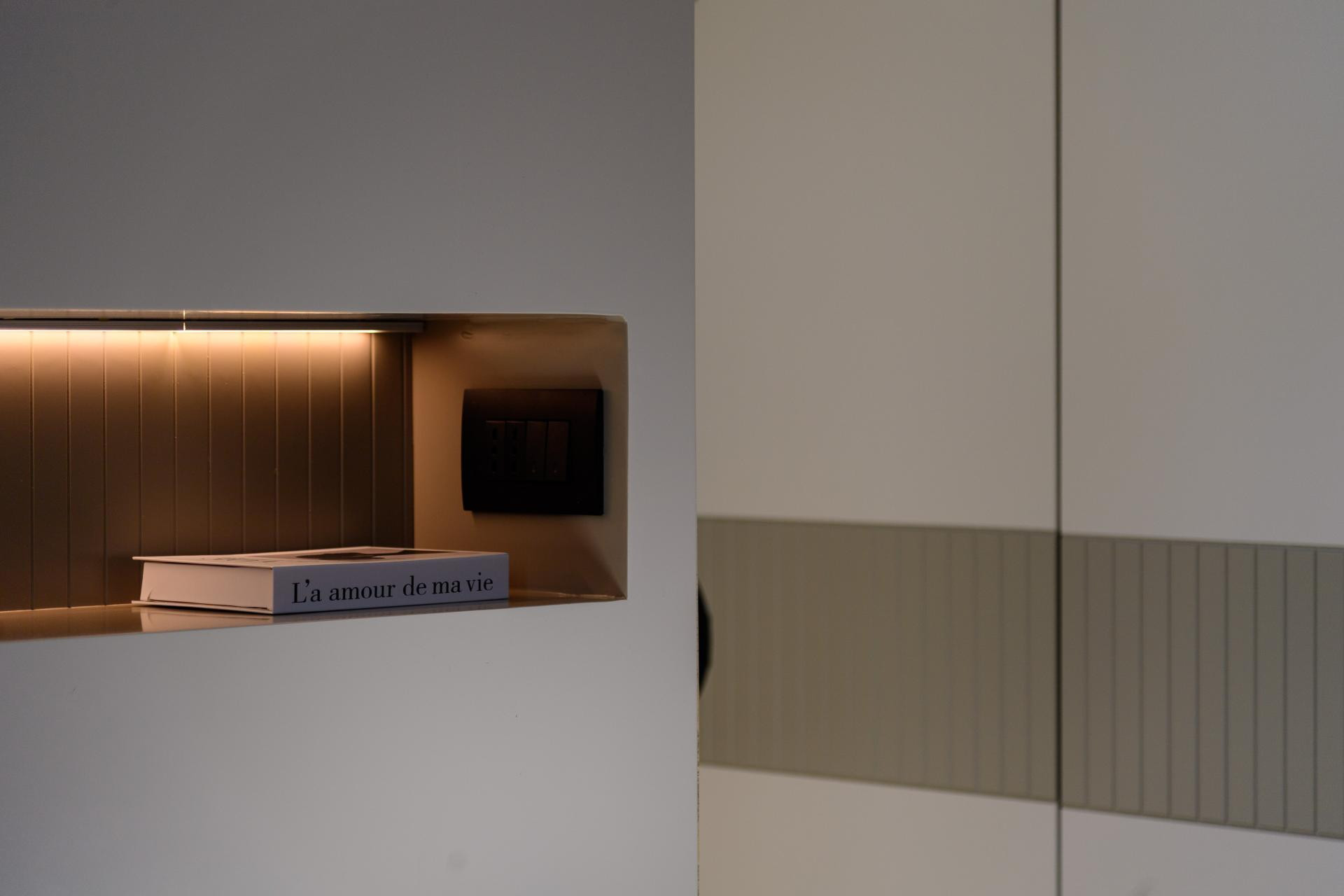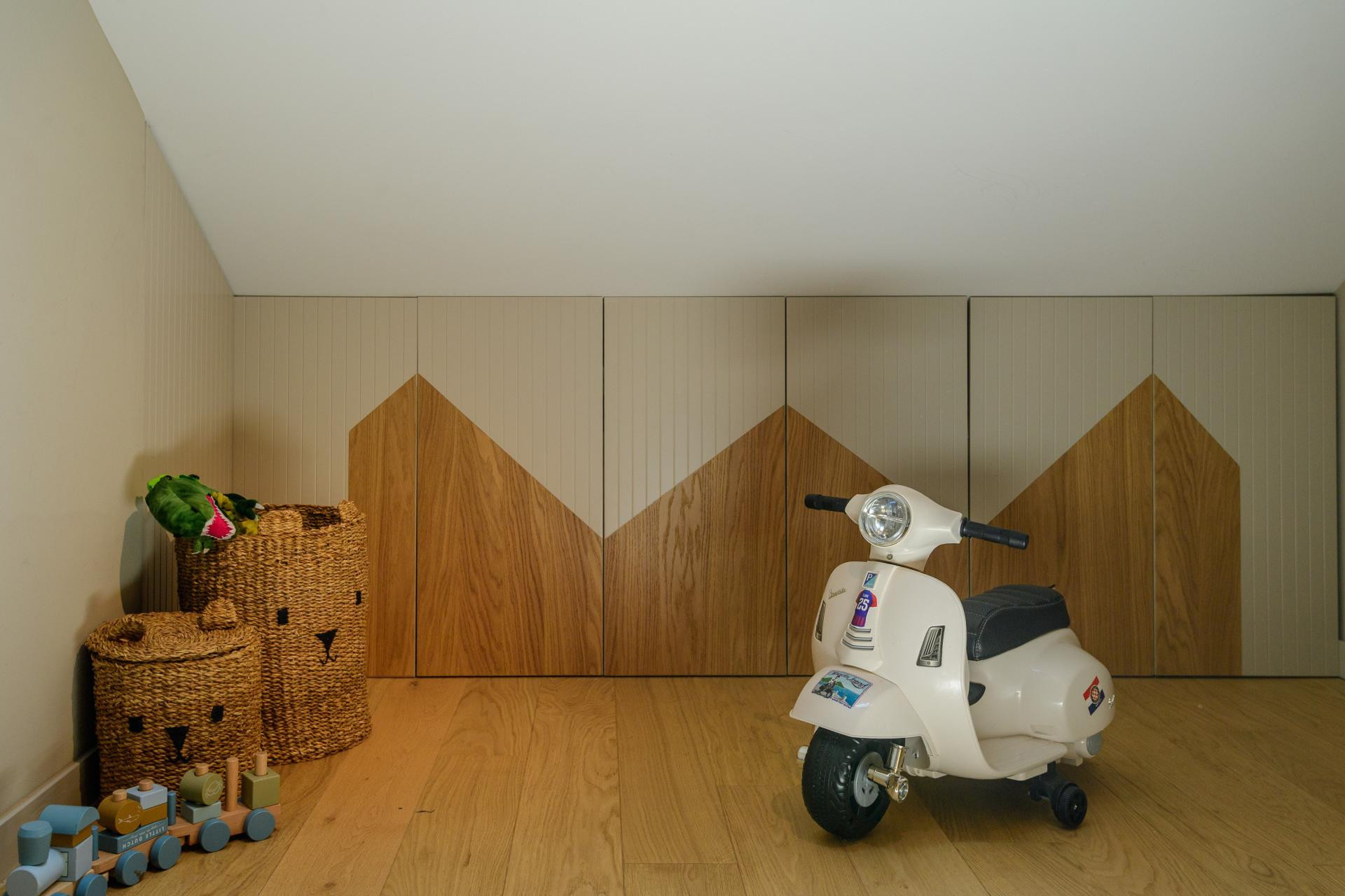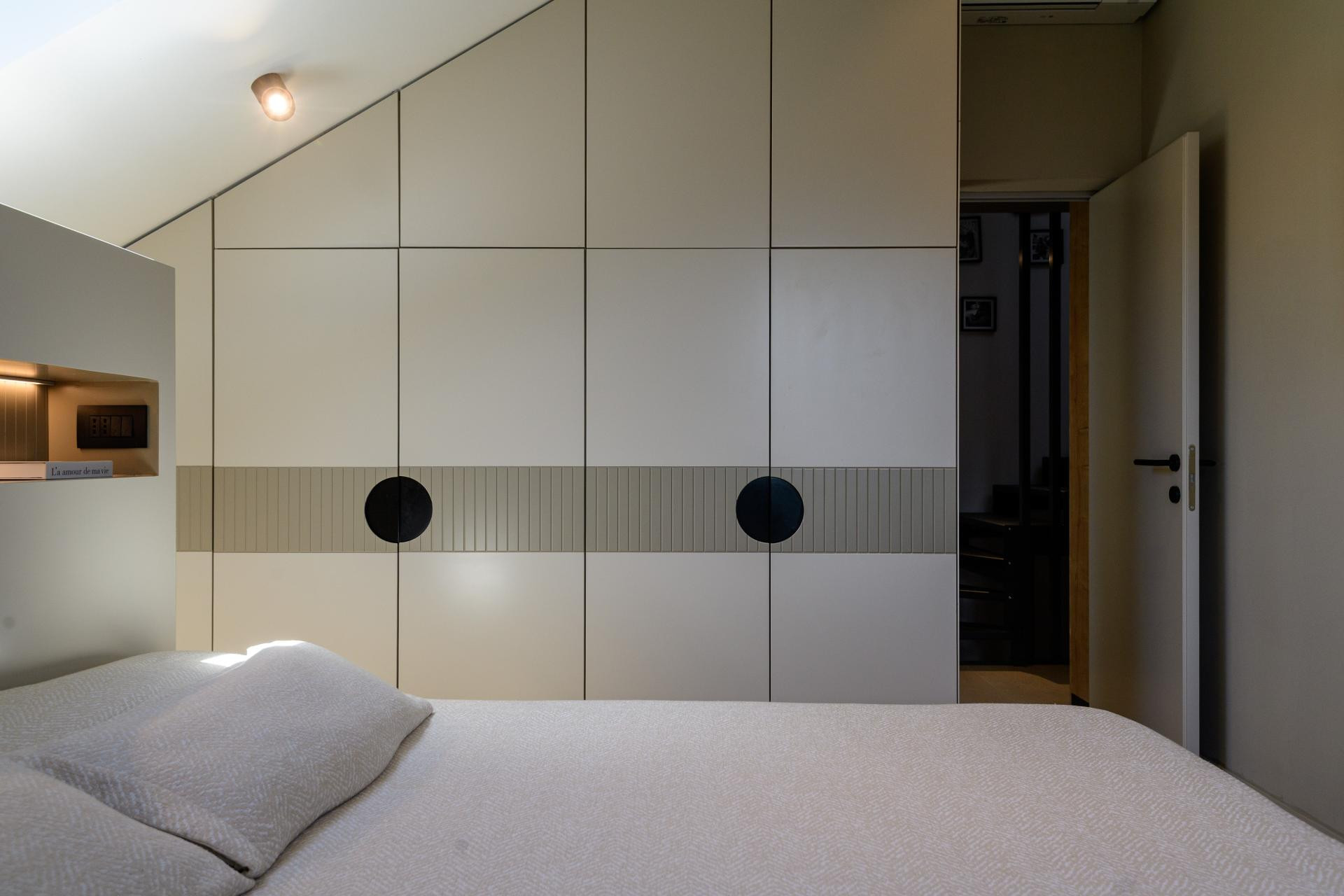 Većina je namještaja, kao i u većini interijera u kojima se želi dobiti maksimalna funkcionalnost i iskorištenost prostora, izrađena po mjeri. Ovdje je to bilo nužno i s obzirom na arhitektonske zahtjeve potkrovlja. Pratila se svaka kosina i iskorištavao svaki centimetar, osobito u spavaćim sobama gdje su ormari rađeni do stropa, pa čak i ispod kreveta. Jedini gotovi elementi su, zapravo, sofa i stolice, a svi ostali komadi su dizajnirani i izrađeni u skladu s prostorom.