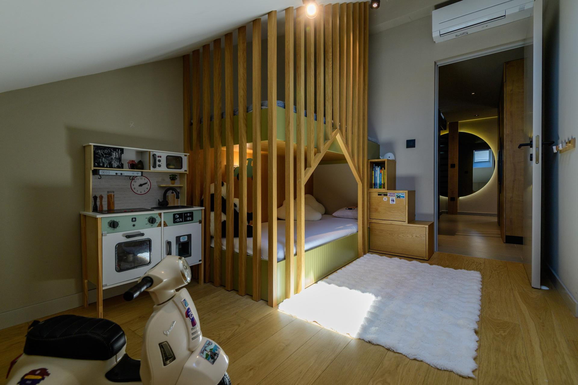 Na početku je stan bio zamišljen kao jednoetažni, no uvidjevši puni potencijal visine pod kosim krovom, odlučeno je da se ipak ugradi galerija. Ta je odluka na kraju donijela ključnu razliku. Fizički i vizualno podijeljena, ali funkcionalno povezana, galerija je postala nova dnevna zona stana koja je zapravo višenamjenski prostor za opuštanje, druženje, dječju igru i povremeno spavanje u jednom.