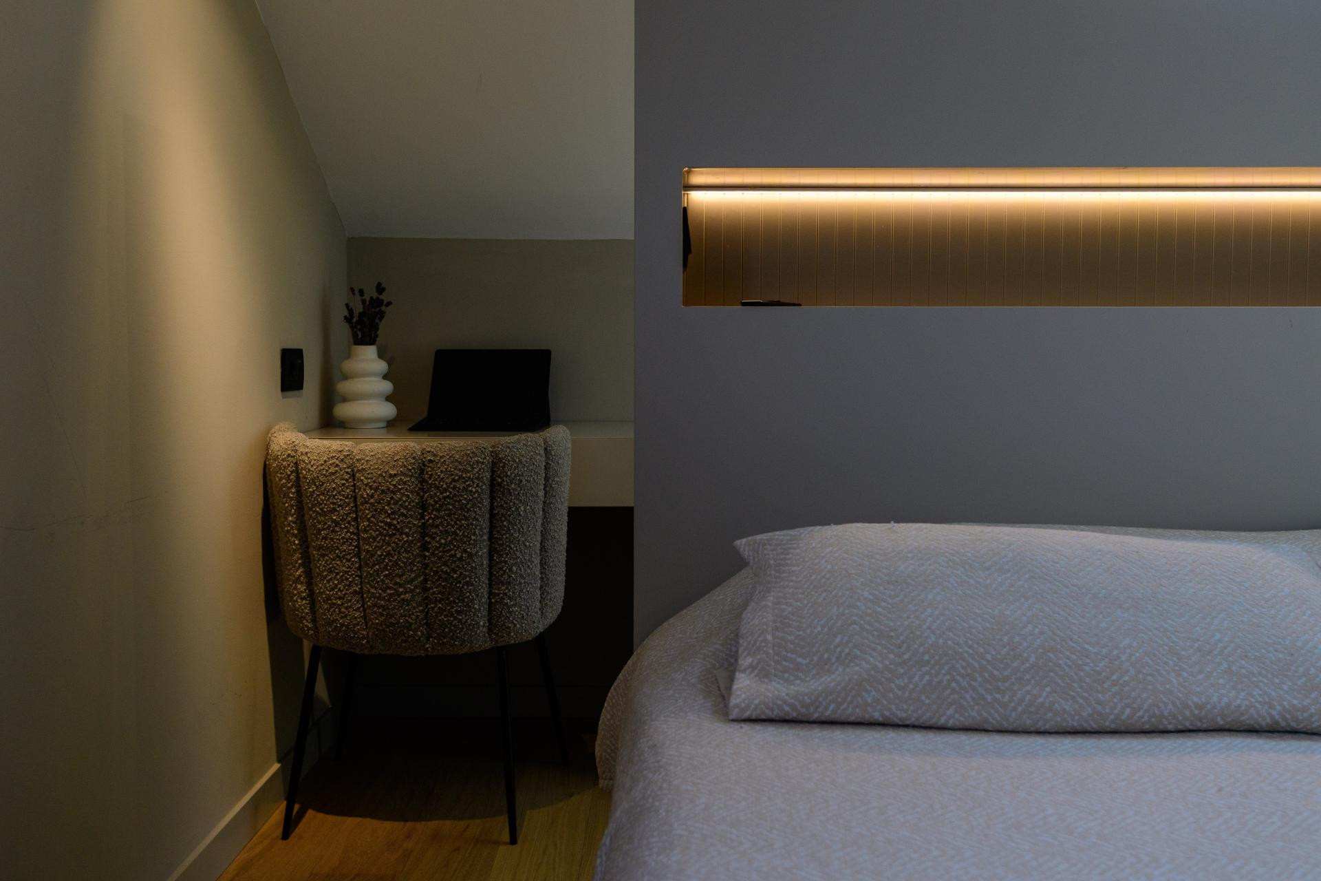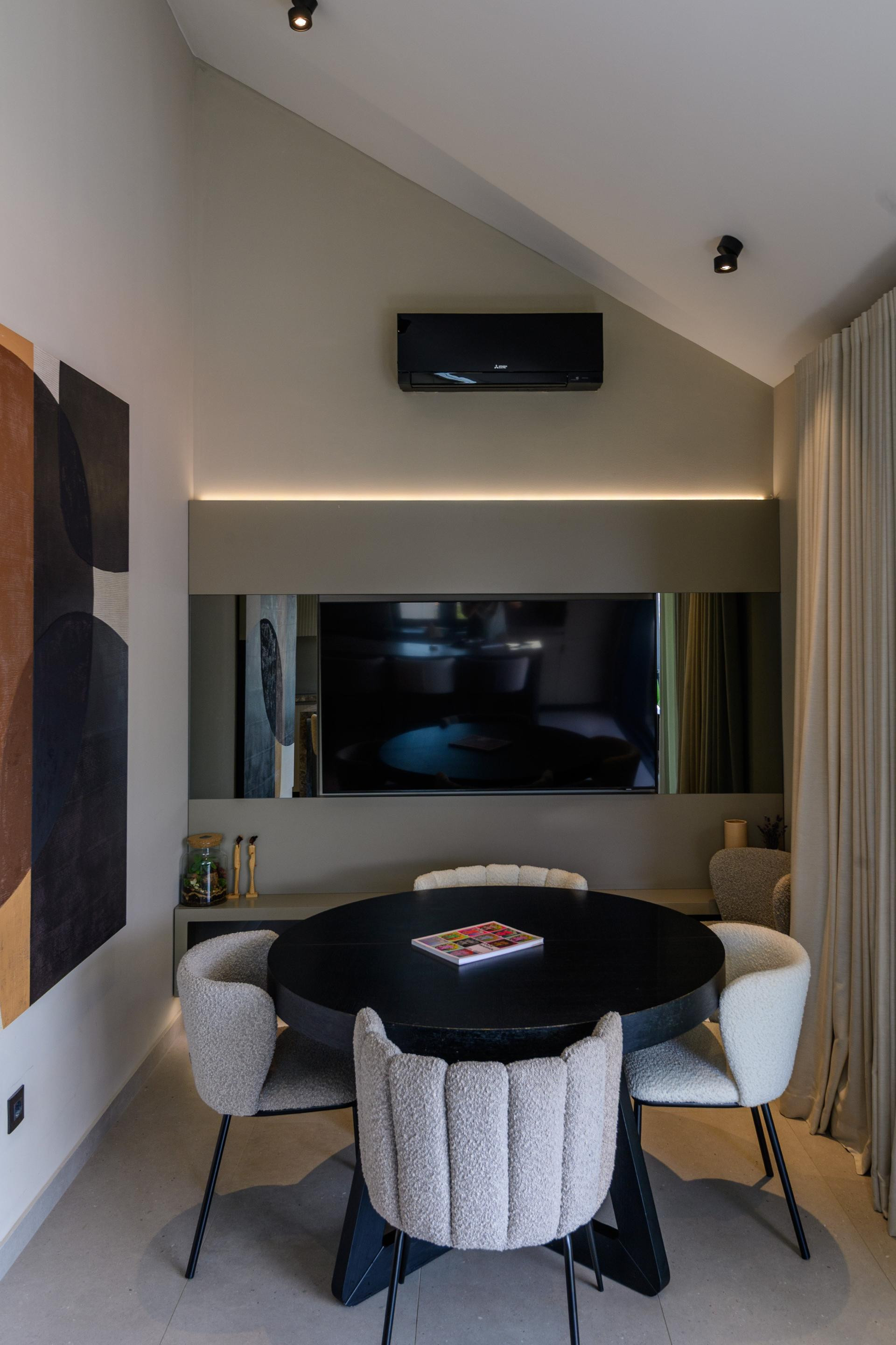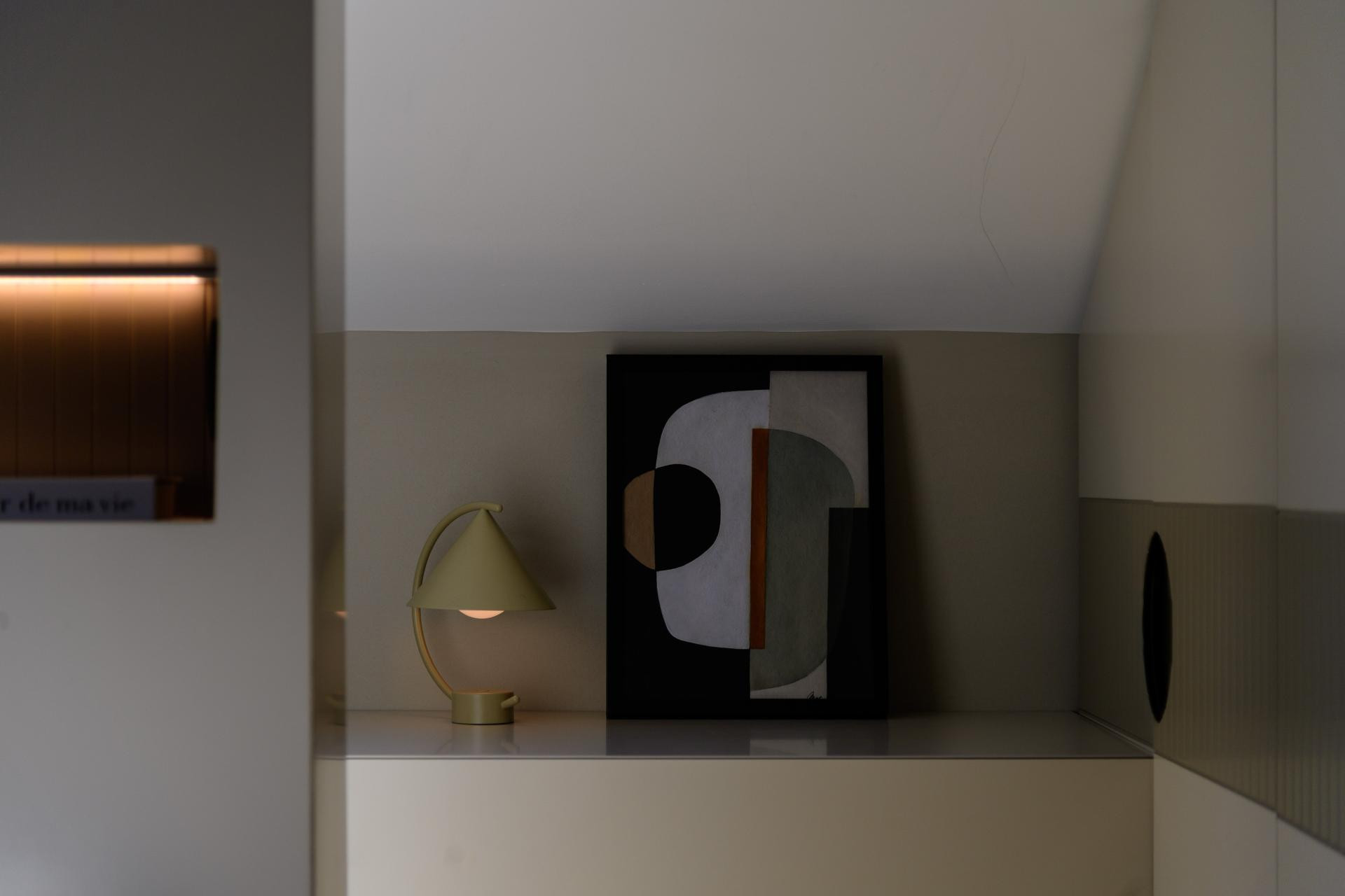 S obzirom na isprekidani tlocrt i kosine krova, stil uređenja je minimalistički, ali ne i strog. Stan nosi različite dizajnerske utjecaje i u svakom detalju svjedoči osobni pristup.