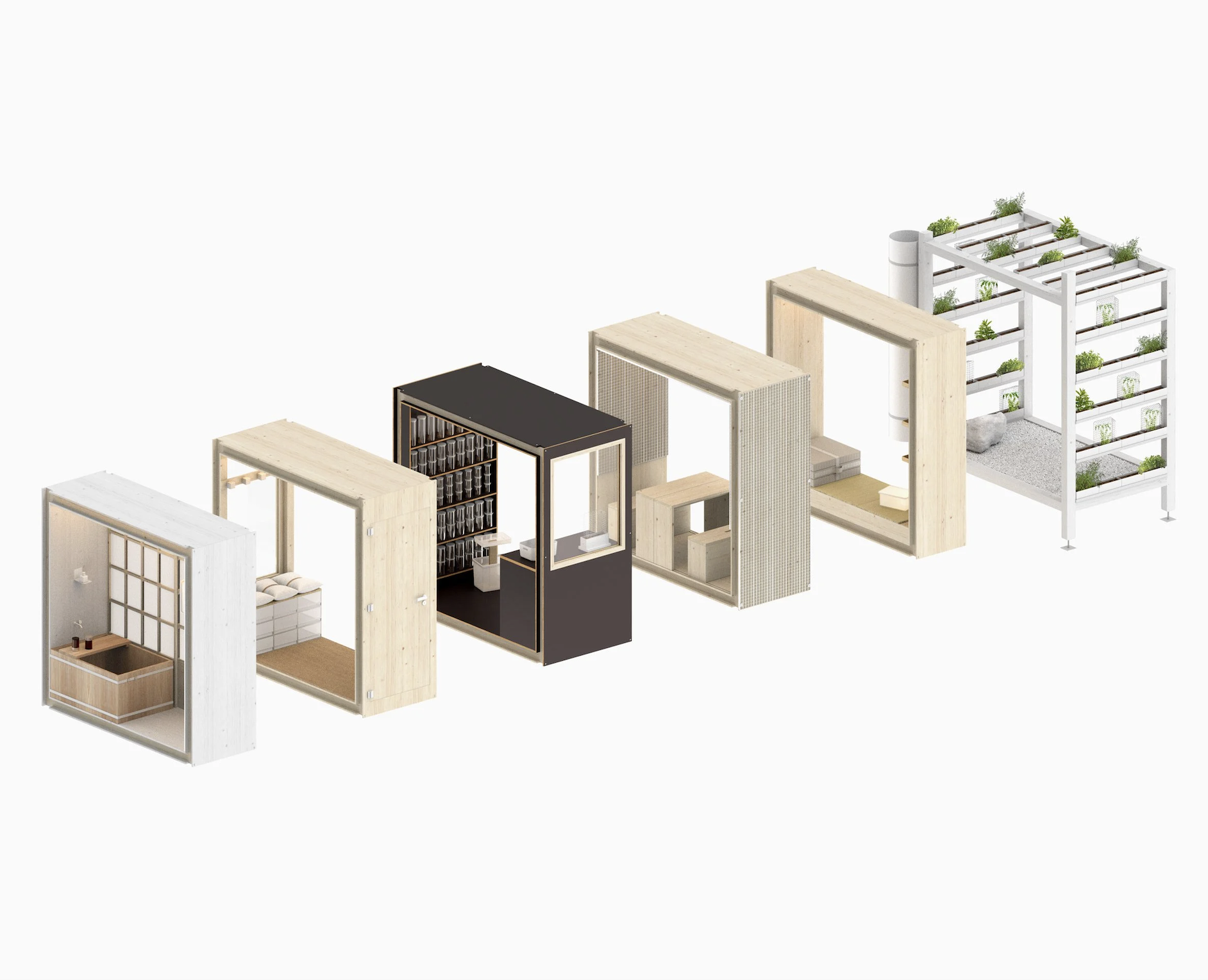 Manifest kuća sastoji se od pet modularnih “kriški”, izrađenih od recikliranih materijala, uključujući reciklirane tekstile za izolaciju. Dizajn uključuje bijeli krov otporan na toplinu i sustav za skupljanje kišnice, čime se naglašava predanost održivosti. Unutrašnjost je opremljena pažljivo odabranim MUJI proizvodima, koji zajedno stvaraju skladan i funkcionalan prostor.