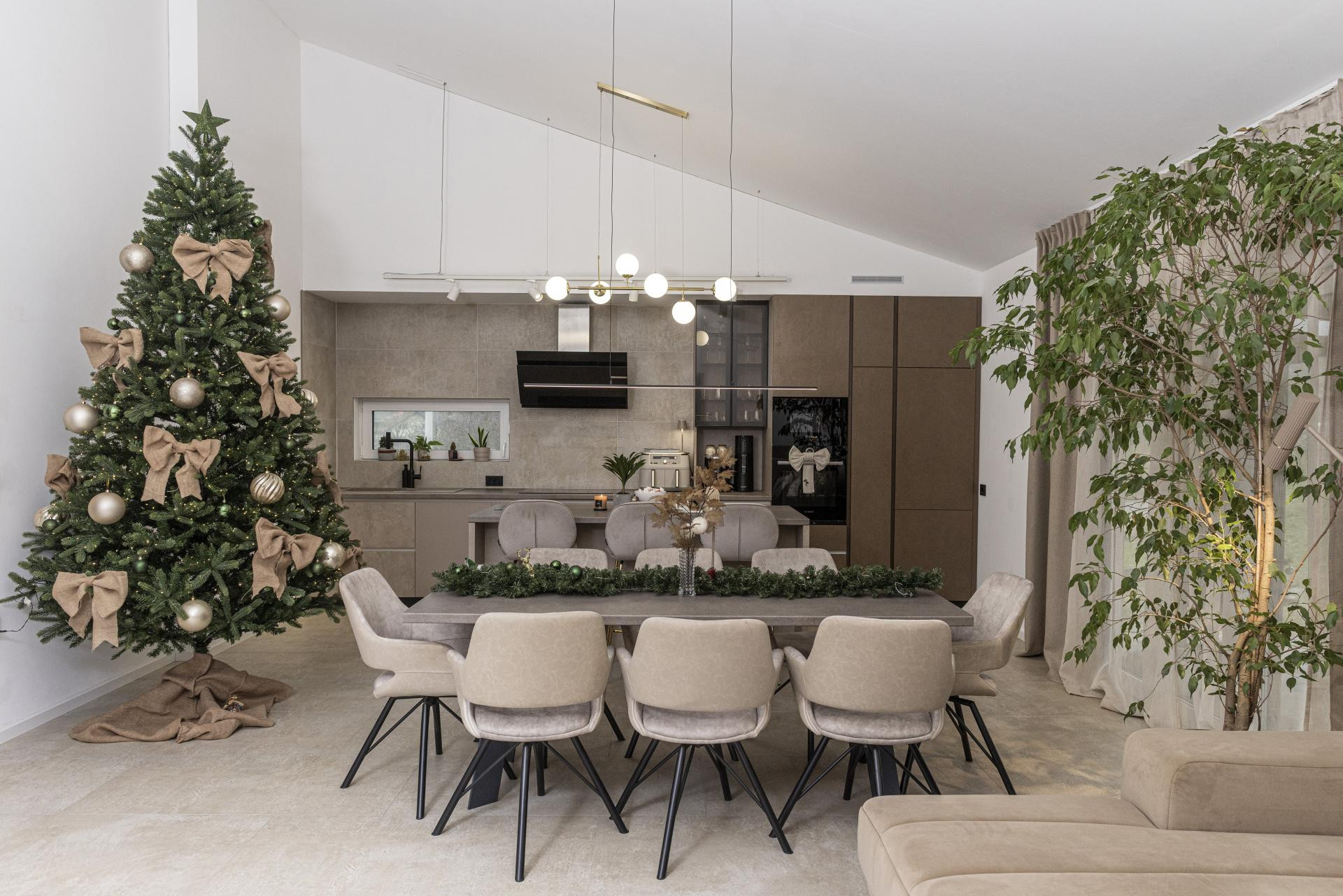 Unutrašnjost kuće prilagođena je svakodnevici mlade obitelji: prostrani open space povezuje dnevni boravak i kuhinju, dok tri spavaće sobe, kupaonica, dodatni WC i tehnička soba čine funkcionalan i ugodan životni prostor. Doris je interijer osmislila sama, prateći smirujuću paletu tonova i kombinirajući namještaj po mjeri s gotovim komadima, uz planove za daljnja uređenja poput male galerije i radne sobe.