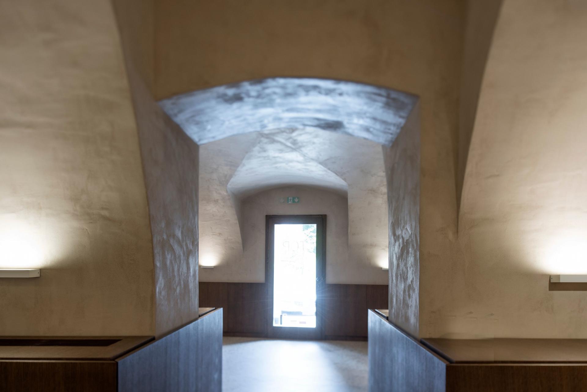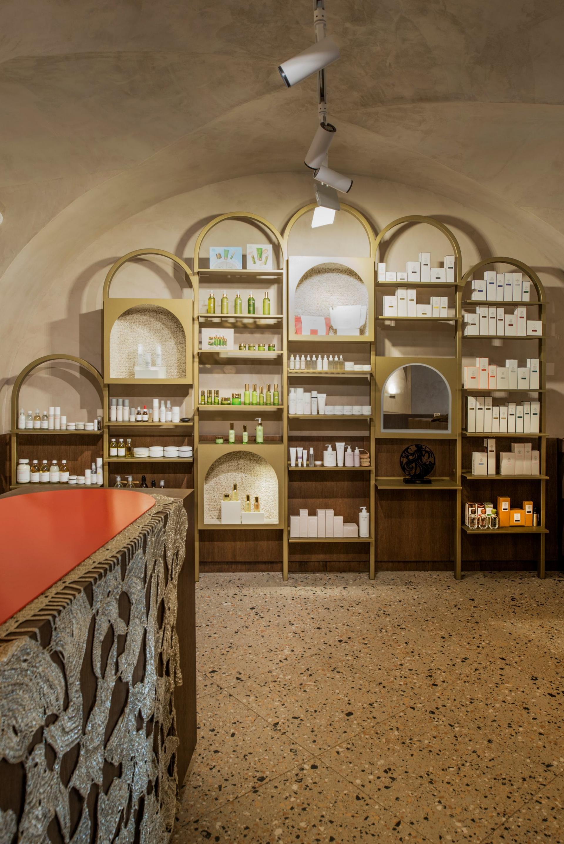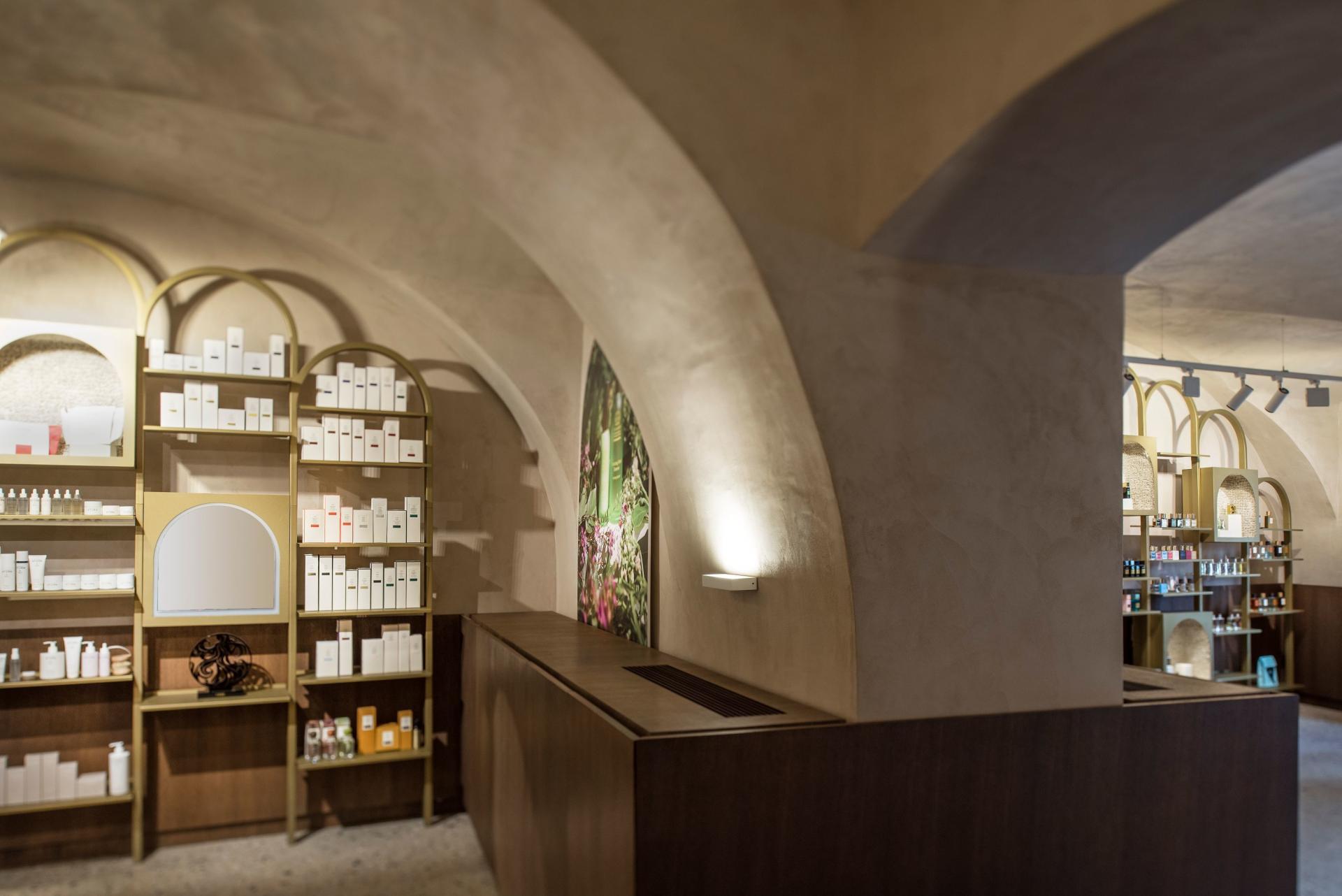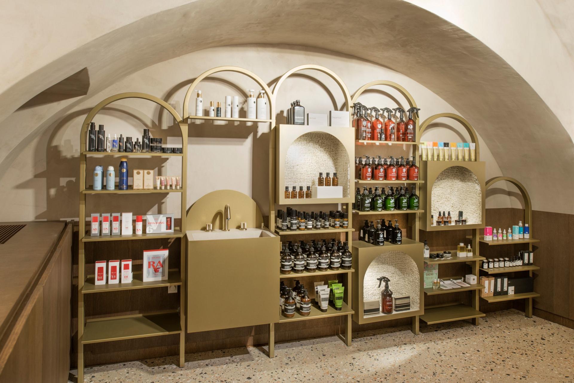 Aspekt odabira materijala i tonaliteta bazira se na prirodnim, suptilnim smjernicama poput drvene ovojnice, toniranja zidne plohe betonskim premazom, terrazzo podnog opločenja ili pak detalja ispuna od vunenog tepiha stavljajući sav naglasak i pažnju na metalne police zlatnoga tona sa stalnim postavom pripadajućeg asortimana.