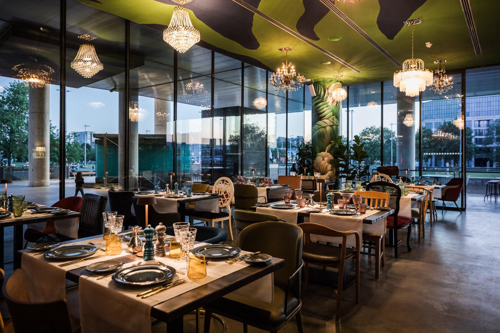 Od prvog koraka u prostor jasno je da se ovdje igra na visoku estetiku i još viši doživljaj. Sve je koloristički razigrano i promišljeno, onako kako zaslužuje prostor Muzeja suvremene umjetnosti. Inspiracija za uređenje došla je iz samog muzeja – spoj prirode i diska, maksimalizam u punom sjaju. Uz Marina Medaka, za vizualno oblikovanje prostora zaslužan je slikar Hrvoje Majer. Zidovi pričaju priče, evociraju poznate motive suvremene umjetnosti, a raskošna rasvjeta kreira atmosferu za uživanje. Ništa ovdje nije slučajno, a opet sve izgleda kao da se dogodilo samo od sebe, uz šarmantnu dozu kaosa. Stolice su sve različite – Marin Medak ih je sam tražio po sajmovima diljem Europe i svaka ima svoj karakter.