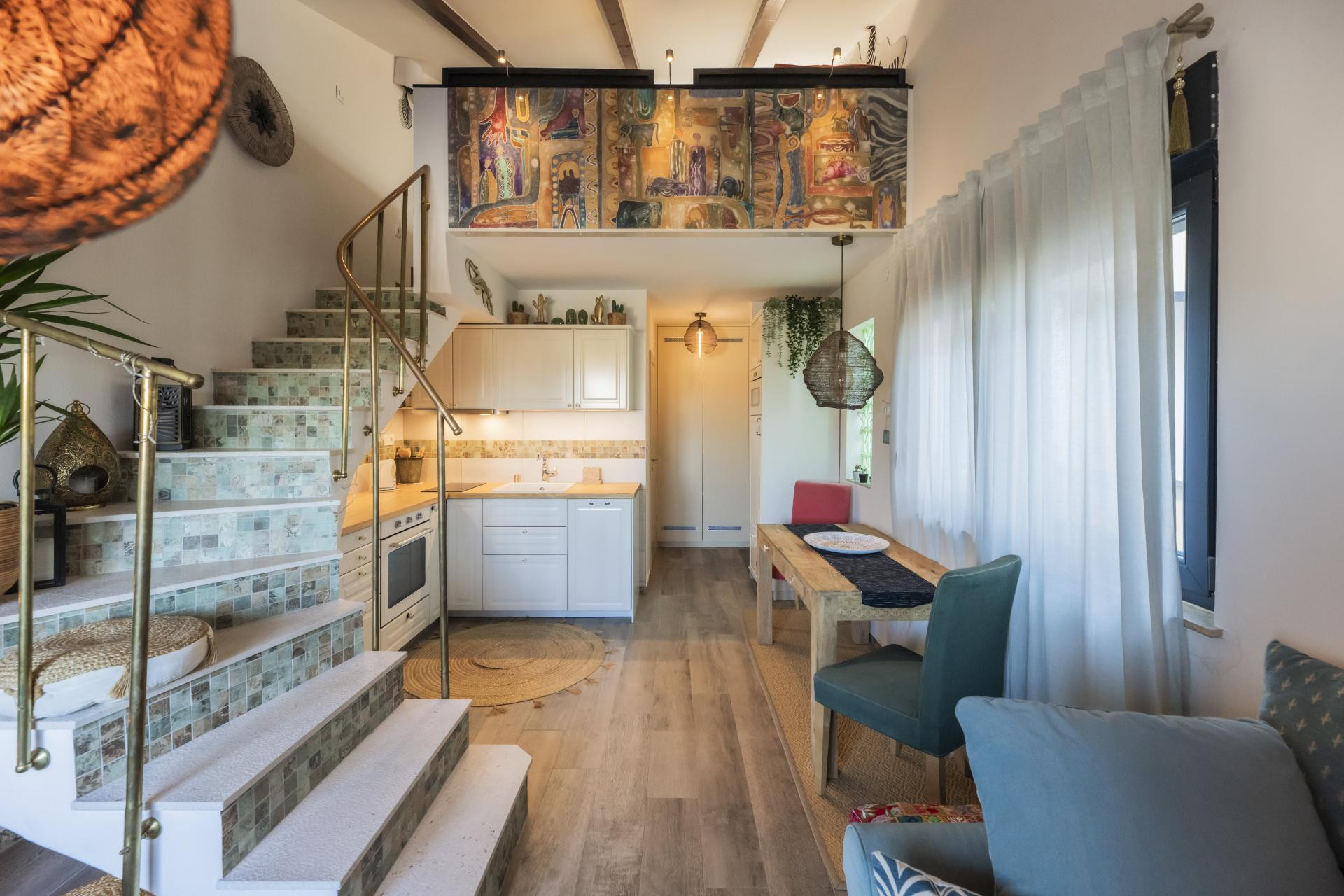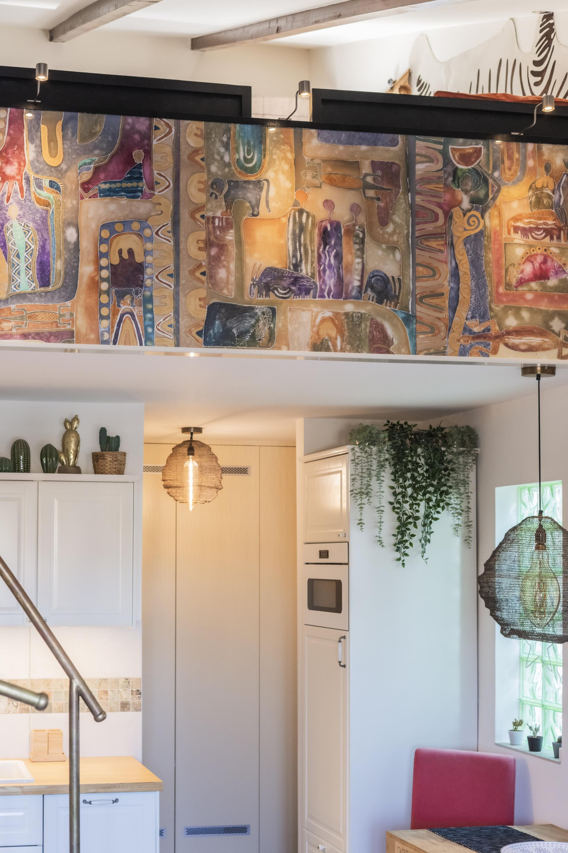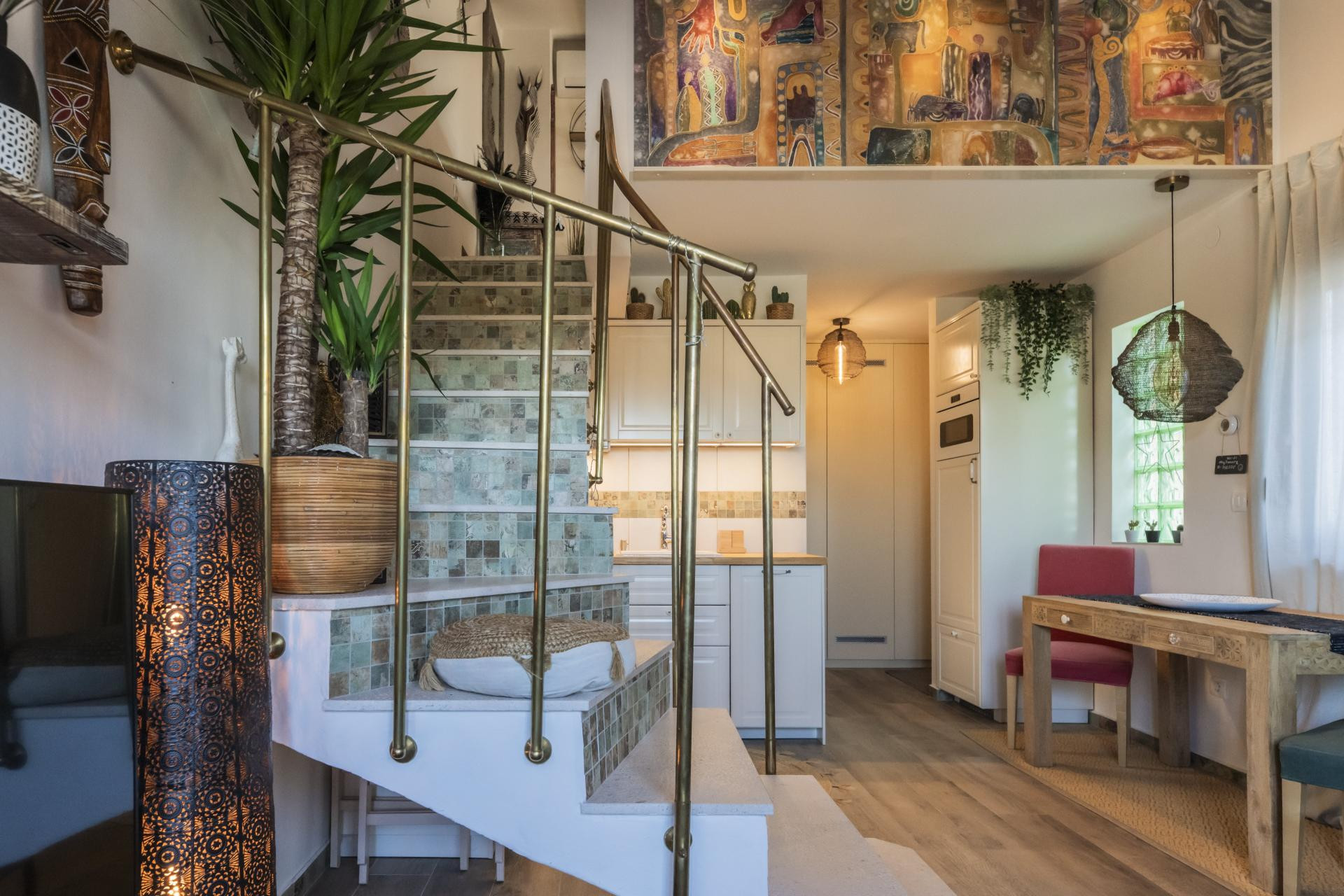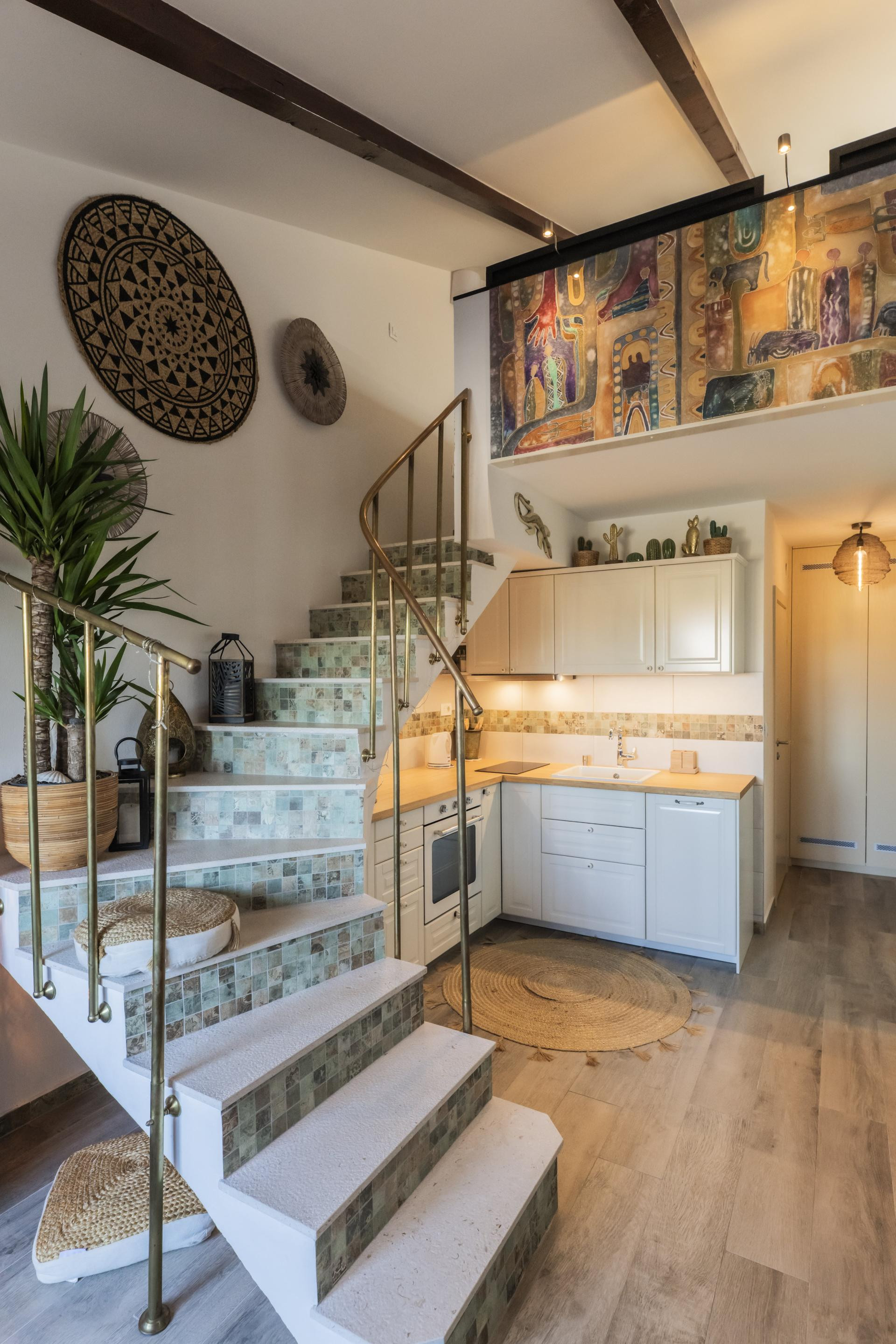 Primjerice, stepenište do galerije na kojoj je smješten spavaći dio pažljivo je oblikovano "u milimetar" kako bi funkcionalno podijelilo prostor da ispod njega stane kuhinja, a da ostane dovoljno prostora za dnevni dio. Zatim, iza ulaznih vrata nenametljivo je ugrađen veliki bijeli ormar od poda do stropa koji je, osim za pohranu stvari i obuće, odlično poslužio i za izmještanje bojlera iz kupaonice uređene u boho stilu u kojoj se, osim šarenih pločica, ističu drveni detalji, prozirno sedefasti umivaonik i ogledalo s orijentalnim okvirom i rasvjetom.