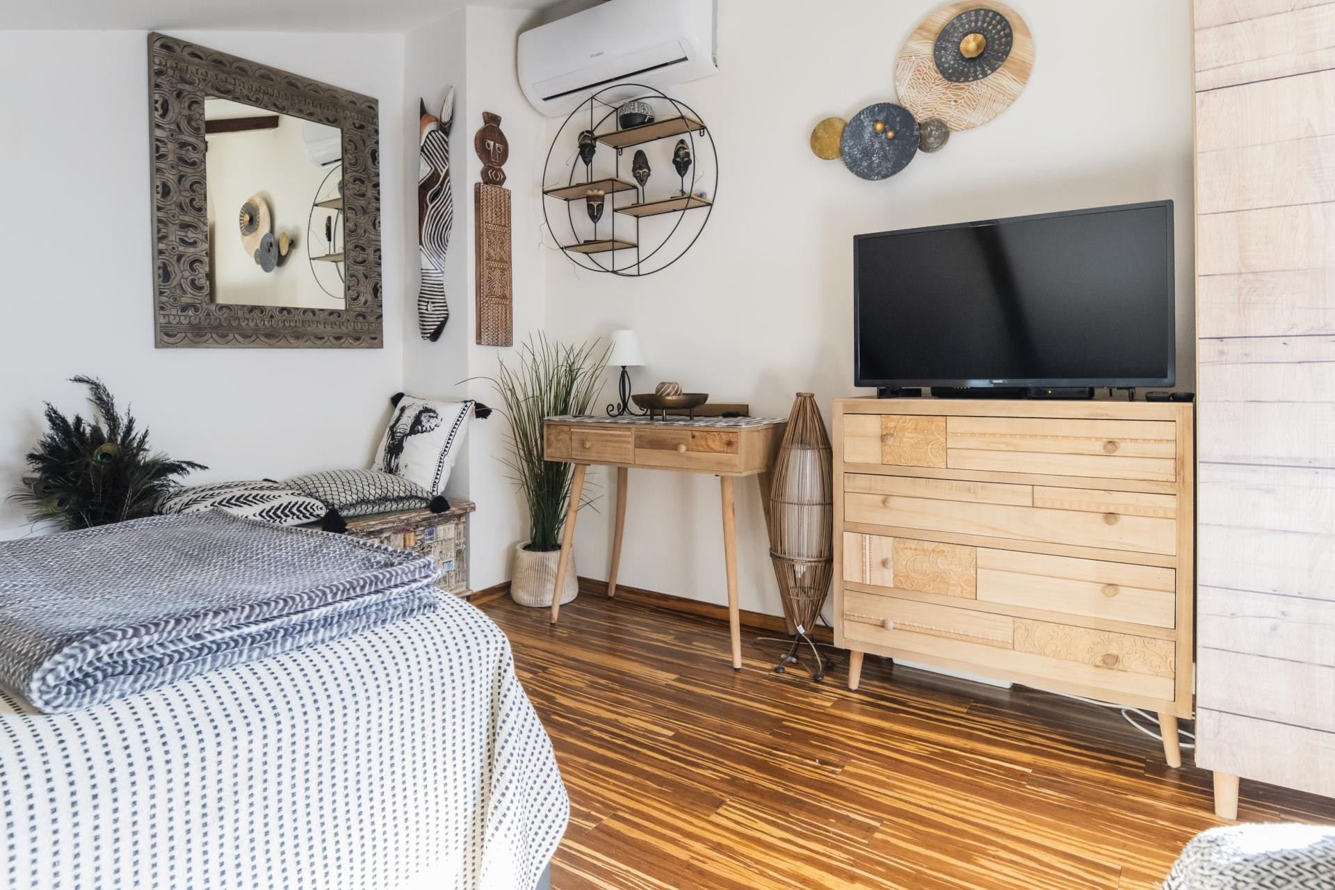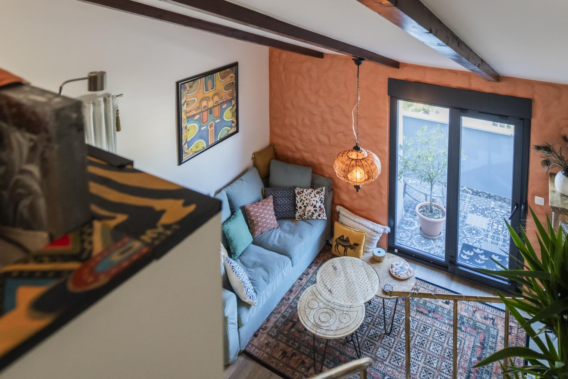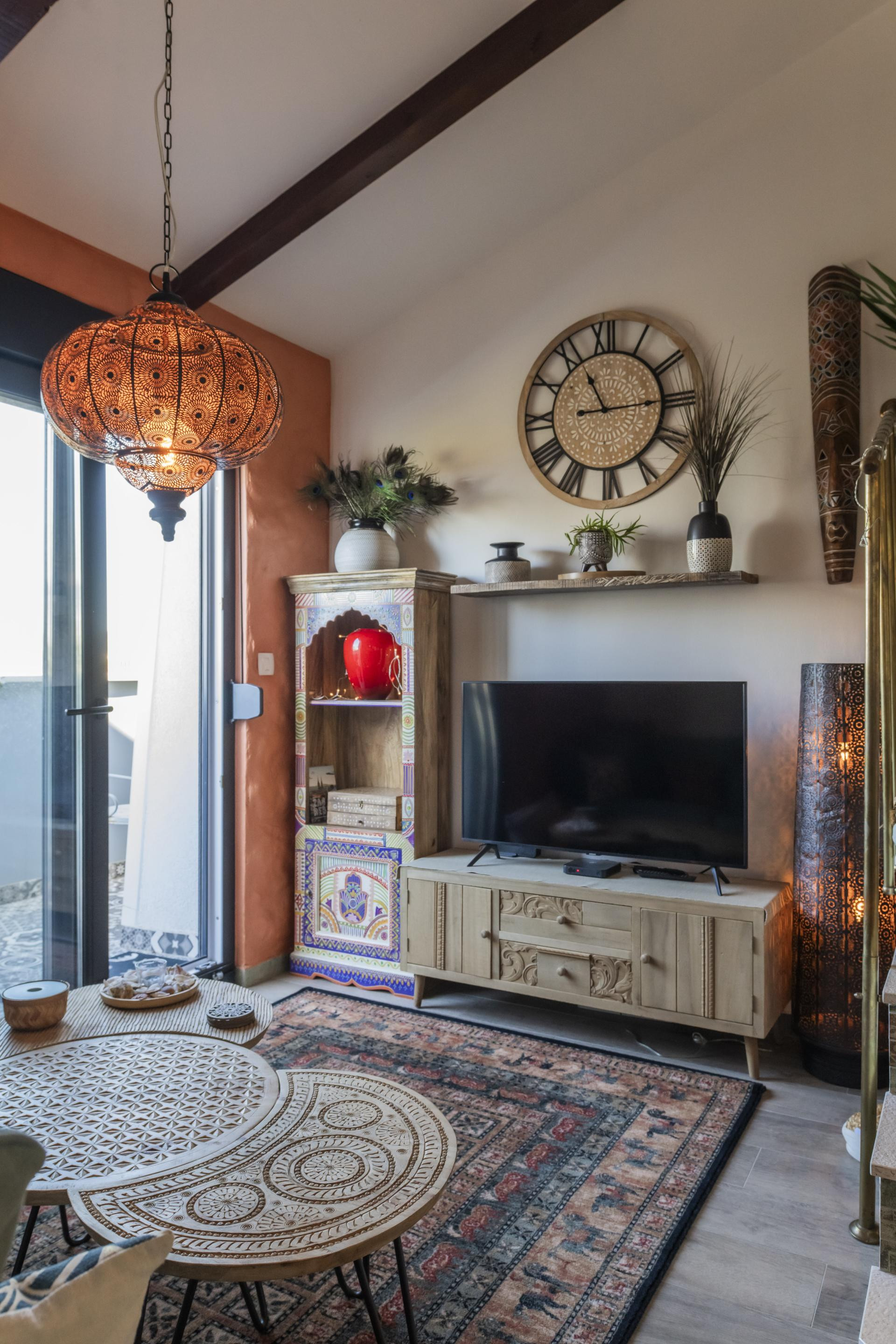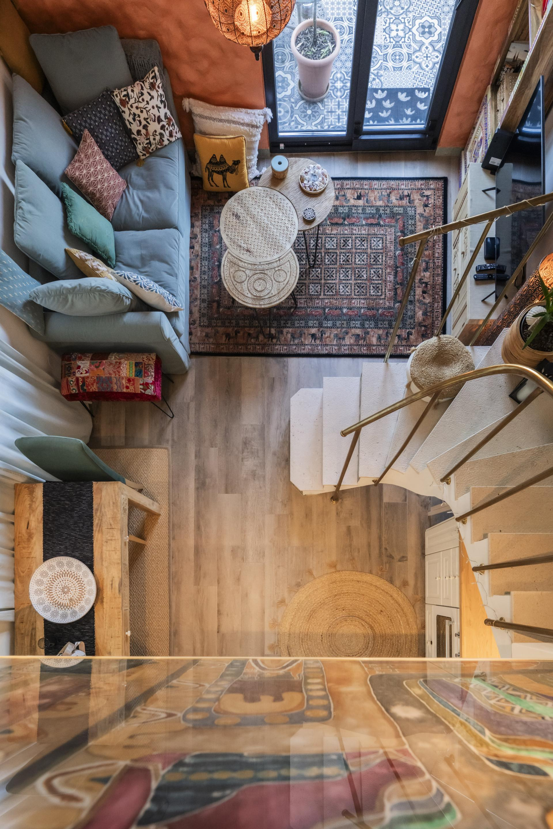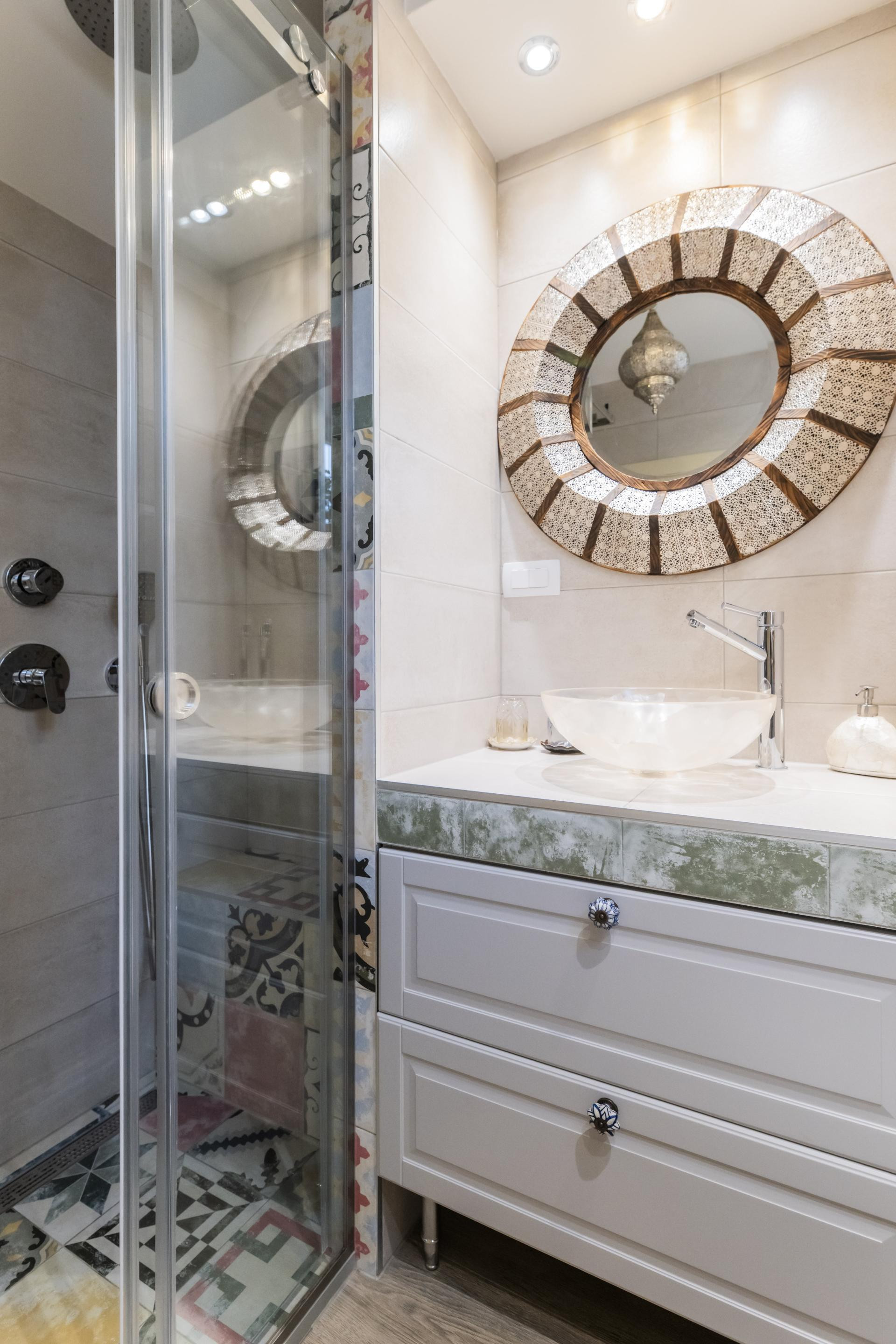 Primjerice, stepenište do galerije na kojoj je smješten spavaći dio pažljivo je oblikovano "u milimetar" kako bi funkcionalno podijelilo prostor da ispod njega stane kuhinja, a da ostane dovoljno prostora za dnevni dio. Zatim, iza ulaznih vrata nenametljivo je ugrađen veliki bijeli ormar od poda do stropa koji je, osim za pohranu stvari i obuće, odlično poslužio i za izmještanje bojlera iz kupaonice uređene u boho stilu u kojoj se, osim šarenih pločica, ističu drveni detalji, prozirno sedefasti umivaonik i ogledalo s orijentalnim okvirom i rasvjetom.