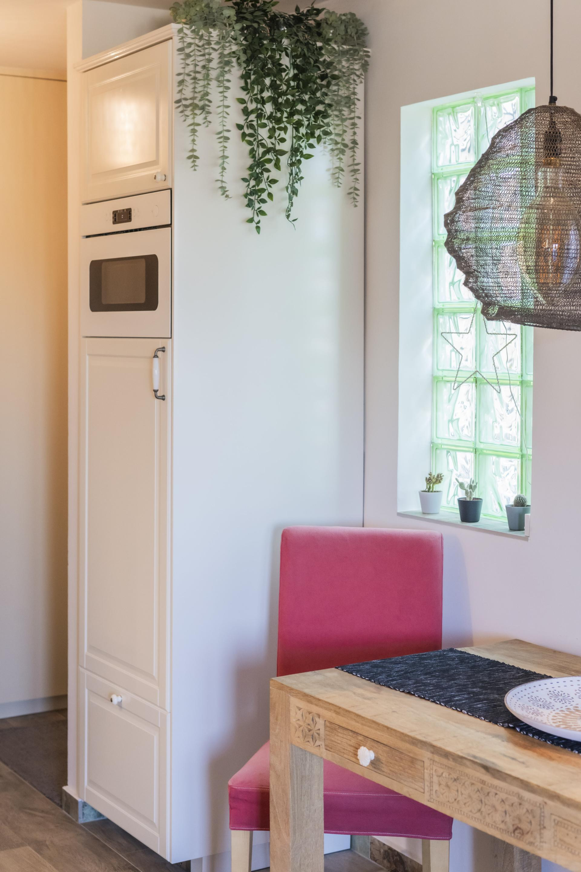 Odličnog se rješenja ova kreativna vlasnica dosjetila i na prijelazu iz malenog hodnika u dnevni prostor. Tu je, iz iste IKEA linije u kojoj je dala napravili kuhinju retro stila u zagasito bijeloj nijansi, podigla i ormar u koji su nenametljivo ugrađeni frižider i mikrovalna pećnica.