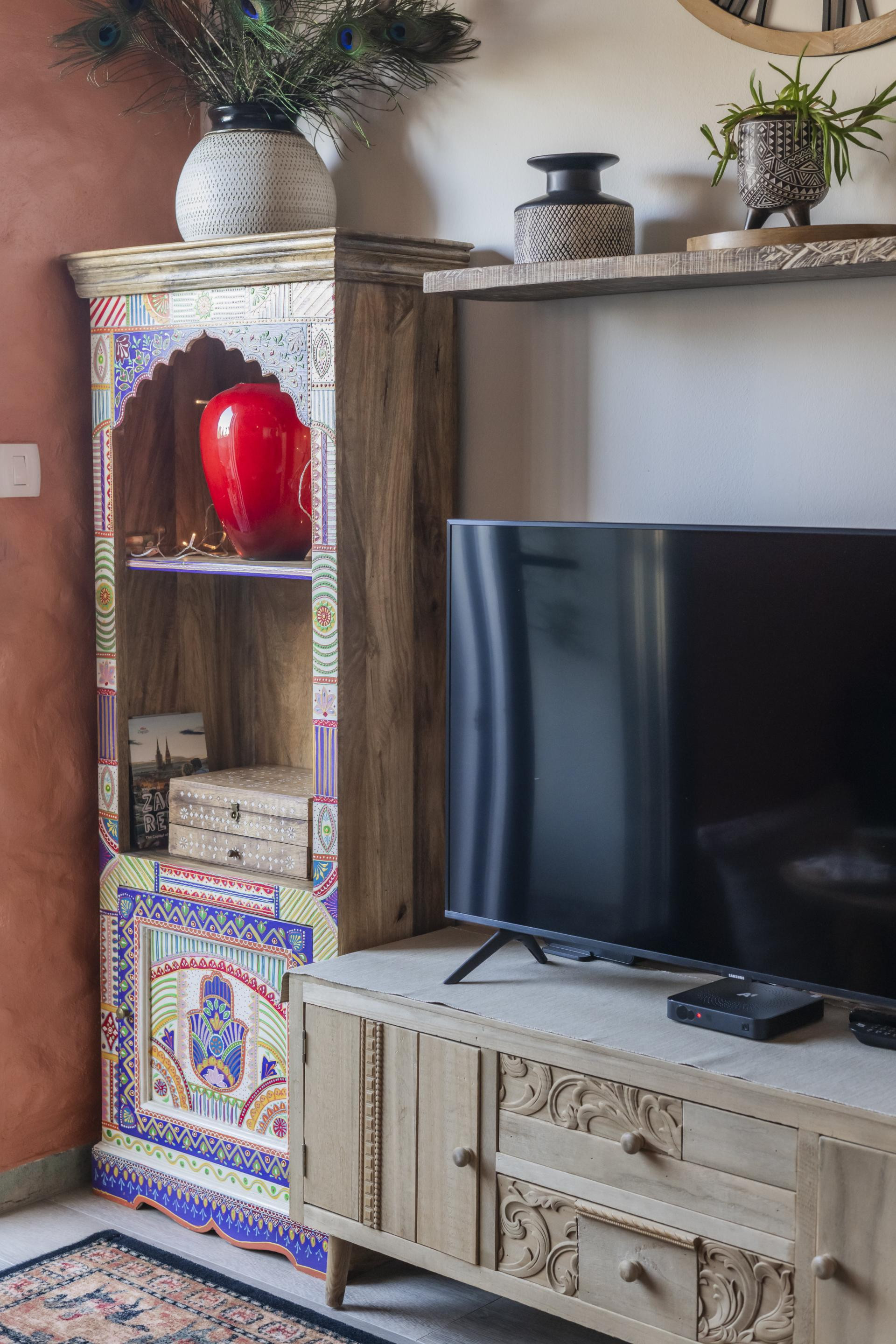- Komoda za TV je iz iste linije kao i ormarić u kupaonici, a nabavila sam ju u istoj internetskoj trgovini u kojoj i ovaj visoki šareni ormar od punog drveta manga čija je obrada zapravo ručni rad. Tepih od čiste vune je iz kolekcije Nomad, rađen po uzoru na orijentalni, a polica iznad televizije je zapravo zidni dekor koji sam kupila na jednom od putovanja Afrikom. Primijetit ćete da ima rupice za zid s donje strane jer je predviđen kao ukras, no ovako mi se učinilo zgodnijim - smije se Nives.