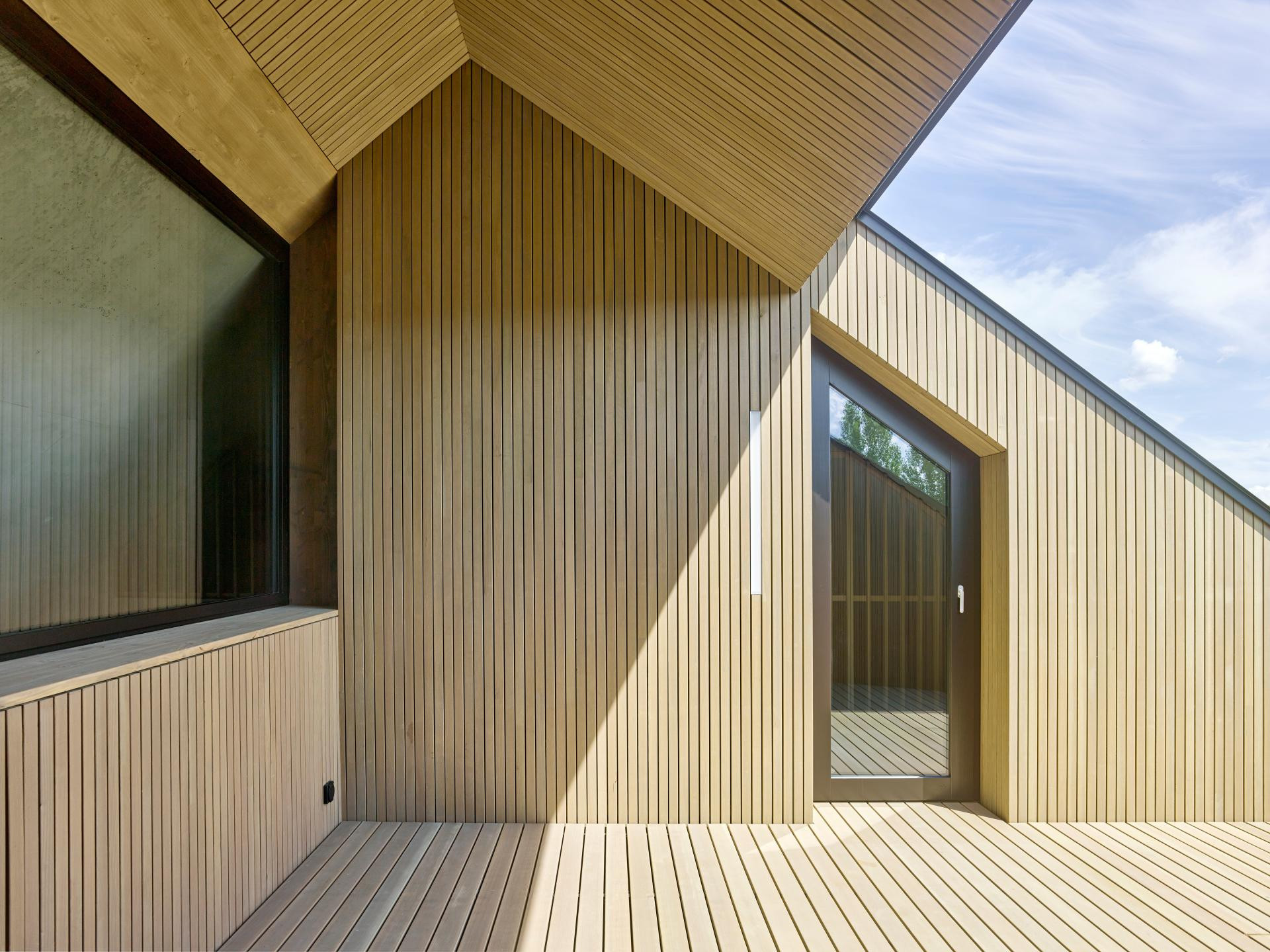 Fasade odišu jednostavnošću i homogenim izrazom, svih šest strana tretirano je jednako, uz suptilne varijacije u otvorima ovisno o orijentaciji. Vertikalne drvene lamele i kosi paneli stvaraju zanimljive svjetlosne igre i dinamične sjene, dajući volumenu živost.