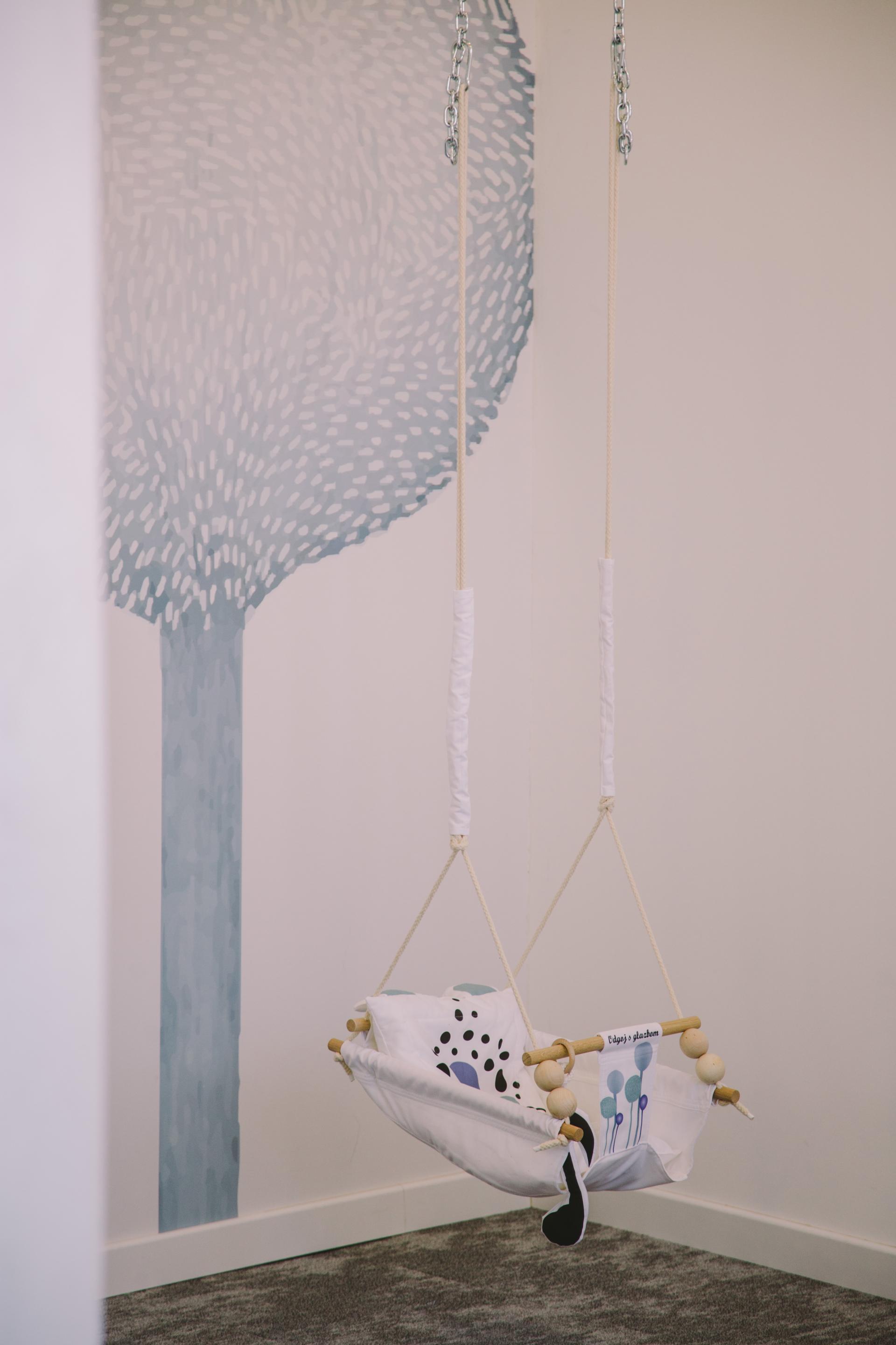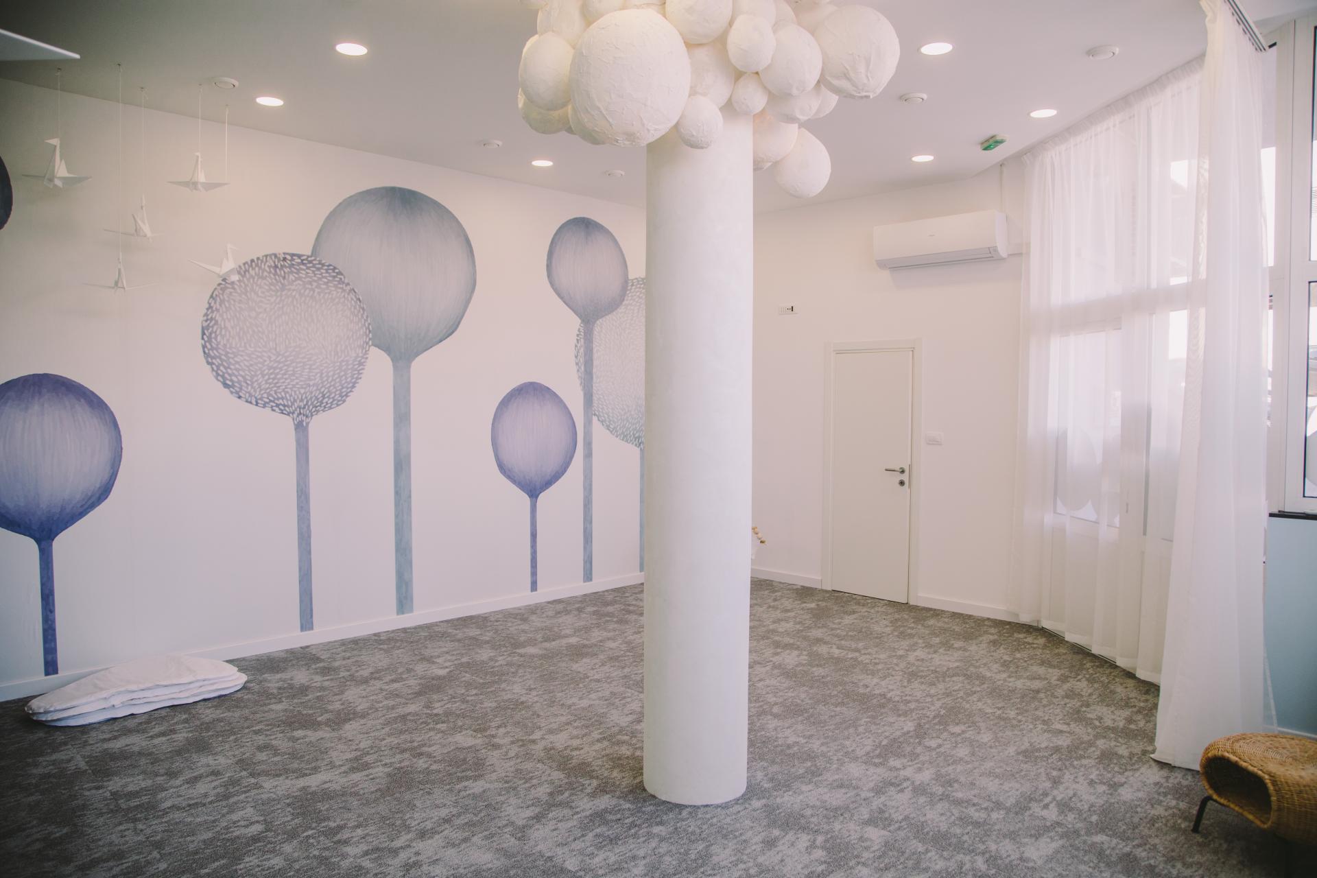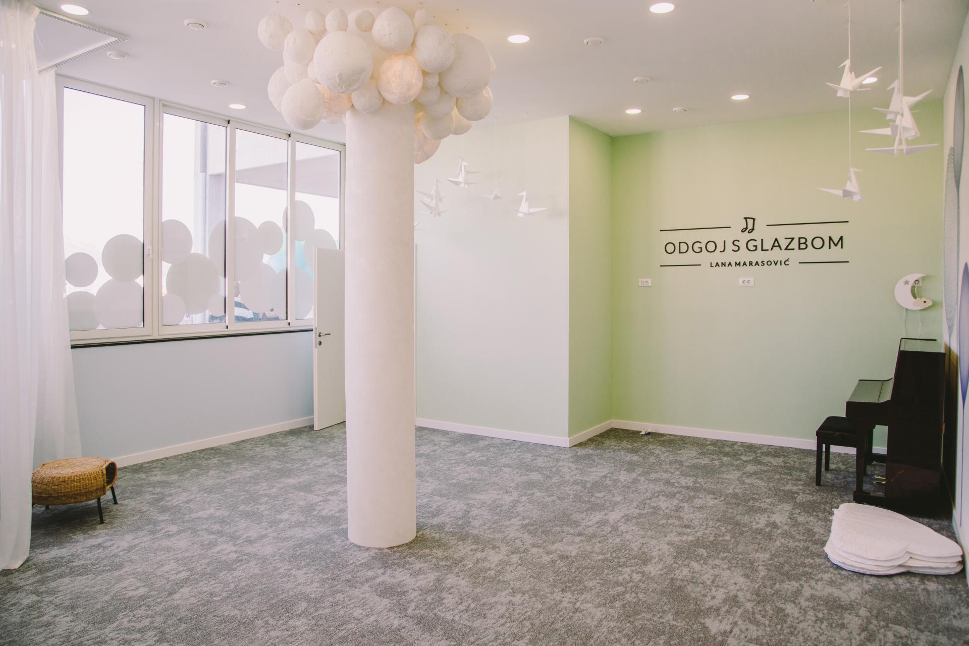 - Na podu nemamo drugih materijala ili komada namještaja osim klavira, jer nam je važno da prostor bude čist i slobodan za dječji pokret uz glazbu. U kutu je intimno mjesto za hranjenje djece, obogaćeno prozračnim baldahinima koji daju dozu luksuza te policom brenda Pinky Kiky na kojoj su pelene i Paluu nepropusne podloge za presvlačenje djece - nabraja. Ističe i instalaciju akademske slikarice Ivone Mustapić Jelavić.