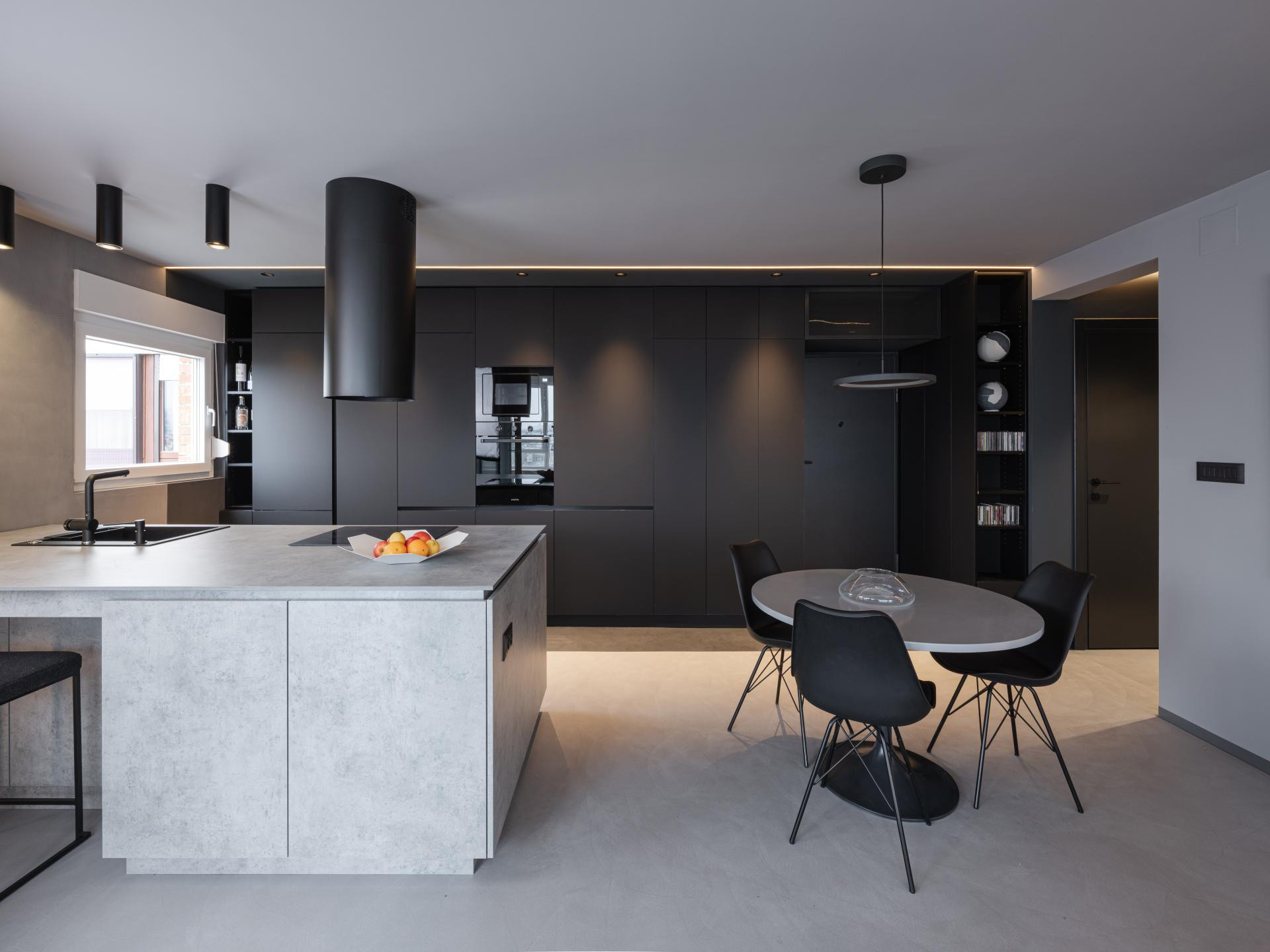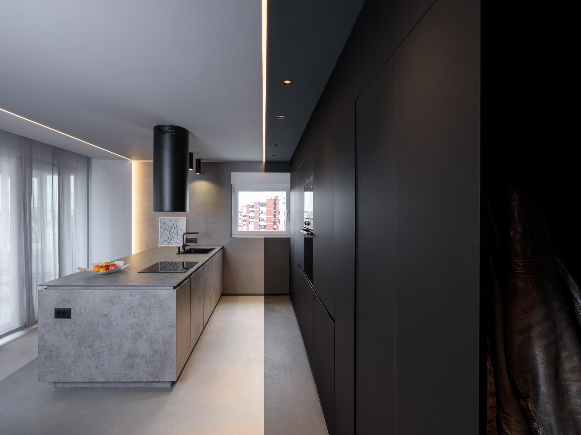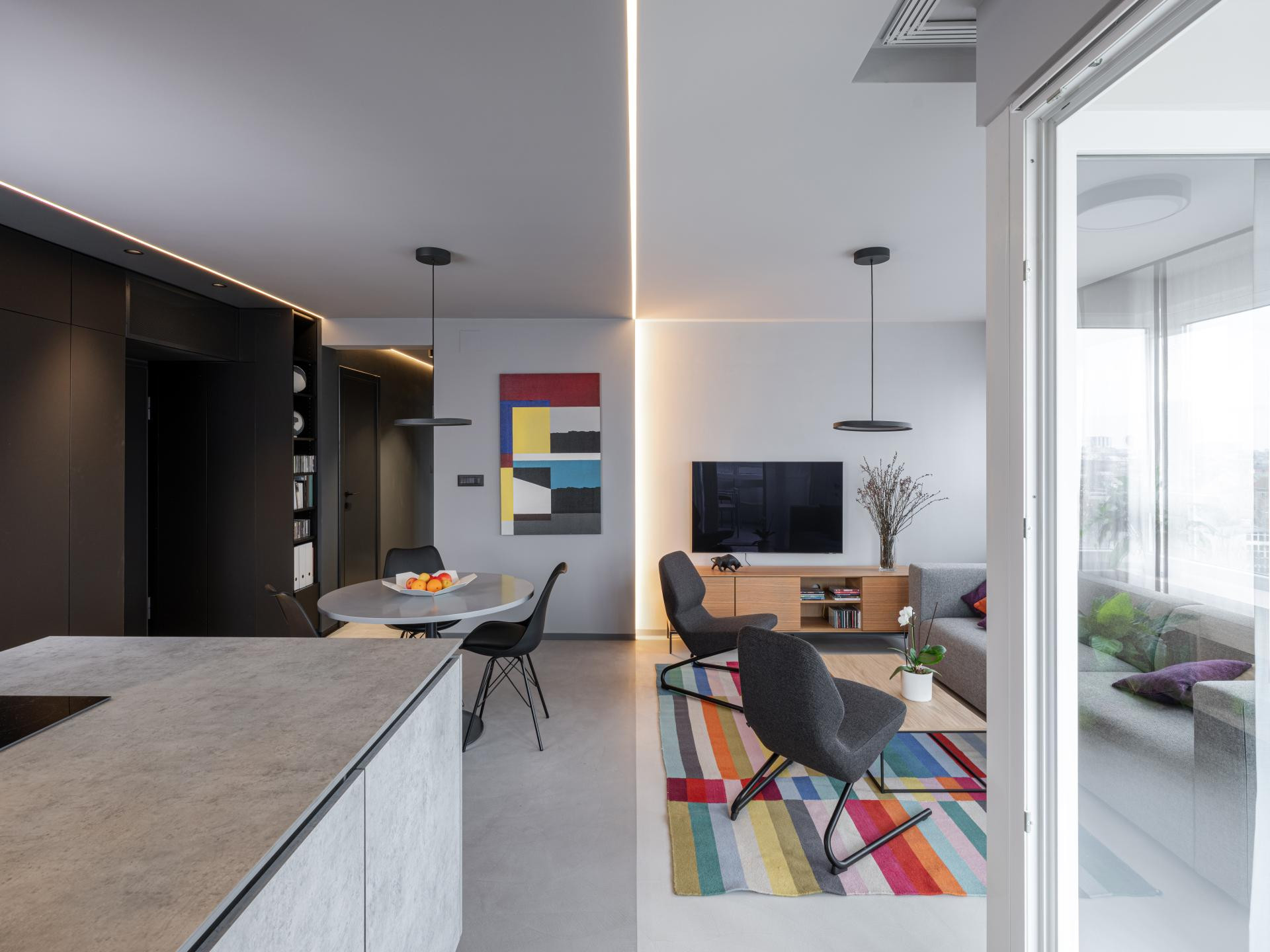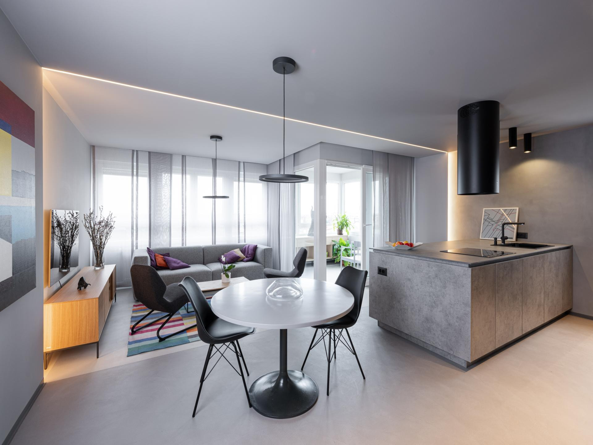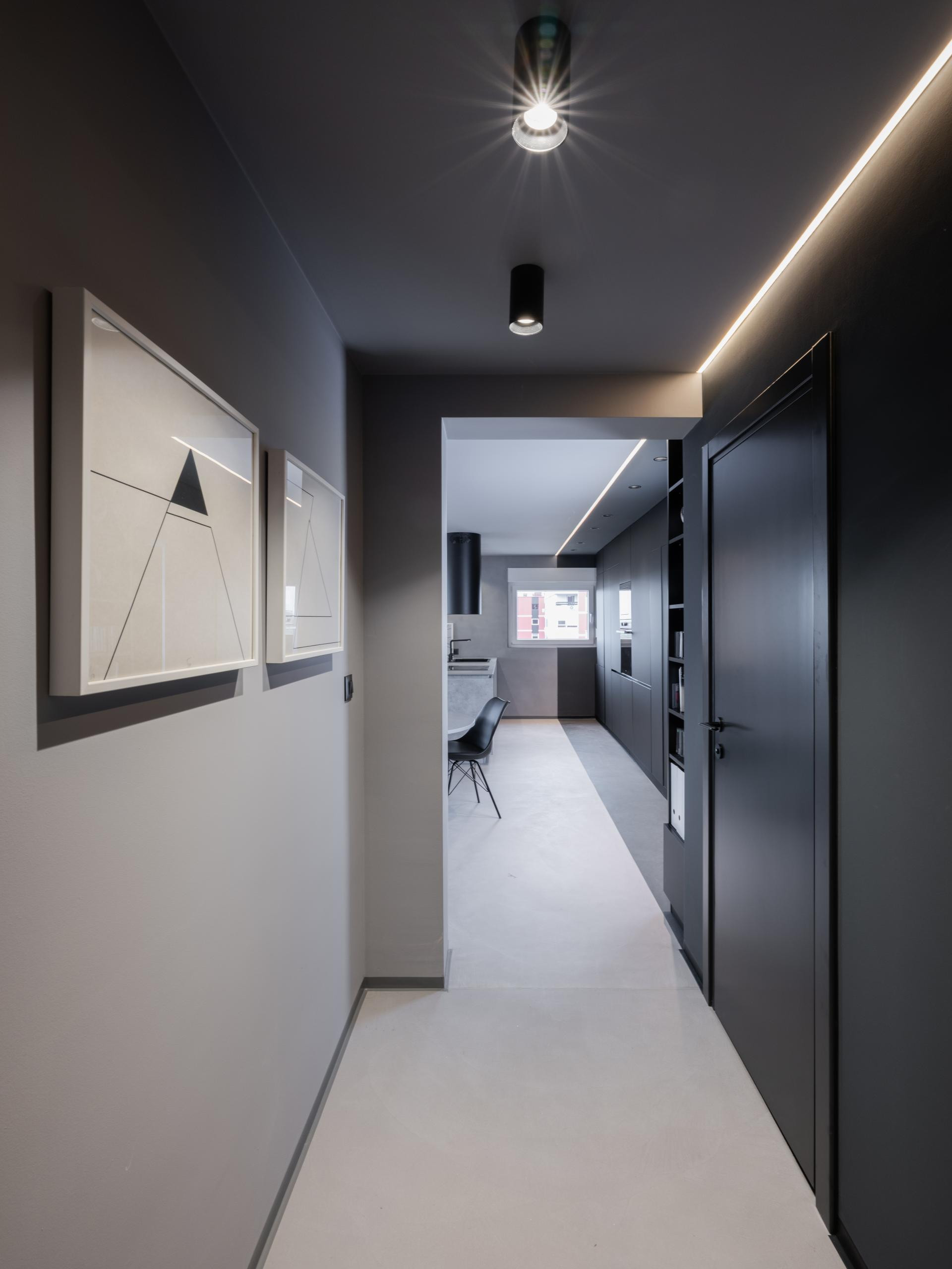 Formirali su tri uzdužne i paralelne zone koje na engleskom zovu utility, communication i lounge, koje čine novi sloj s kojim su objedinili čitav stan u novu, jedinstvenu cjelinu. Svaka zona ima svoju boju koja se manifestira u završnim oblogama podova, zidova i stropova, ali i u namještaju i opremi. Korištene boje su antracit za utility, hladna, tamnija siva za communication i topla, svjetlija siva za lounge. Zone se prosvjetljuju i produbljuju prema zoni prozora.