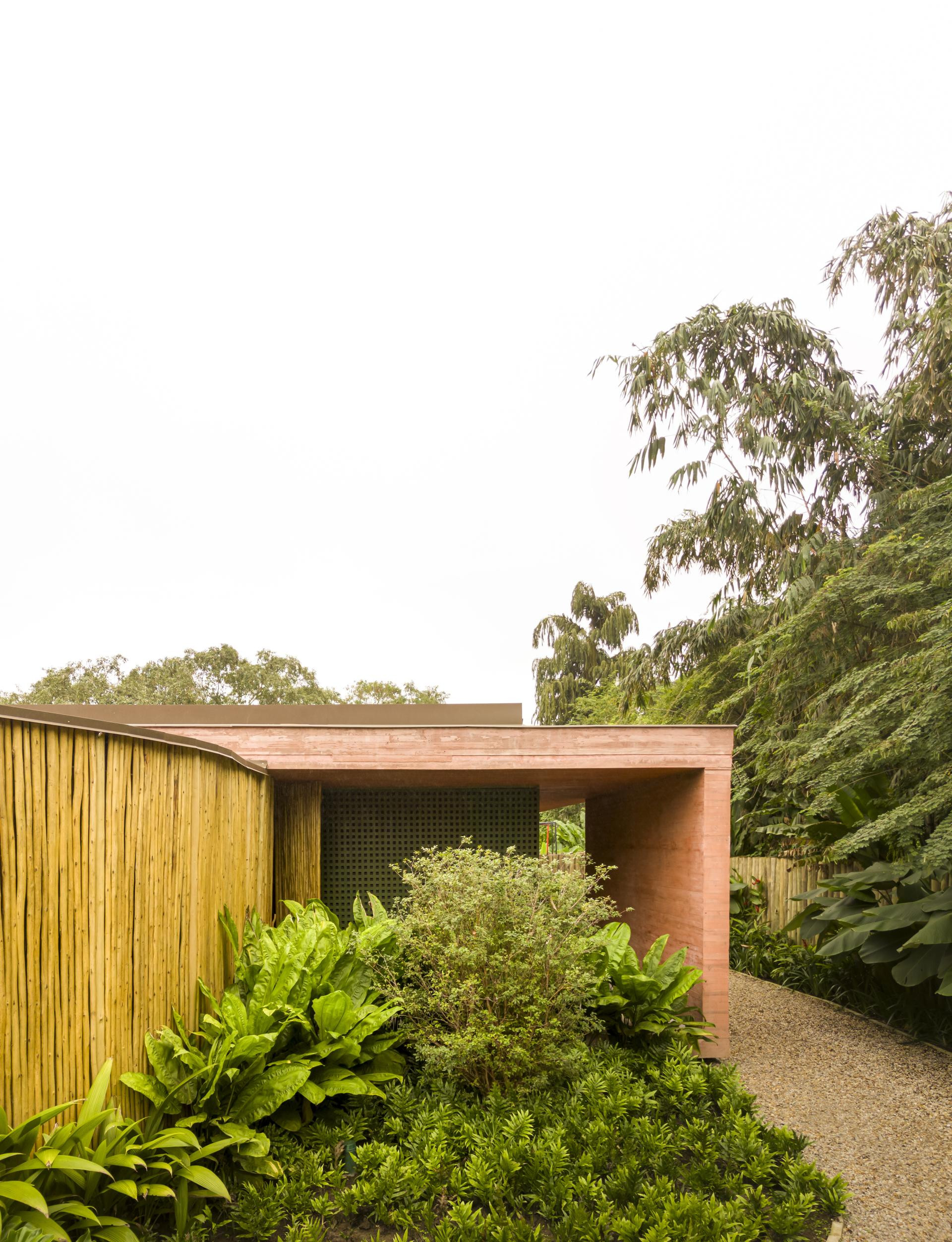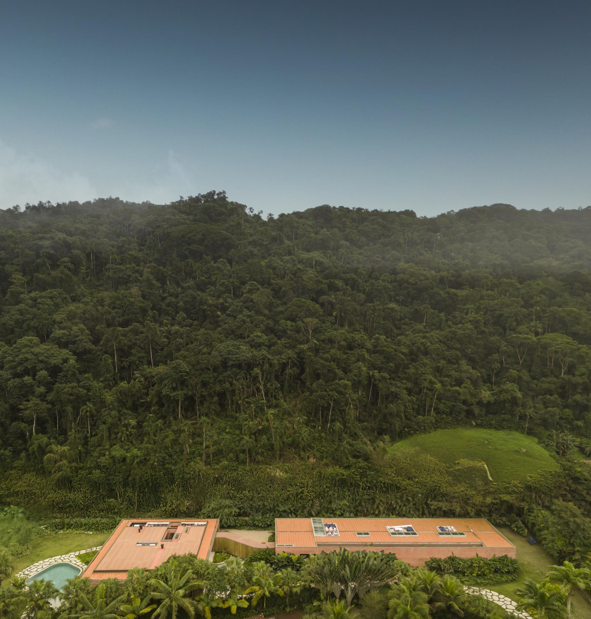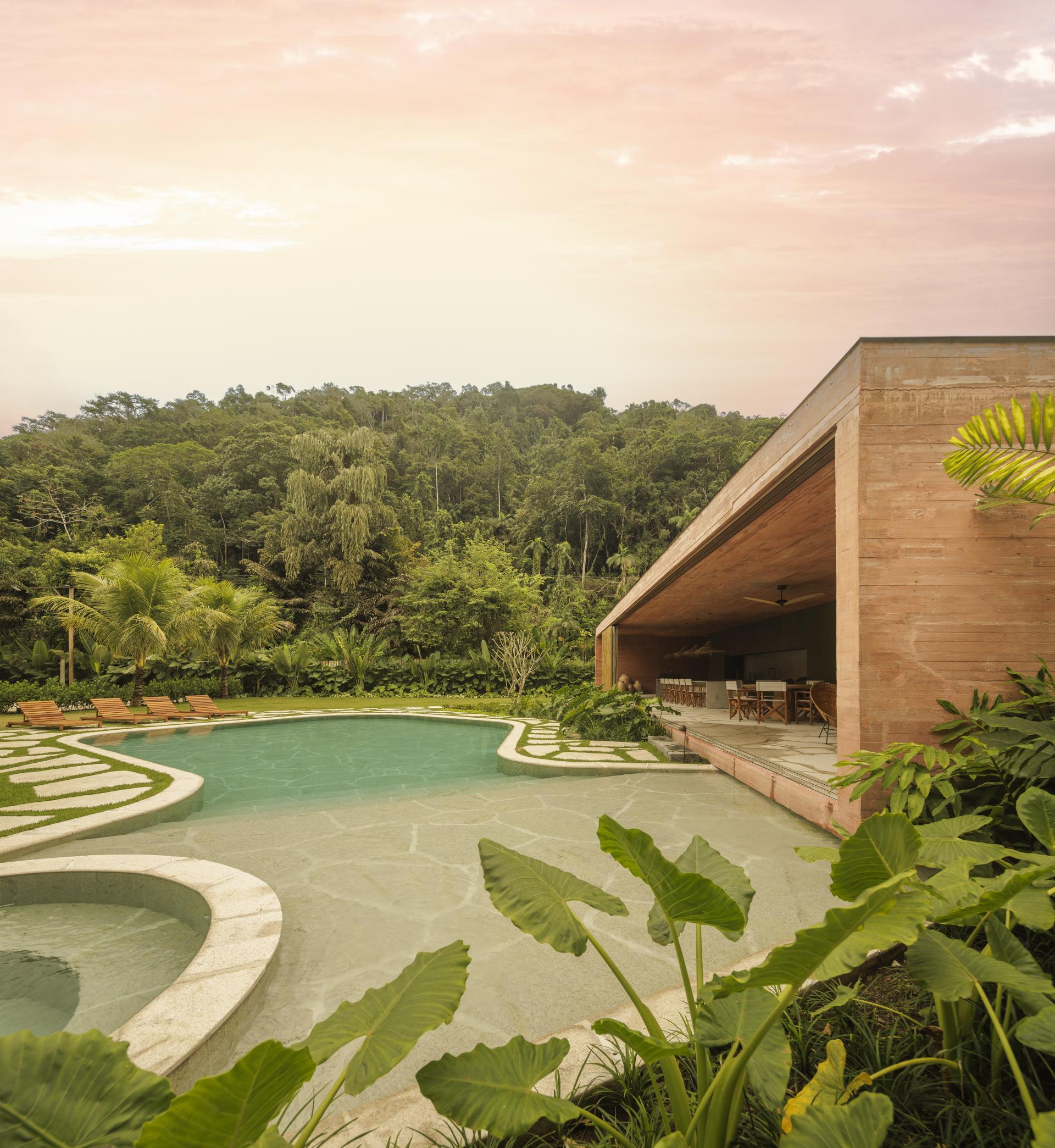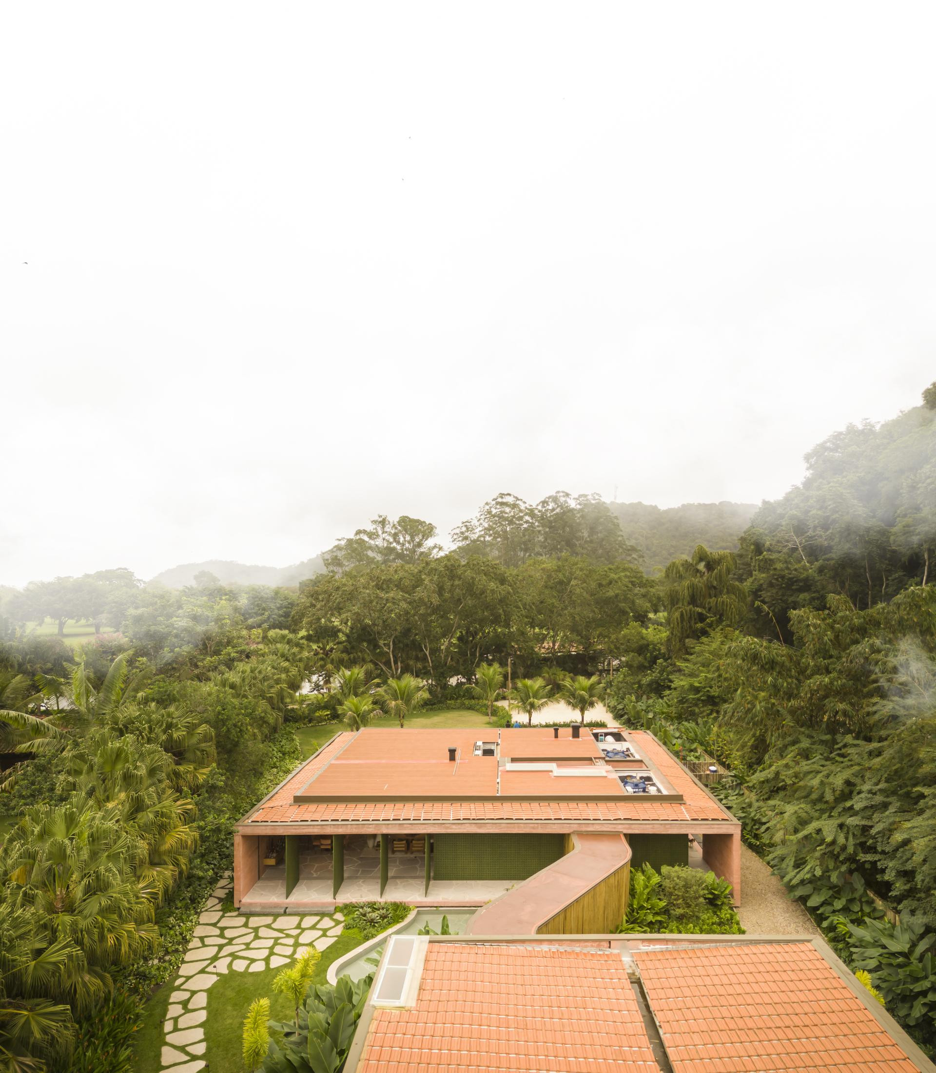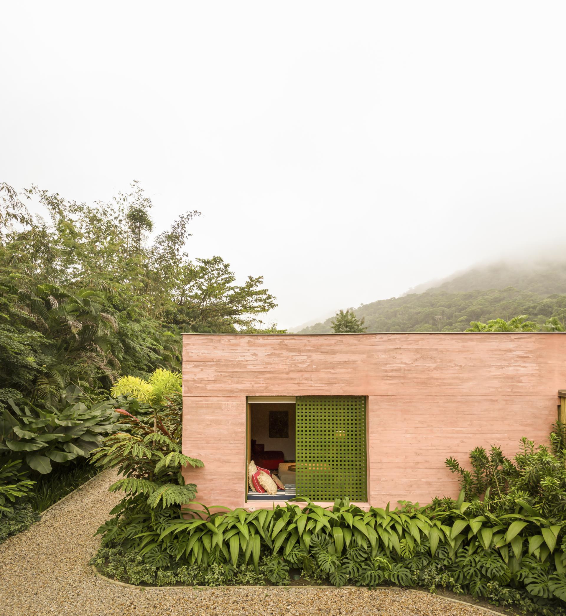 - Okružena Atlantskom šumom, kuća se ističe svojom integracijom s okolinom, nudeći iskustvo uranjanja u tropski krajolik. Ali doslovno. Arhitektonski dizajn slijedi minimalistički pristup, s jednostavnim i geometrijskim volumenima. Veliki otvori povezuju unutarnje prostore s vanjskim, promičući fuziju između interijera i eksterijera, dopuštajući unakrsno provjetravanje i obilan ulaz prirodnog svjetla. Prijelaz između blokova izveden je kroz šetnicu organskog oblika obloženu biriba drvom, materijalom koji pojačava prirodnu estetiku i integraciju s okolinom. Ova staza, osim što je funkcionalna, pruža vizualnu i osjetilnu vezu s prirodom, proširujući osjećaj kontinuiteta s okolnim krajolikom. Materijali su odabrani kako bi ojačali integraciju s mjestom. Suhi ružičasti beton, prirodno drvo i kamenje harmonično su u dijalogu sa zelenilom šume. Paleta boja i tekstura pridonosi tome da se kuća nježno kamuflira u prirodnom okruženju, naglašavajući arhitekturu koja poštuje i cijeni okoliš - opisali su arhitekti.