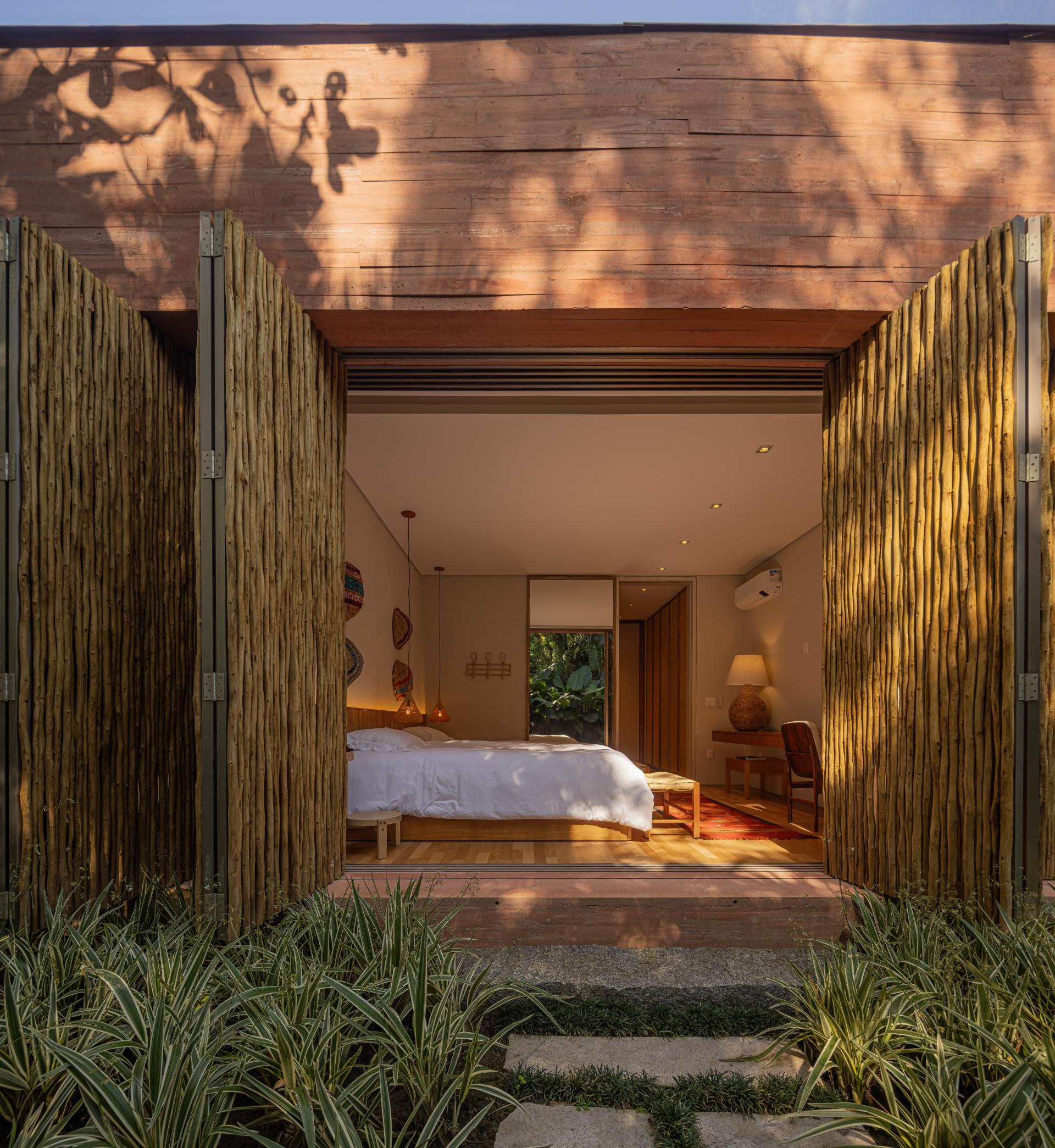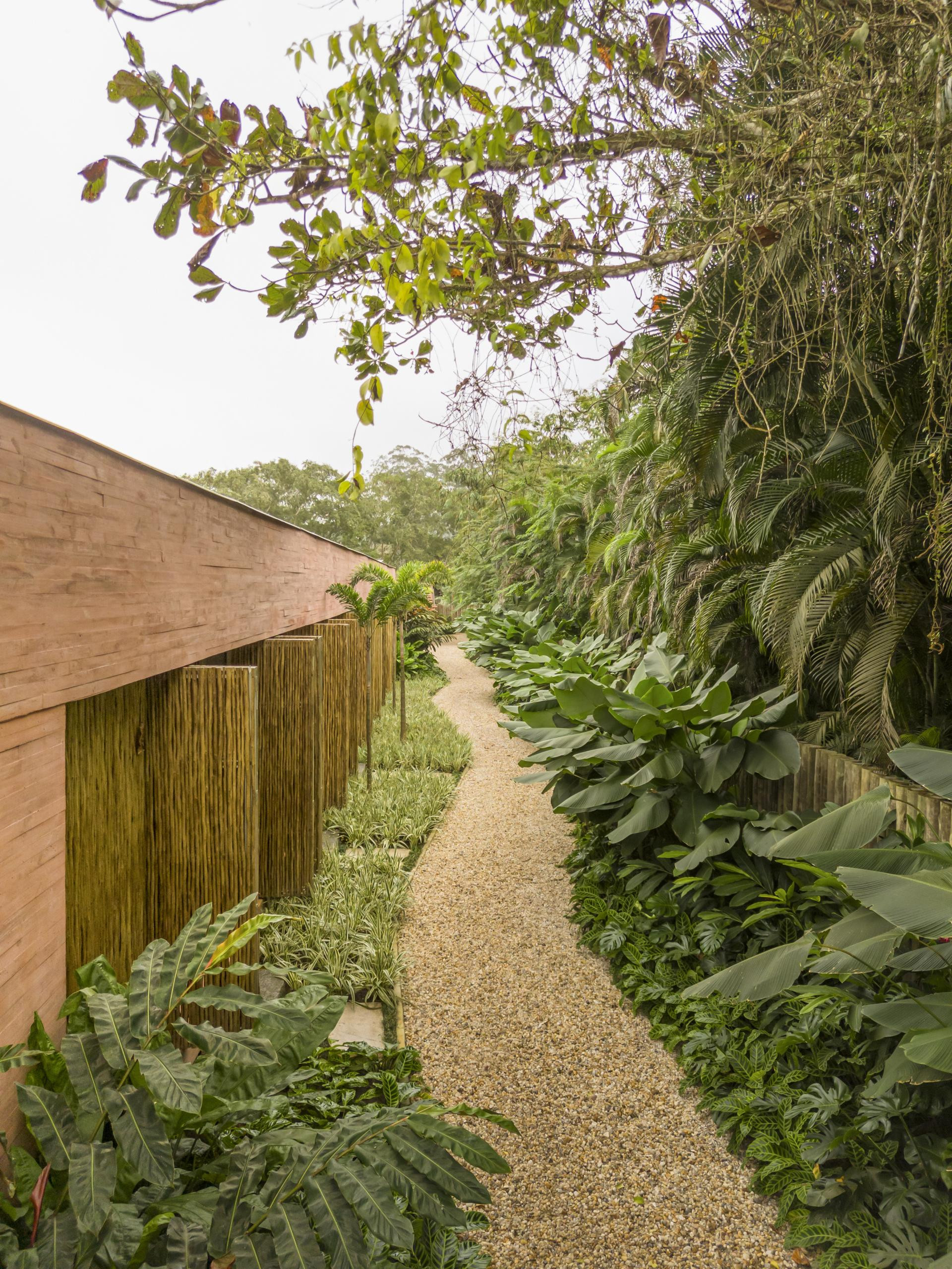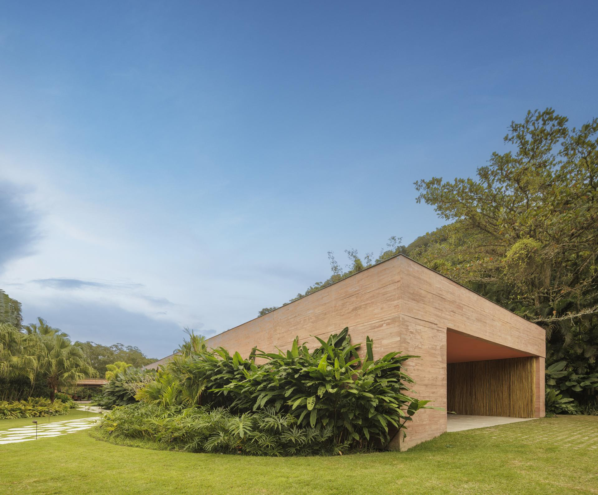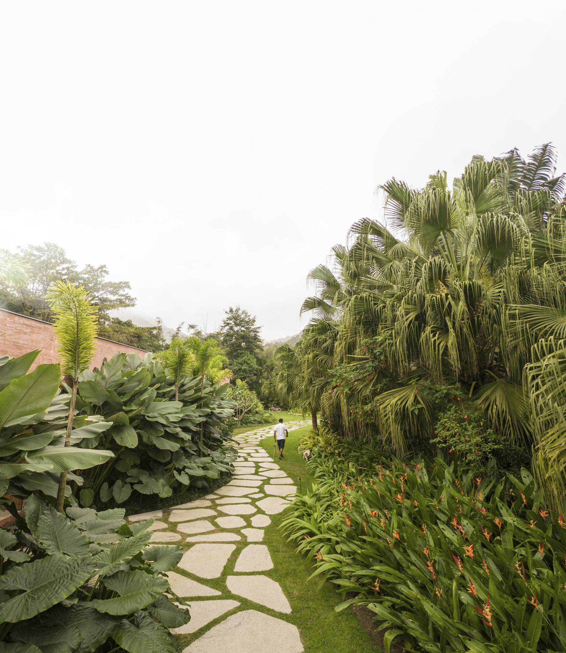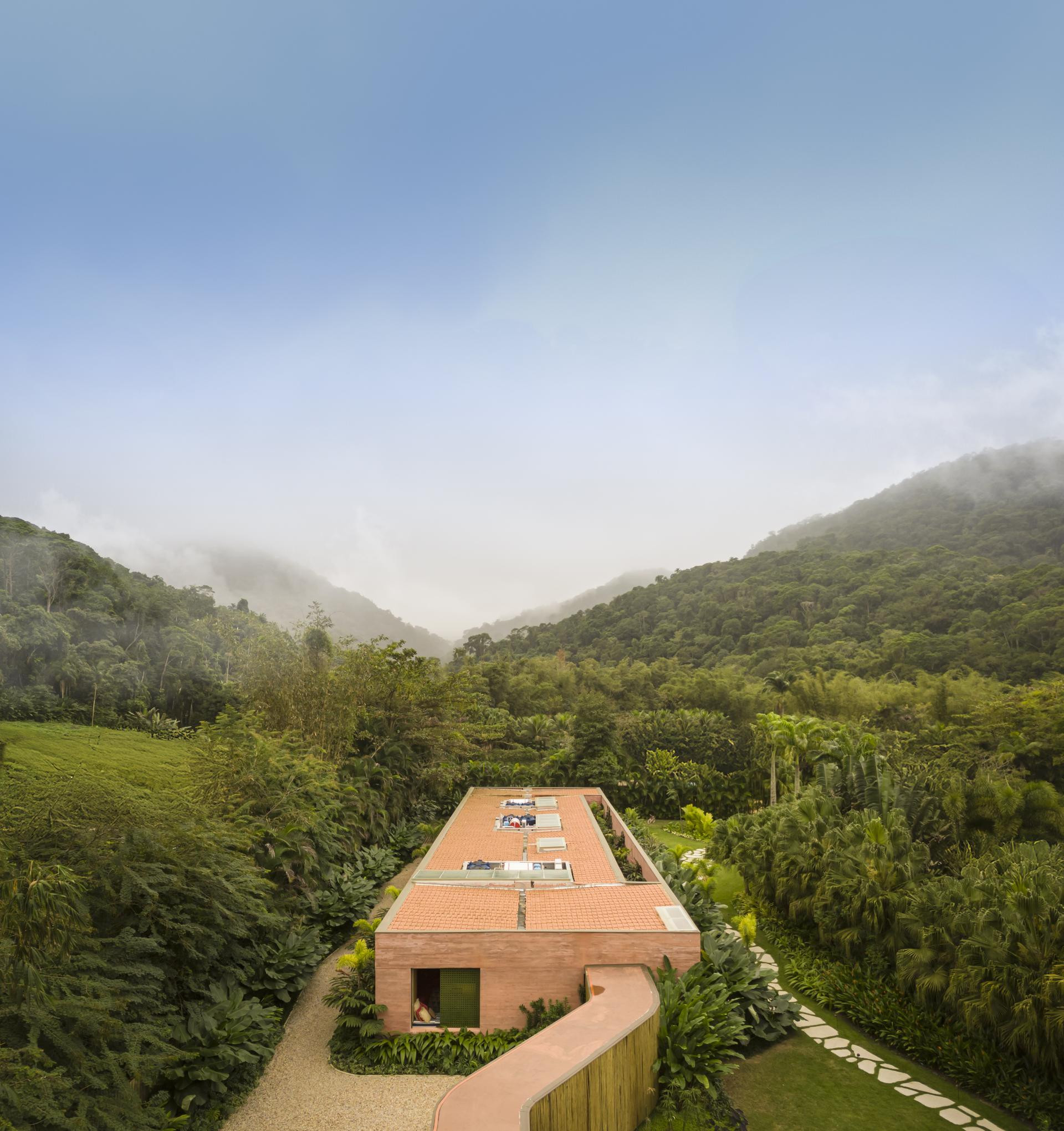 - Okružena Atlantskom šumom, kuća se ističe svojom integracijom s okolinom, nudeći iskustvo uranjanja u tropski krajolik. Ali doslovno. Arhitektonski dizajn slijedi minimalistički pristup, s jednostavnim i geometrijskim volumenima. Veliki otvori povezuju unutarnje prostore s vanjskim, promičući fuziju između interijera i eksterijera, dopuštajući unakrsno provjetravanje i obilan ulaz prirodnog svjetla. Prijelaz između blokova izveden je kroz šetnicu organskog oblika obloženu biriba drvom, materijalom koji pojačava prirodnu estetiku i integraciju s okolinom. Ova staza, osim što je funkcionalna, pruža vizualnu i osjetilnu vezu s prirodom, proširujući osjećaj kontinuiteta s okolnim krajolikom. Materijali su odabrani kako bi ojačali integraciju s mjestom. Suhi ružičasti beton, prirodno drvo i kamenje harmonično su u dijalogu sa zelenilom šume. Paleta boja i tekstura pridonosi tome da se kuća nježno kamuflira u prirodnom okruženju, naglašavajući arhitekturu koja poštuje i cijeni okoliš - opisali su arhitekti.