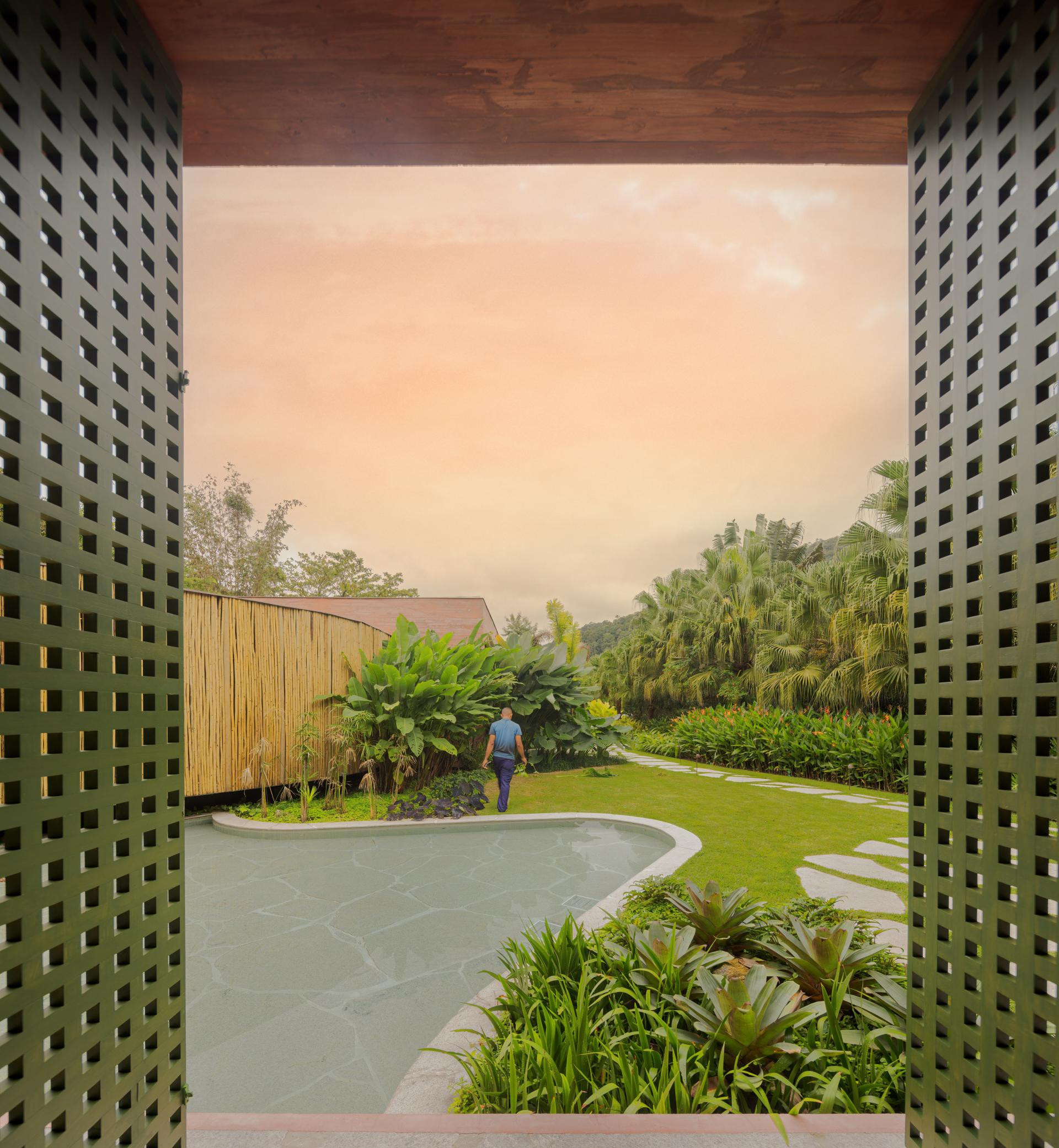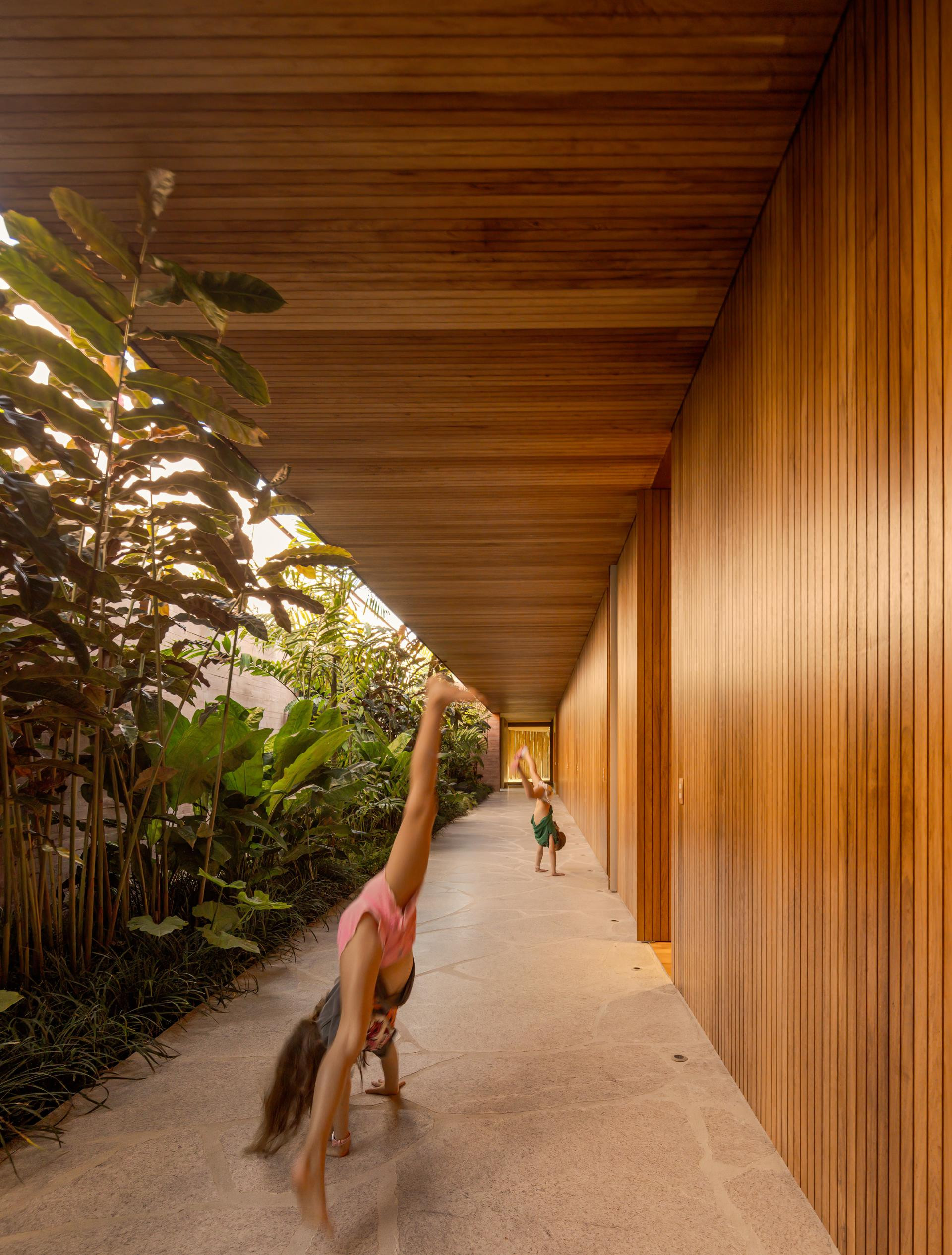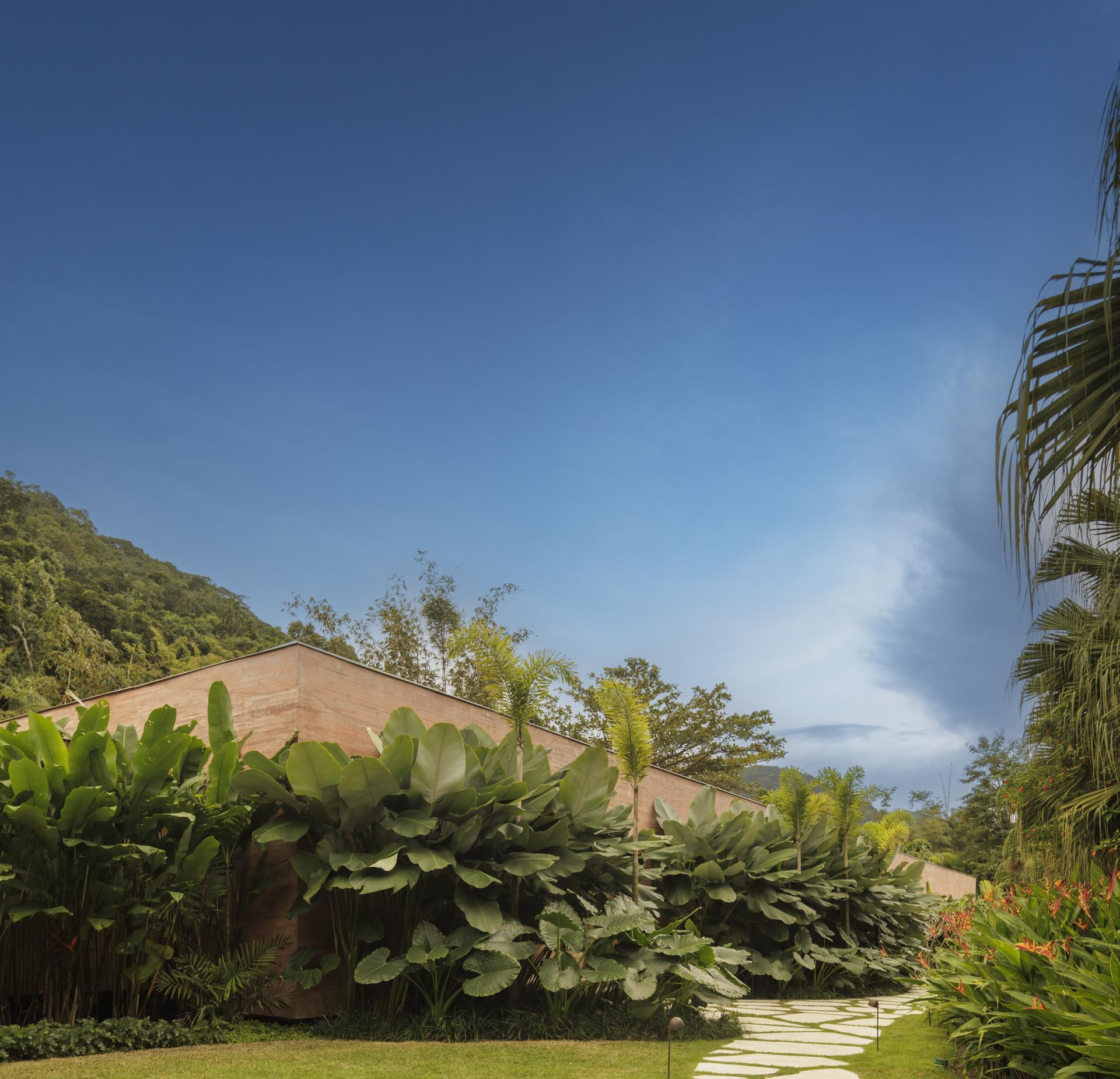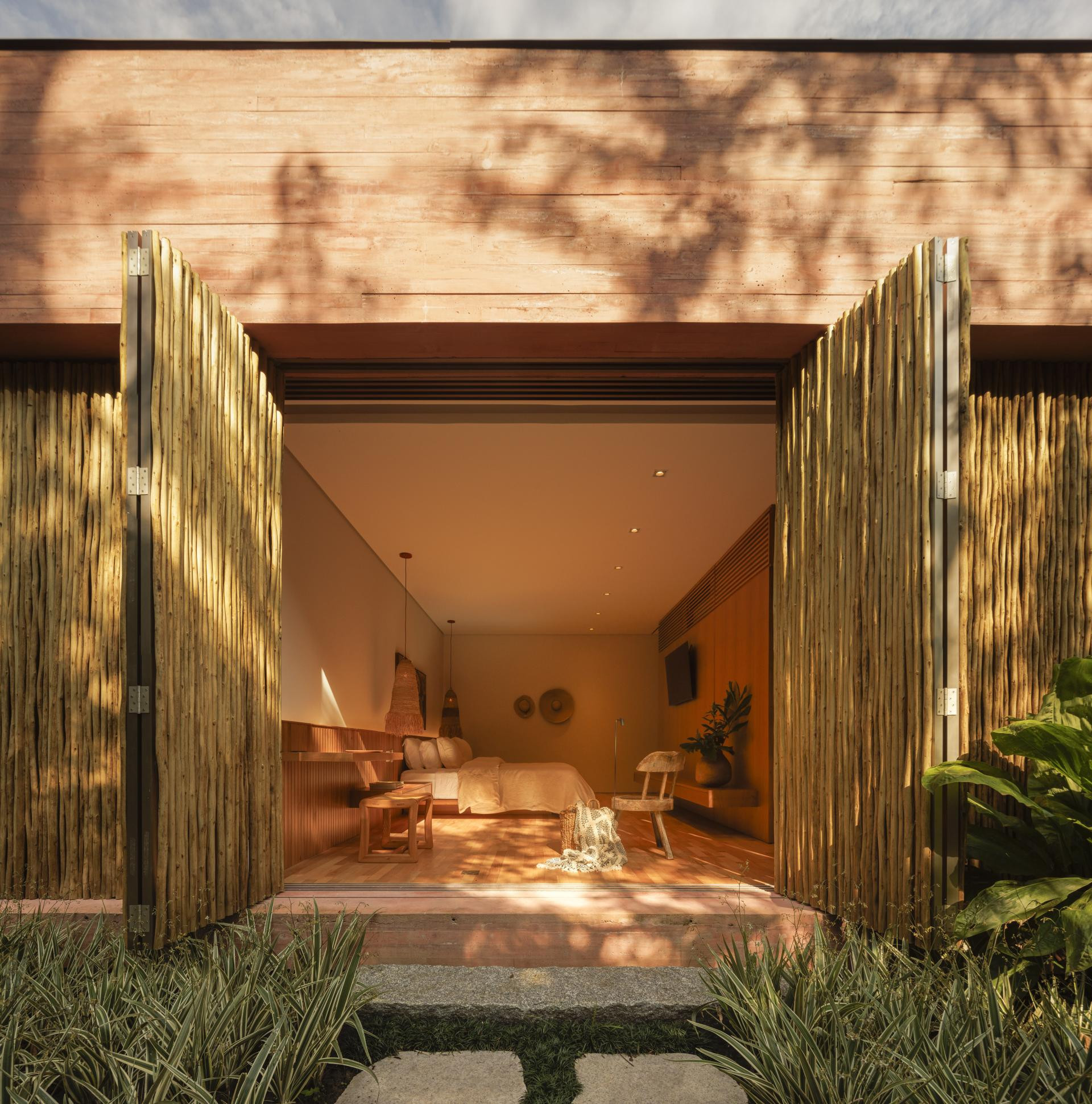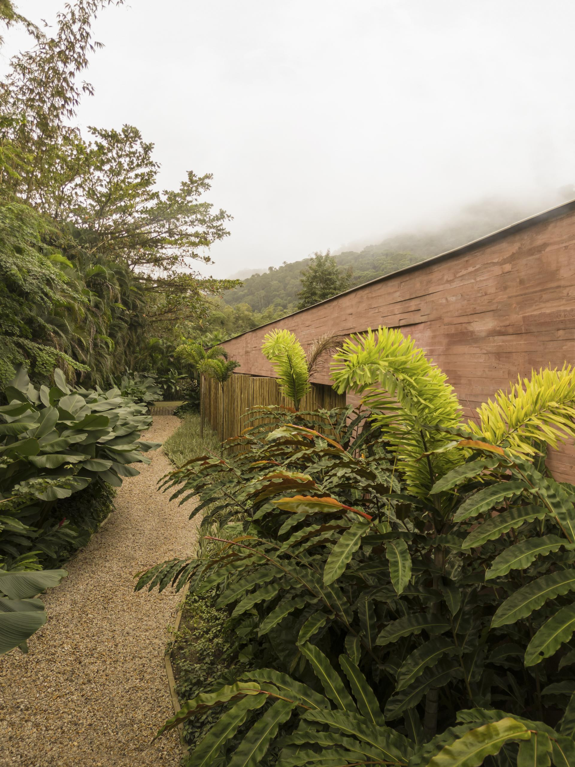 - Okružena Atlantskom šumom, kuća se ističe svojom integracijom s okolinom, nudeći iskustvo uranjanja u tropski krajolik. Ali doslovno. Arhitektonski dizajn slijedi minimalistički pristup, s jednostavnim i geometrijskim volumenima. Veliki otvori povezuju unutarnje prostore s vanjskim, promičući fuziju između interijera i eksterijera, dopuštajući unakrsno provjetravanje i obilan ulaz prirodnog svjetla. Prijelaz između blokova izveden je kroz šetnicu organskog oblika obloženu biriba drvom, materijalom koji pojačava prirodnu estetiku i integraciju s okolinom. Ova staza, osim što je funkcionalna, pruža vizualnu i osjetilnu vezu s prirodom, proširujući osjećaj kontinuiteta s okolnim krajolikom. Materijali su odabrani kako bi ojačali integraciju s mjestom. Suhi ružičasti beton, prirodno drvo i kamenje harmonično su u dijalogu sa zelenilom šume. Paleta boja i tekstura pridonosi tome da se kuća nježno kamuflira u prirodnom okruženju, naglašavajući arhitekturu koja poštuje i cijeni okoliš - opisali su arhitekti.