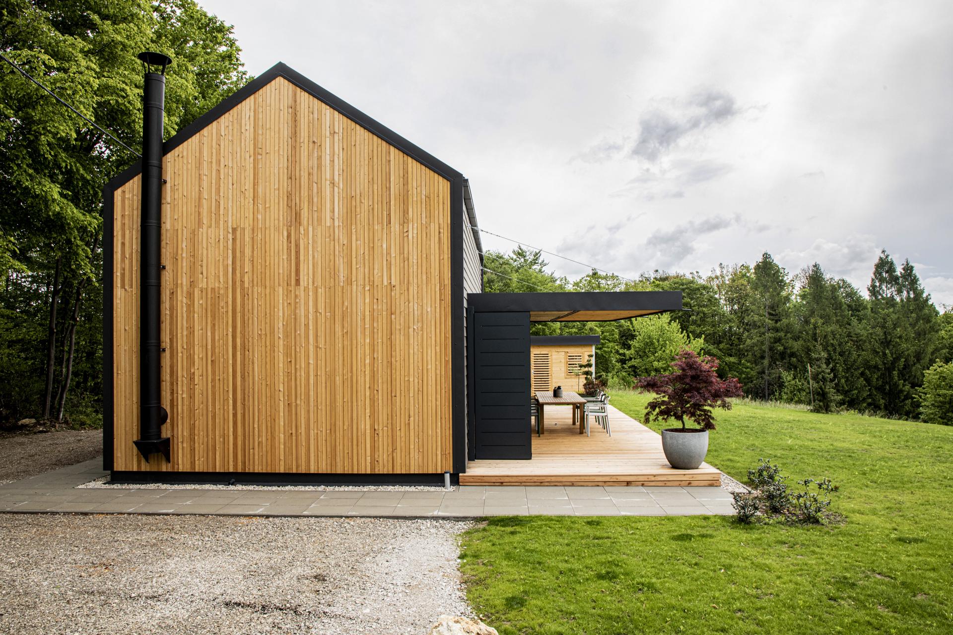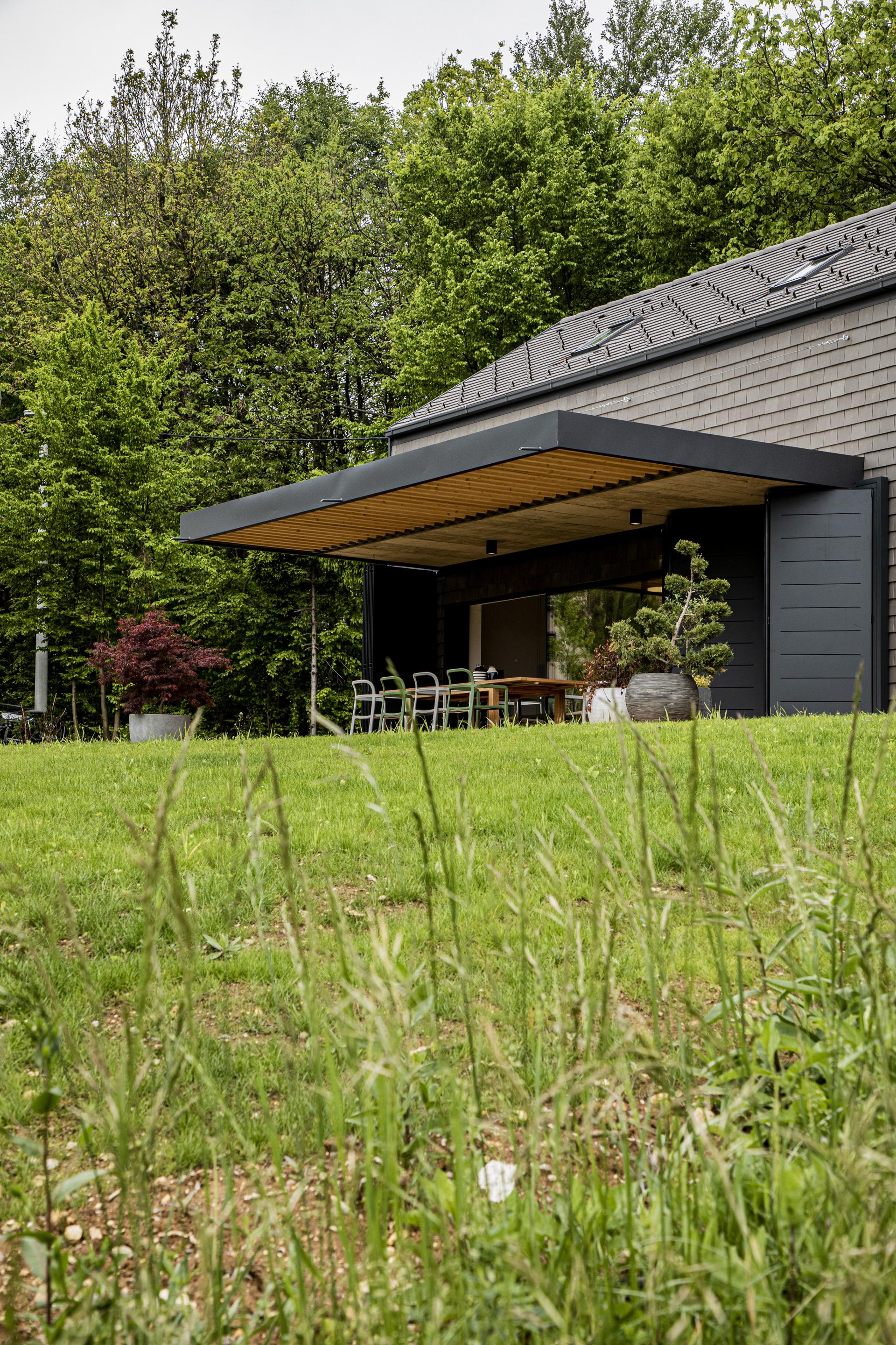 Dualnost unutarnjeg prostora preslikala se i na eksterijer: dvije duže fasade su, kao i krov, obložene tamno-sivim crijepom tvrtke Wienerberger dok su zabatne plohe izvedene u prirodnom drvu - sibirskom arišu.