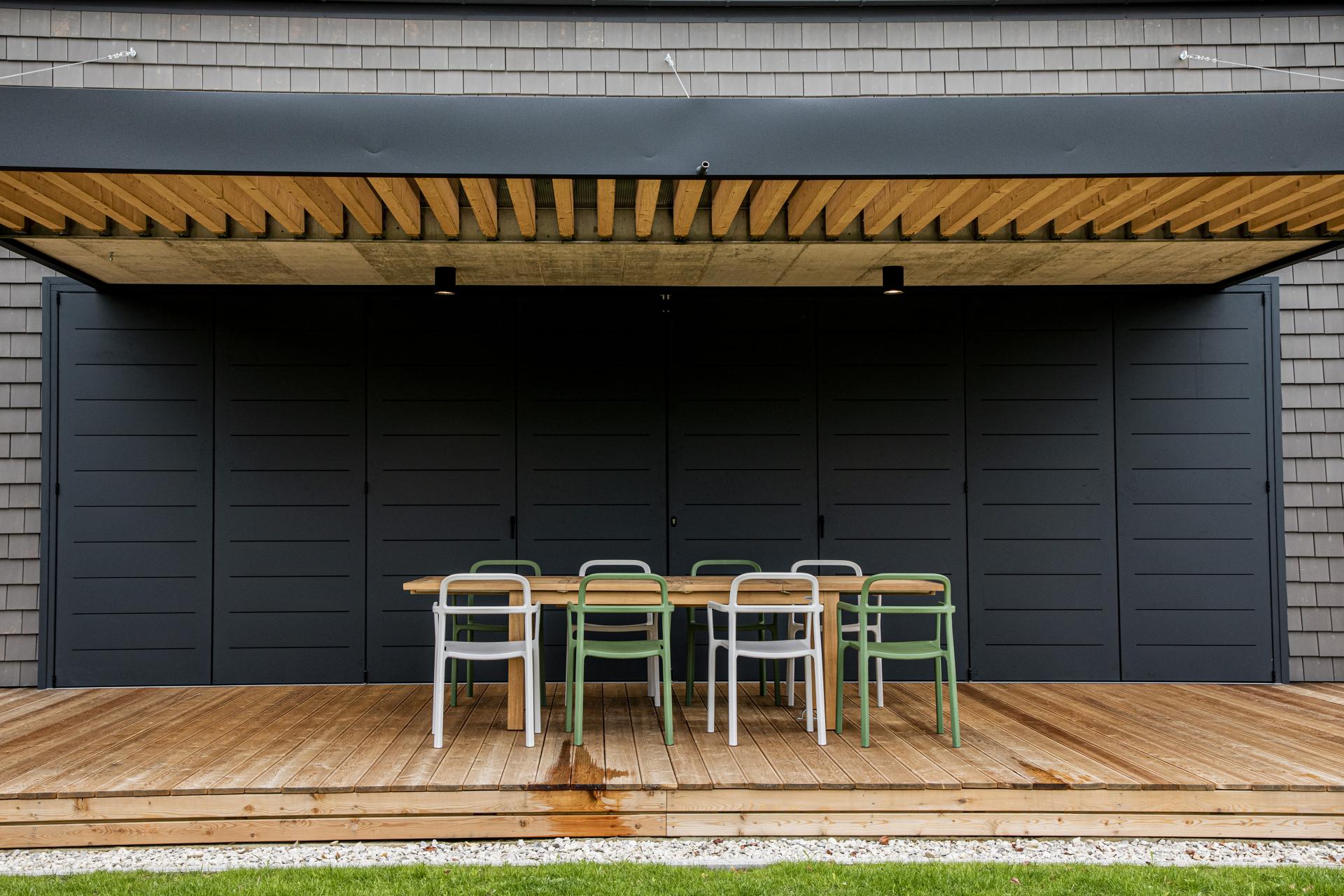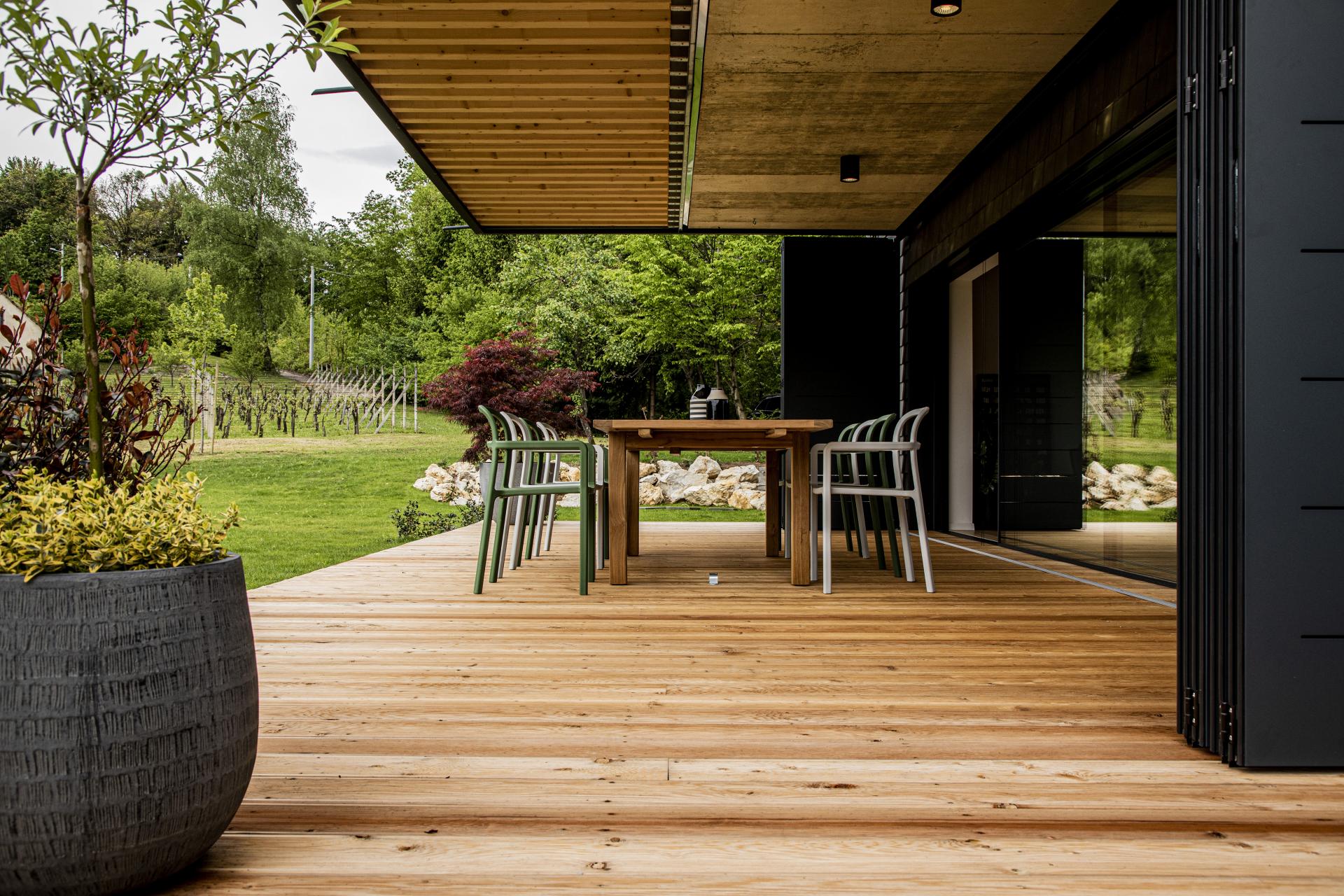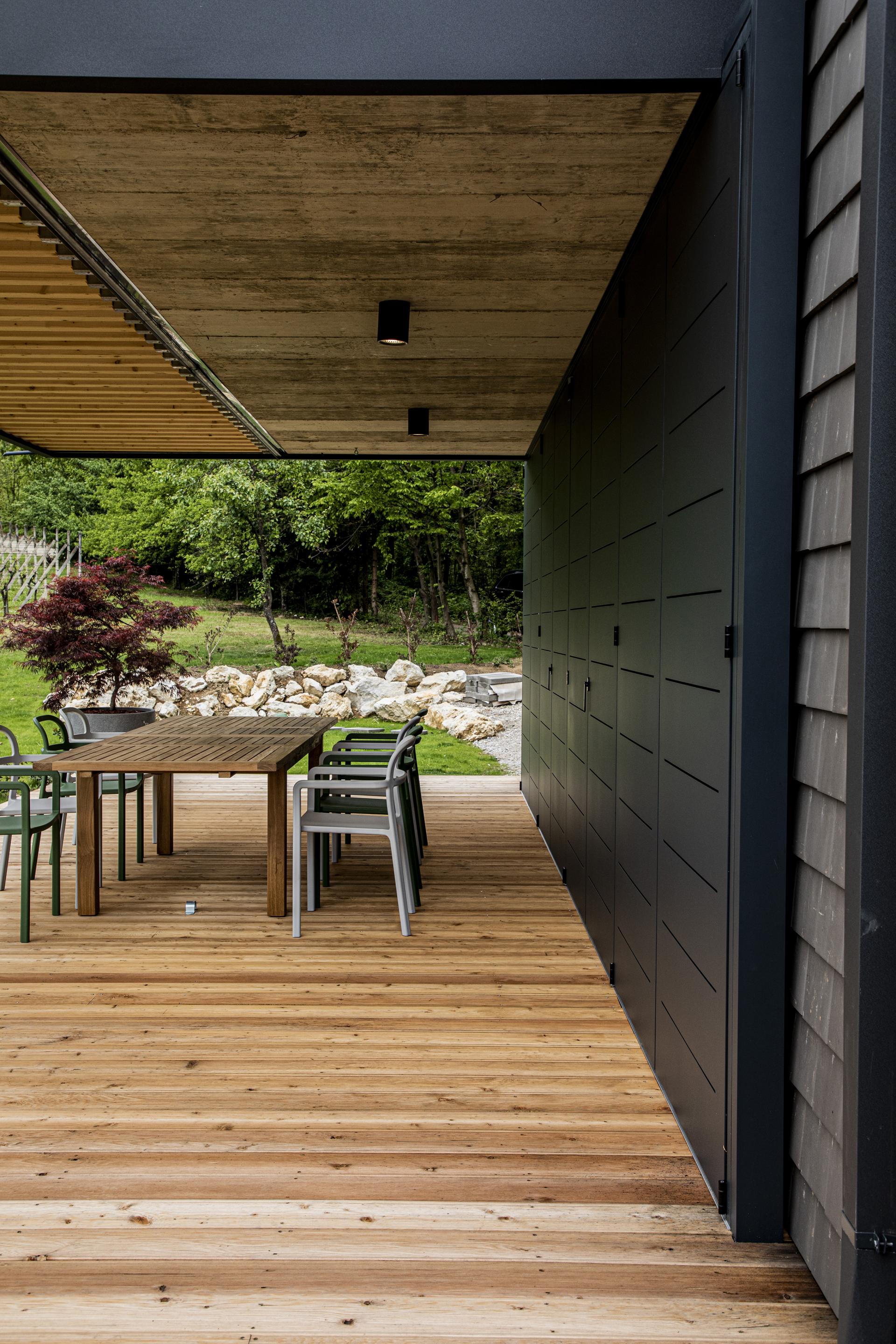 Sama klizna staklena stijena, koju je izradila i montirala tvrtka S.B.S., može se iz sigurnosnih, ali i ambijentalnih razloga u potpunosti zatvoriti metalnim “harmonika” vratima pa se tako ova kuća za tren pretvara u zatvoreni sustav, poput bunkera ili puževe kućice. Ispred kuće nalazi se prostrana terasa natkrivena konzolnom nadstrešnicom, izvedenom u kombinaciji armiranog betona i drvenih letvica.