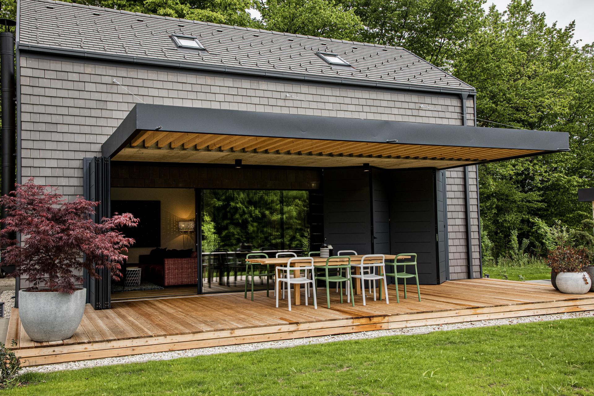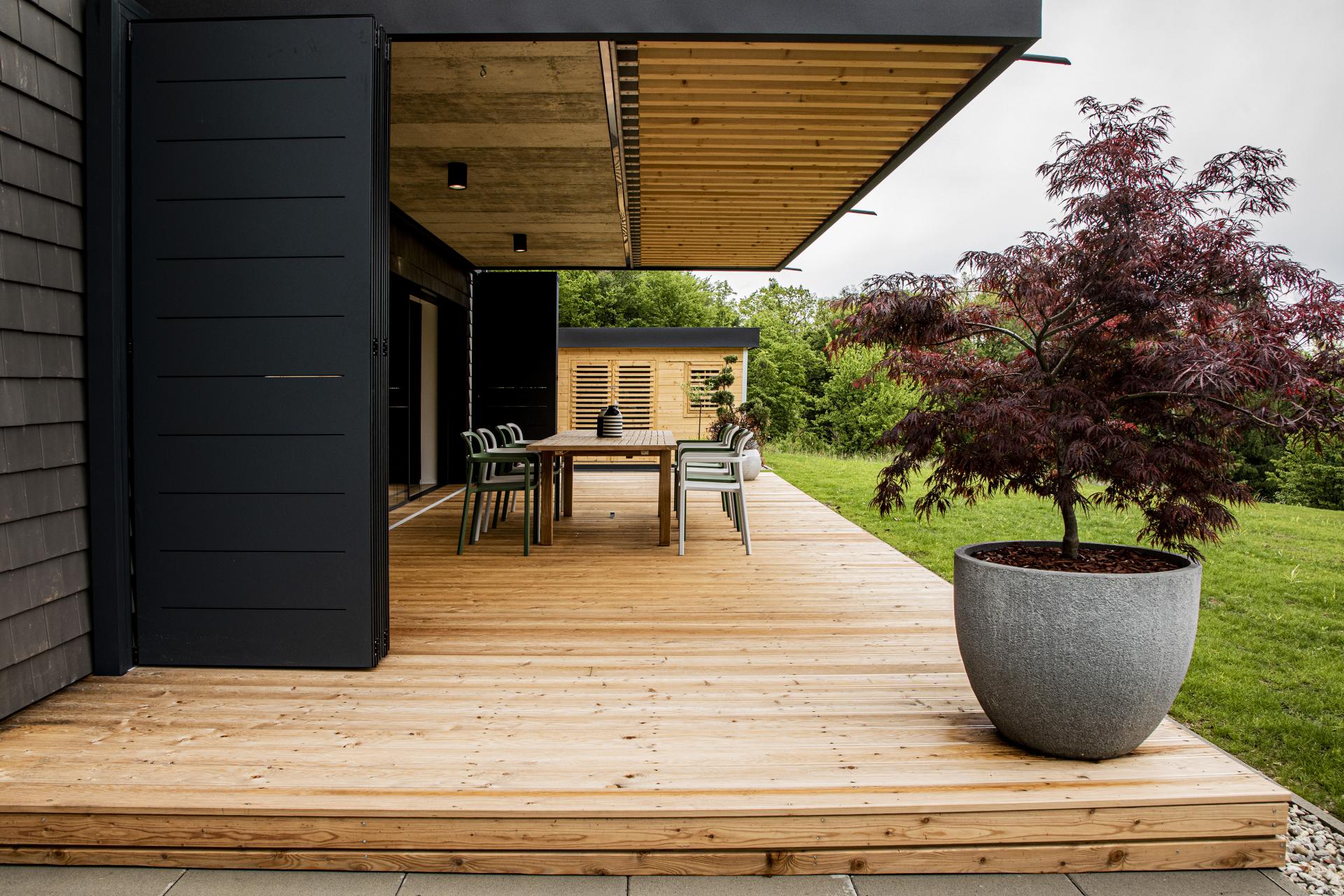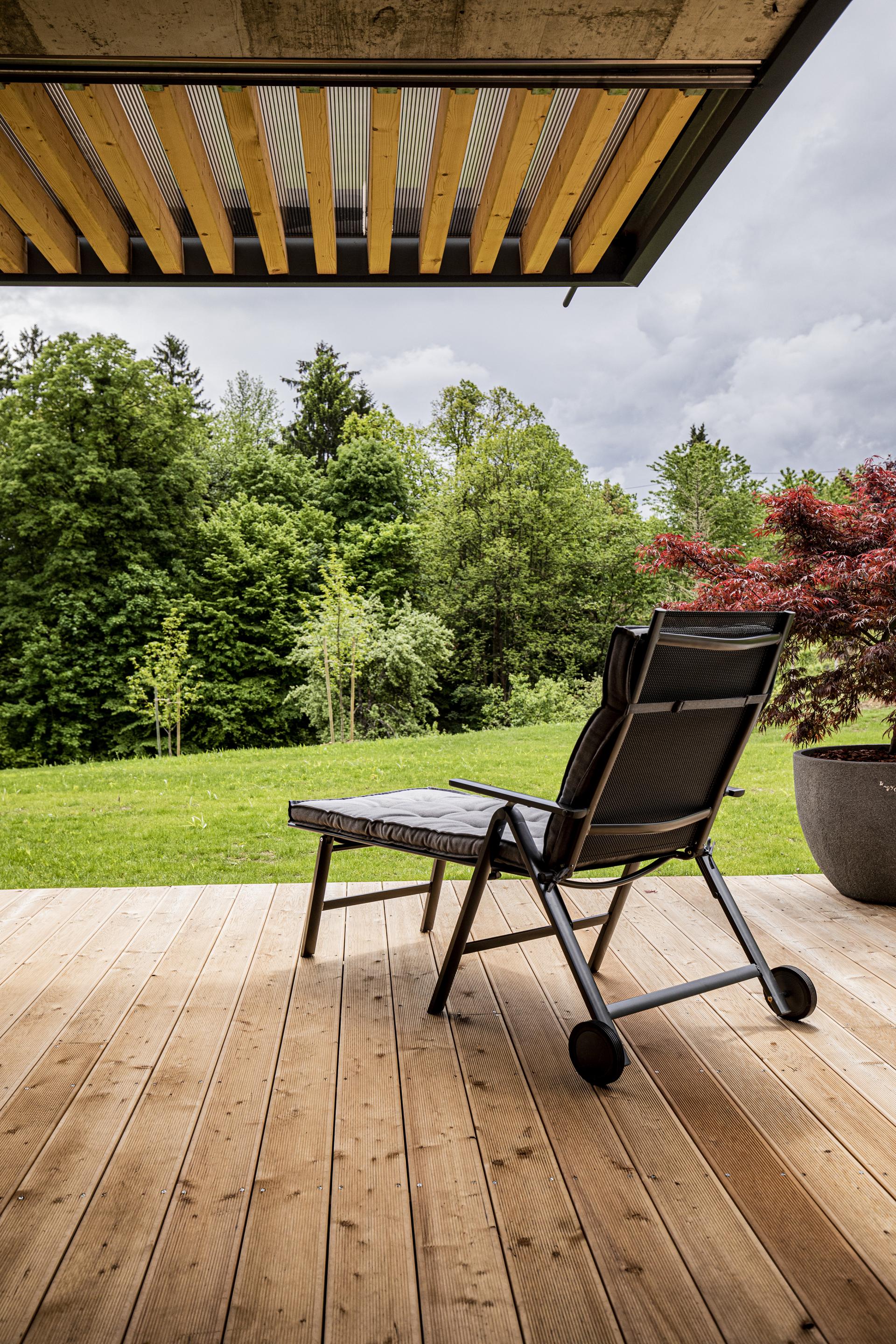 Sama klizna staklena stijena, koju je izradila i montirala tvrtka S.B.S., može se iz sigurnosnih, ali i ambijentalnih razloga u potpunosti zatvoriti metalnim “harmonika” vratima pa se tako ova kuća za tren pretvara u zatvoreni sustav, poput bunkera ili puževe kućice. Ispred kuće nalazi se prostrana terasa natkrivena konzolnom nadstrešnicom, izvedenom u kombinaciji armiranog betona i drvenih letvica.
