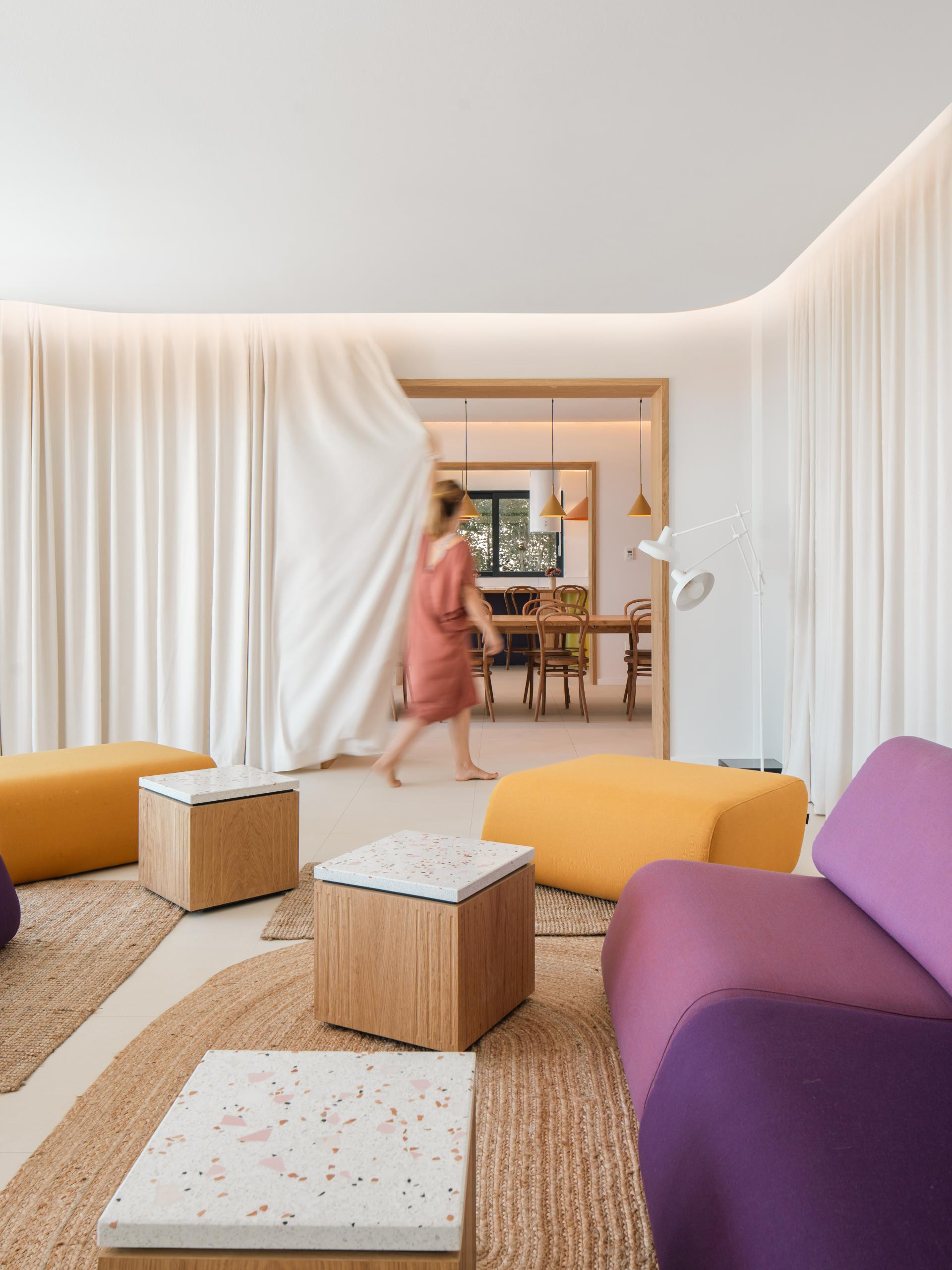 Primjerice, boravak je obrubljen zavjesama da bi se postigao nestvarni dojam prostora, a strop je ostavljen potpuno "čist" s indirektnim svijetlom, što stvara dojam da lebdi. Zavjese stvaraju igru i uz vjetar i uz njihovo povlačenje. Sofe su lagane i mogu se prearanžirati u trenutku, to je model sofe Juno našeg proizvođača Pleme, koji je dopunio tu temu igre u interijeru. U jednom trenutku svi mogu gledati TV, u drugom se okupiti u krug, a u trećem gledati van. Studio Botanike je napravio odabir biljaka, a umjetnik Rino Banko je tu postavio svoj rad iz serije "Portali".