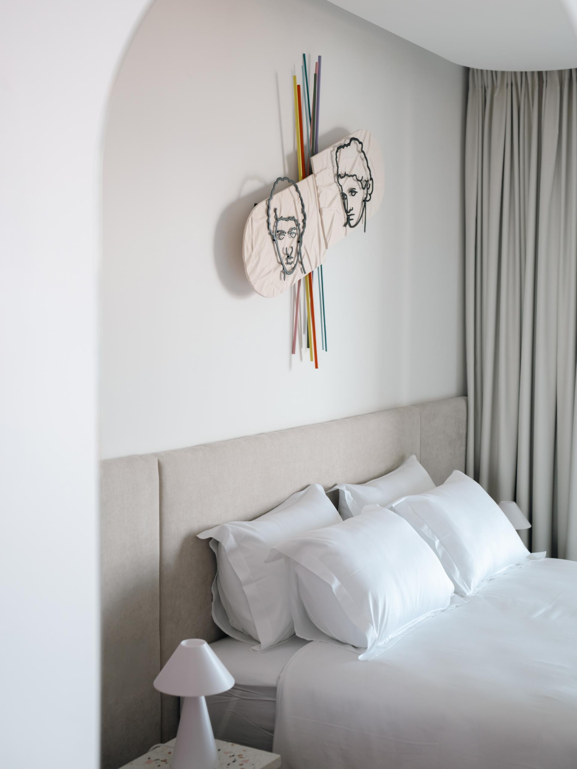 Iznad svakog kreveta umjetnik Rino Banko napravio je jedan "site-specific" rad, inspiriran antičkim skulpturama kojih je mnoštvo izloženo u Omiškom muzeju, antičkim porculanom, te se nadovezao na "multiform" temu koja se provlači kroz cijeli interijer. Sve je to bilo vrlo intuitivno, s otvorenim mnoštvom mogućih interpretacija - opisuje Mario Furčić i nastavlja da je željeni, konačni stil interijera bio nešto u stilu "magičnog realizma", kao u slikama našeg slikara Stančića ili Talijana Giorgia de Chirica. Ondje gdje se prošlost i sadašnjost susreću u kulisama prostora, stvarajući atmosferu snoviđenja.