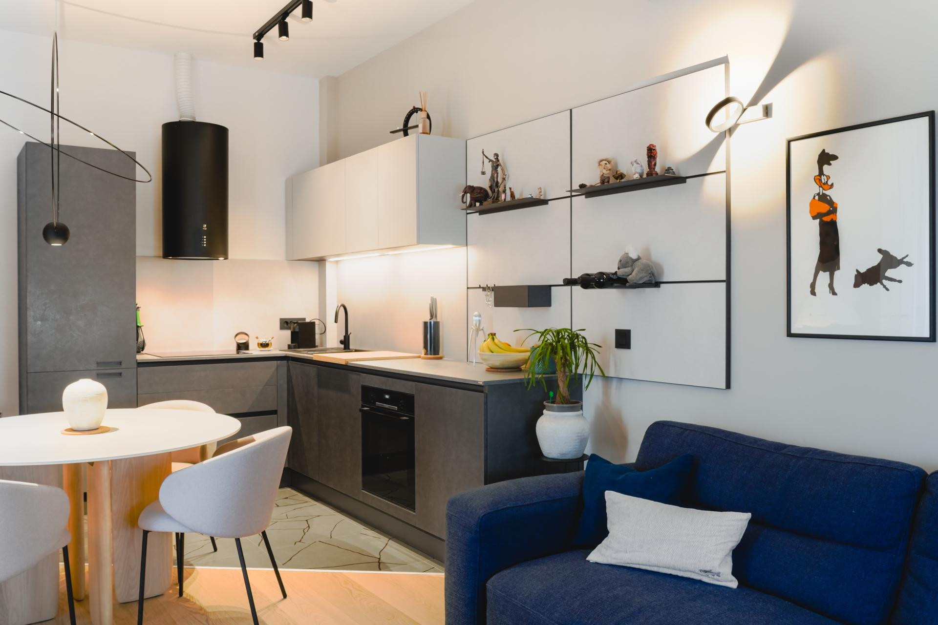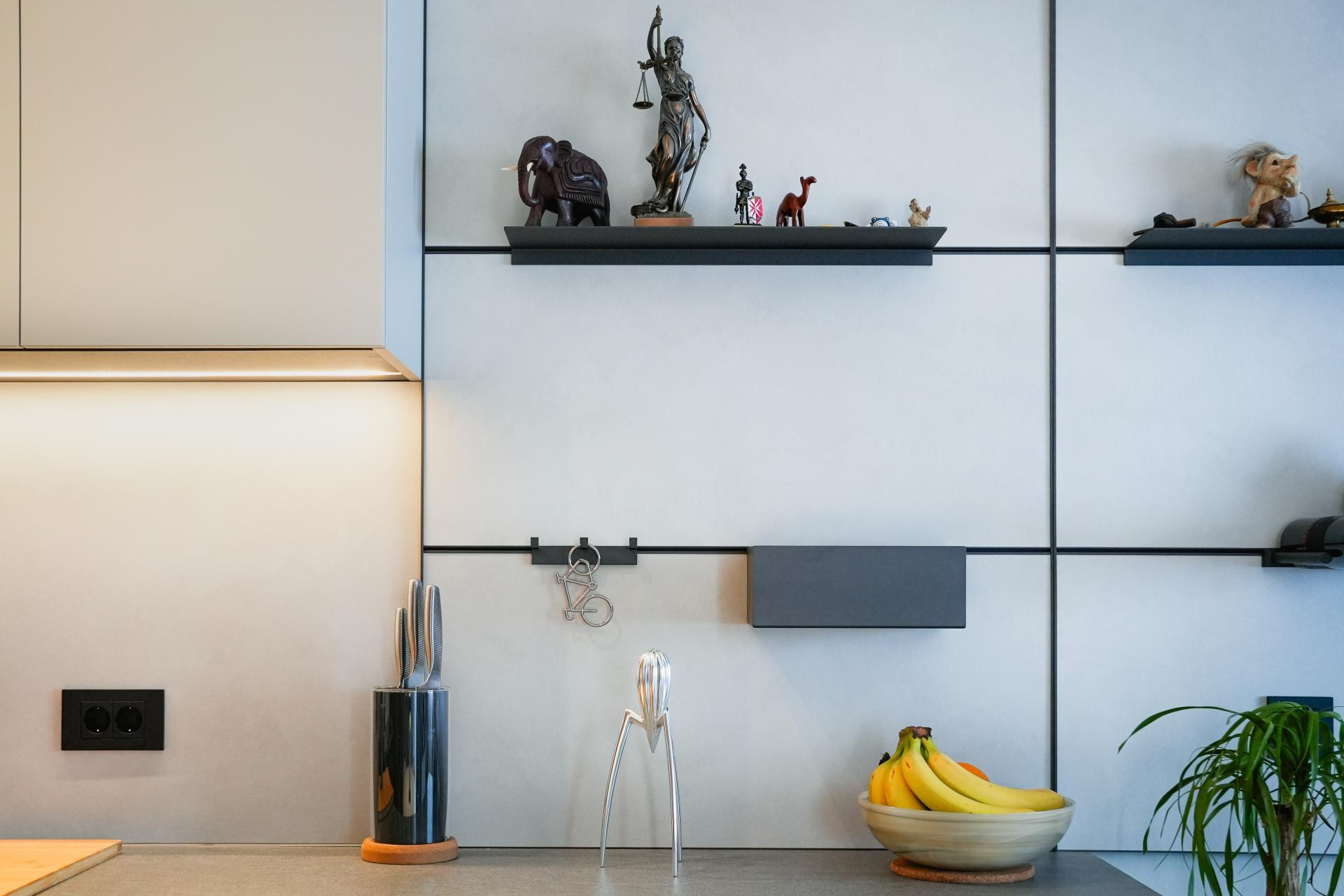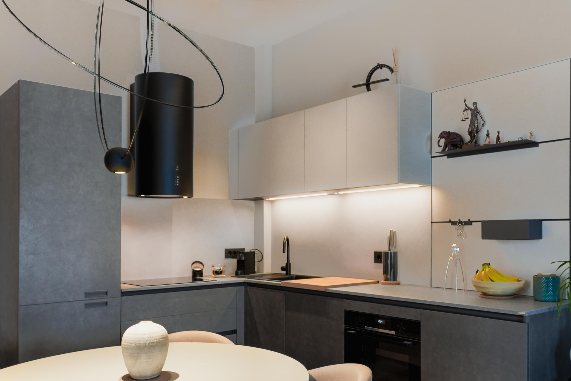 "Tu je prije svega beton, "pravi muški materijal" kojeg nalazimo u kuhinji, a s druge strane imamo drvo koje mu svojom toplinom i profinjenošću savršeno parira. Zapravo, spoj drva i betona u dijelu kuhinje i dnevnog boravka priča je o materijalima iz prirode, materijalima koje nalazimo putem do stana... Njihov kontrast upravo je ono što prostoru daje ravnotežu pa kada uđete u prostor ne možete definirati da li je hladan ili topao", napomine Vita o materijalima koje je unijela u prostor, a koji su savršeno izbalansirani kako bi vlasniku u stanu bilo ugodno boraviti.