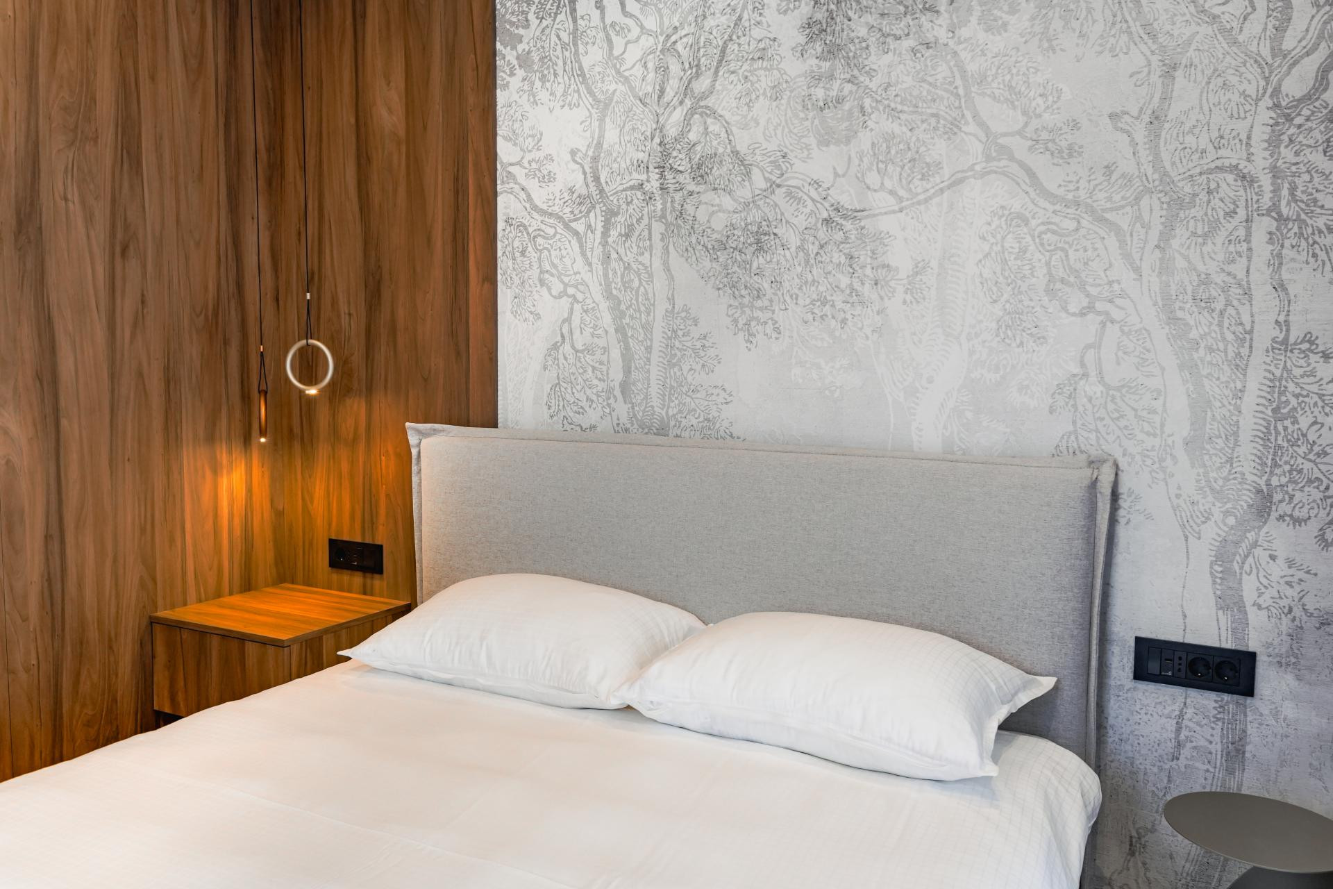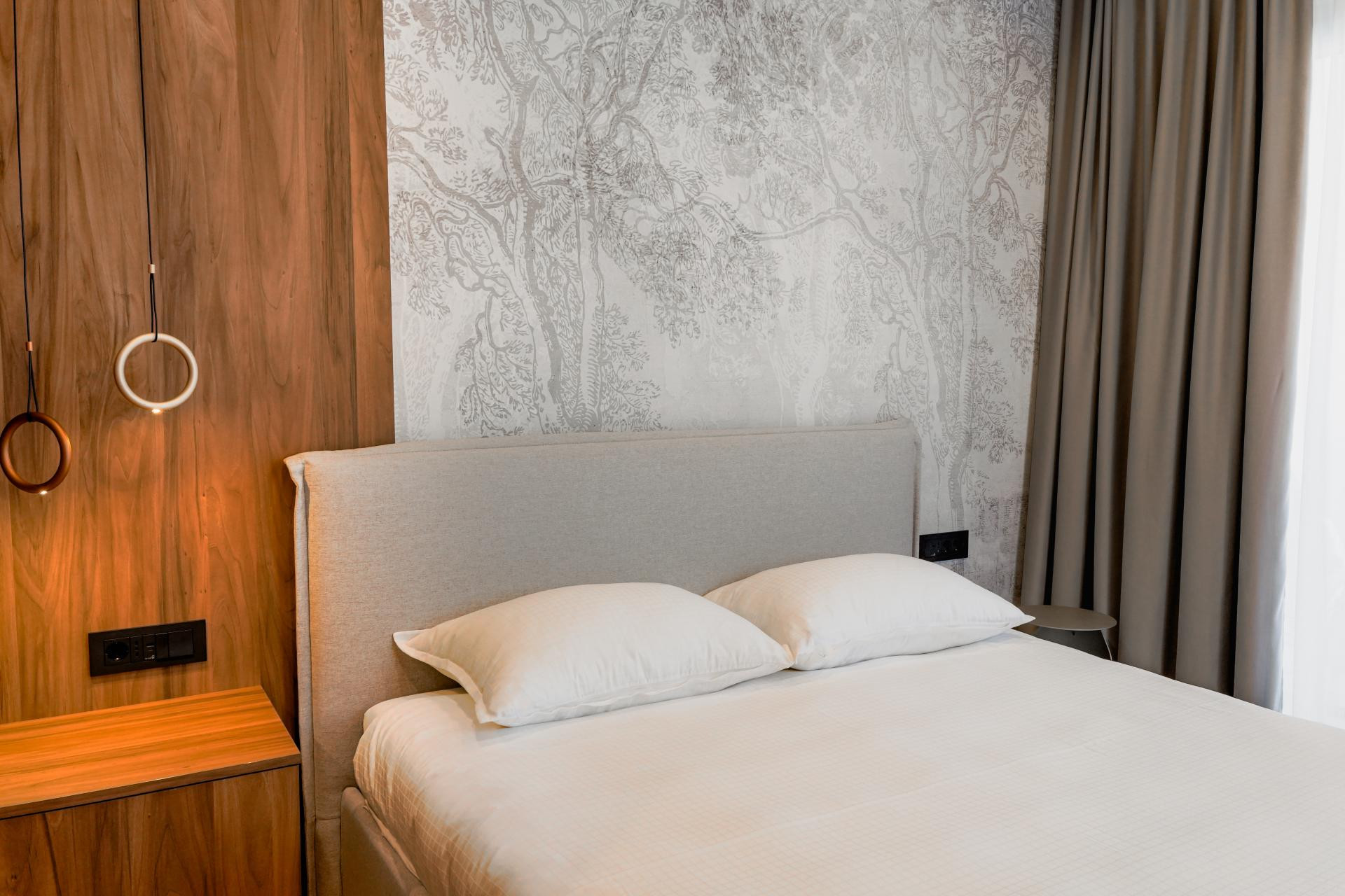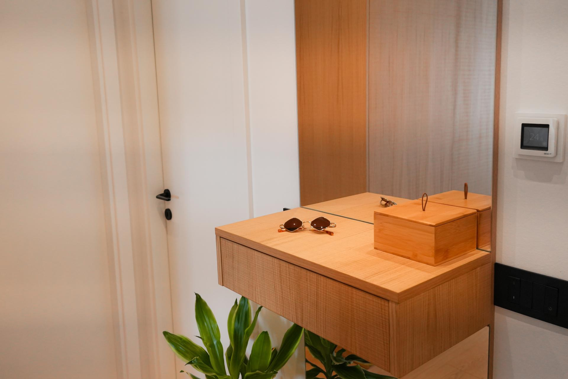 "Pri samom projektiranju ukrali smo malo manje sobe kako bi pri samom ulazu u glavnu spavaću sobu dobili garderobu koju od spavaćeg dijela dijeli zid obložen drvenom oblogom. Garderobni ormar ima pak tamne staklene vratnice, pa je opet riječ o spoju dva suprotna elementa, drva i stakla", govori dizajnerica te ističe kako je čitav stan prožet kontrastima koji balansiraju prostorom.