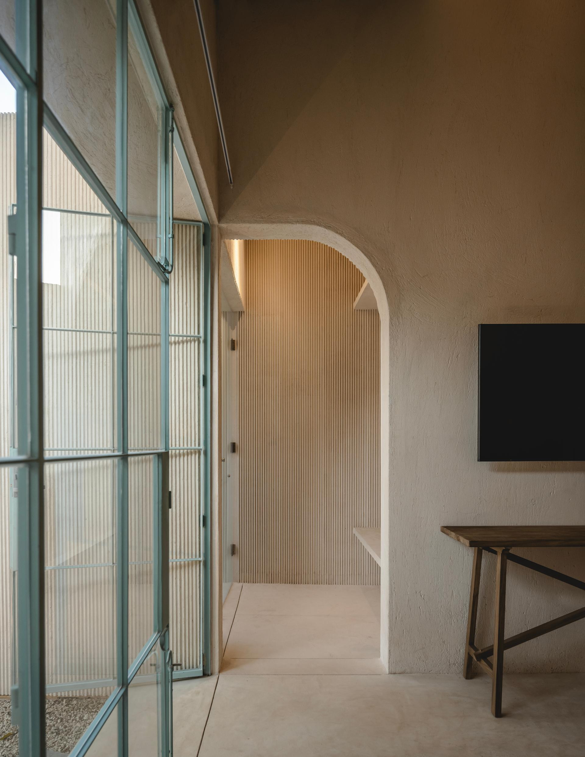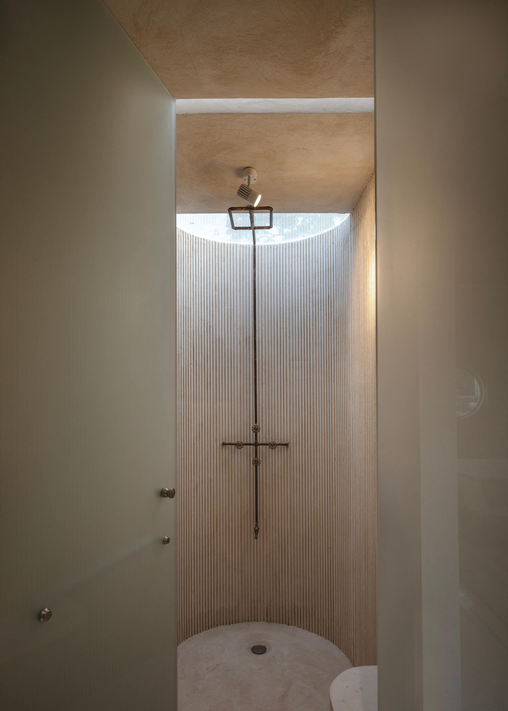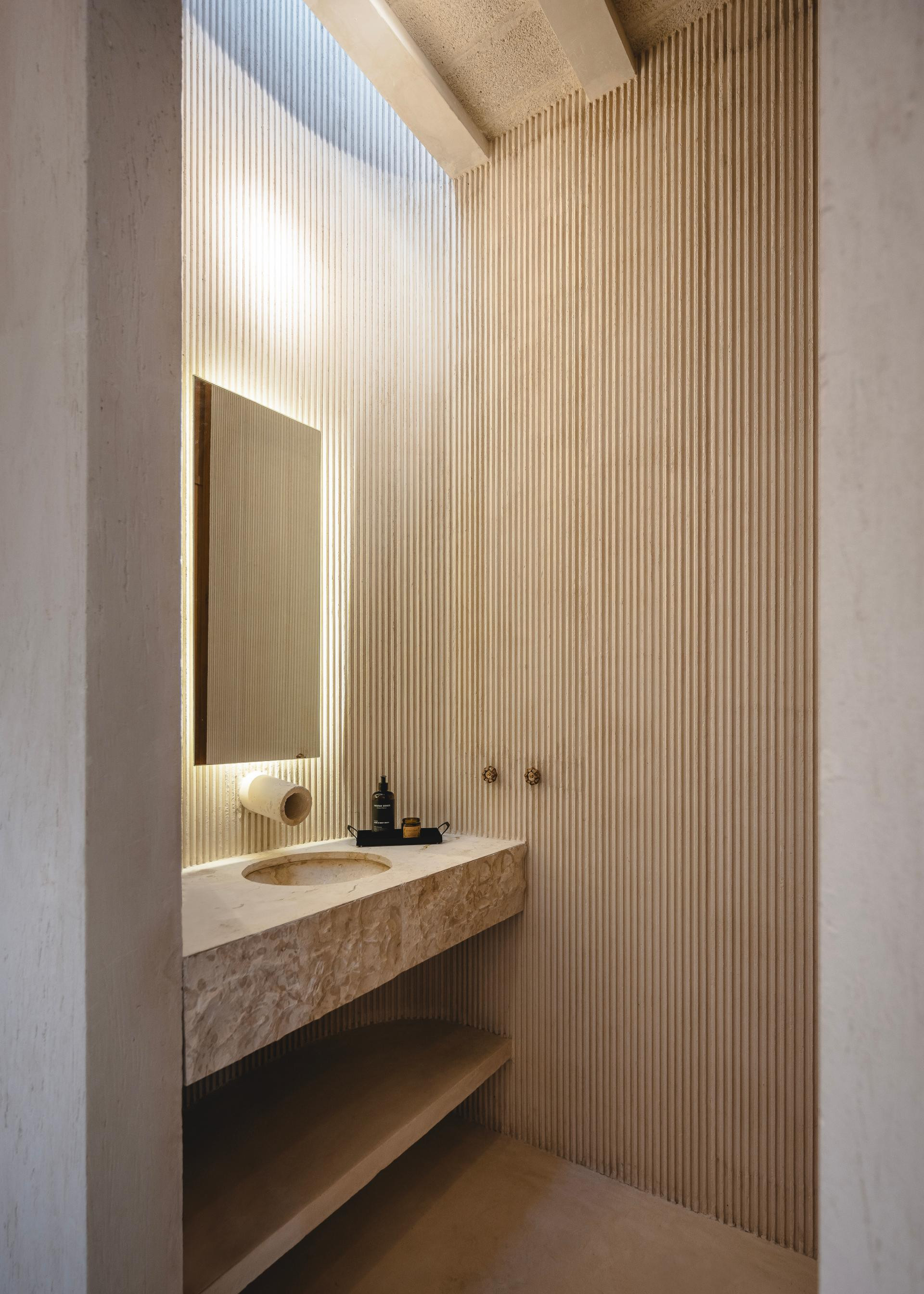 Materijali koji definiraju projekt birani su s posebnom pažnjom. Lokalna vapnena žbuka u toplim prirodnim tonovima i ručno strirani beton u vlažnim zonama, poput kupaonica, naglašavaju taktilnu povezanost s kontekstom. Novi krovovi ostavljeni su nedovršeni, s vidljivim betonskim gredama koje evociraju tradicionalne drvene konstrukcije poznate pod nazivom rollizos. Svaka kupaonica uključuje svjetlarnik u obliku polumjeseca, koji pruža izravan pogled na nebo, detalj koji svakodnevnim radnjama daje meditativnu notu.