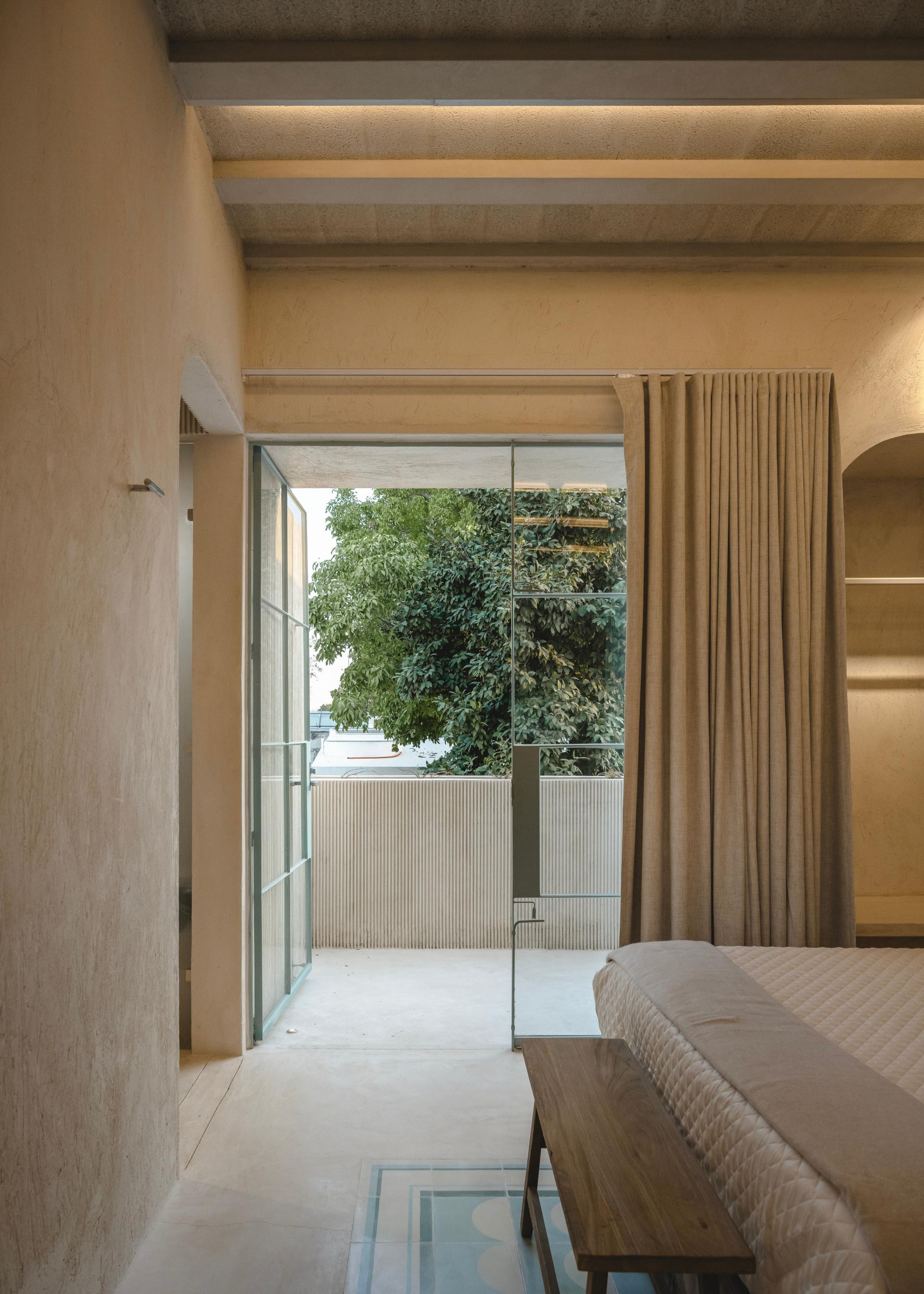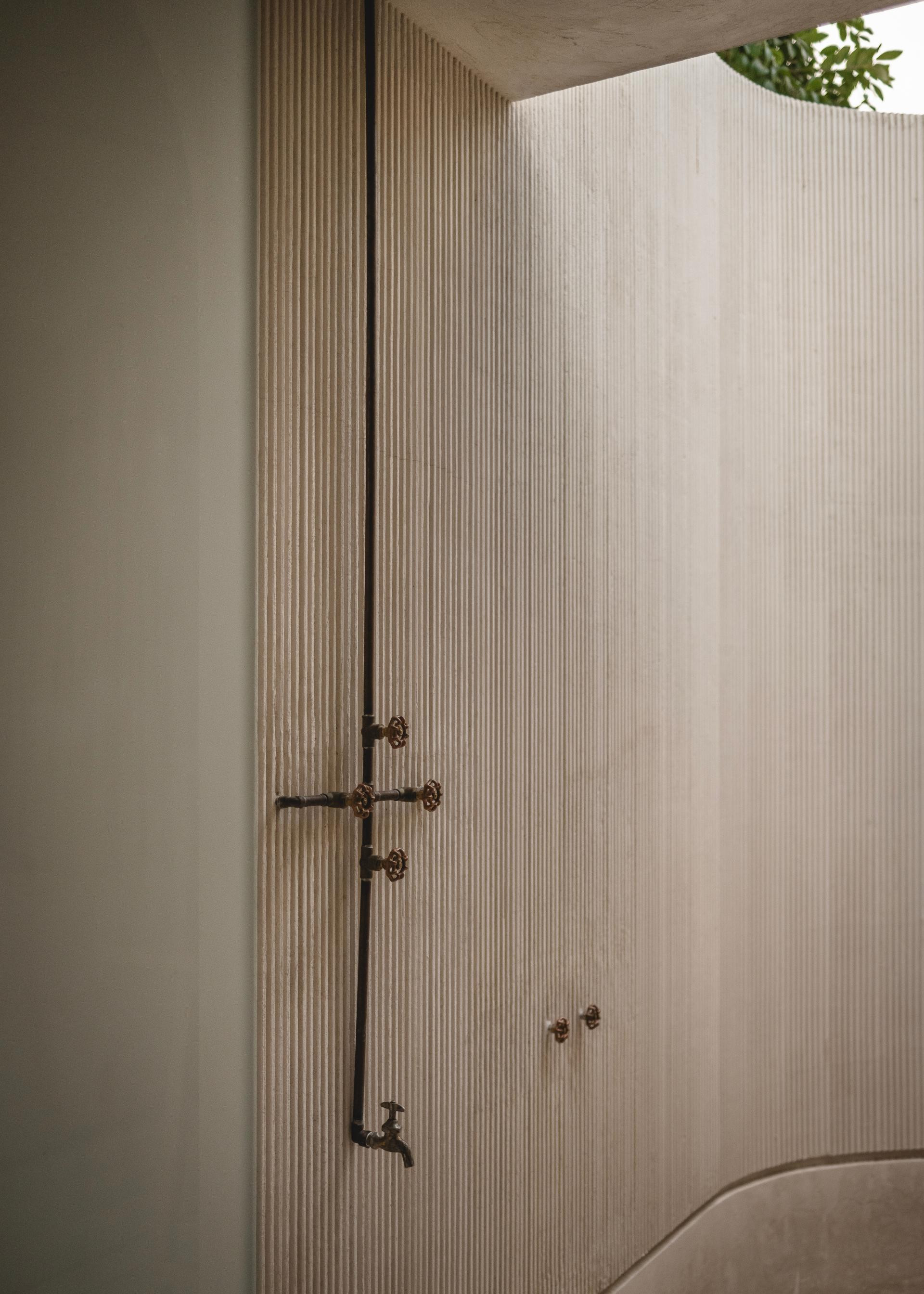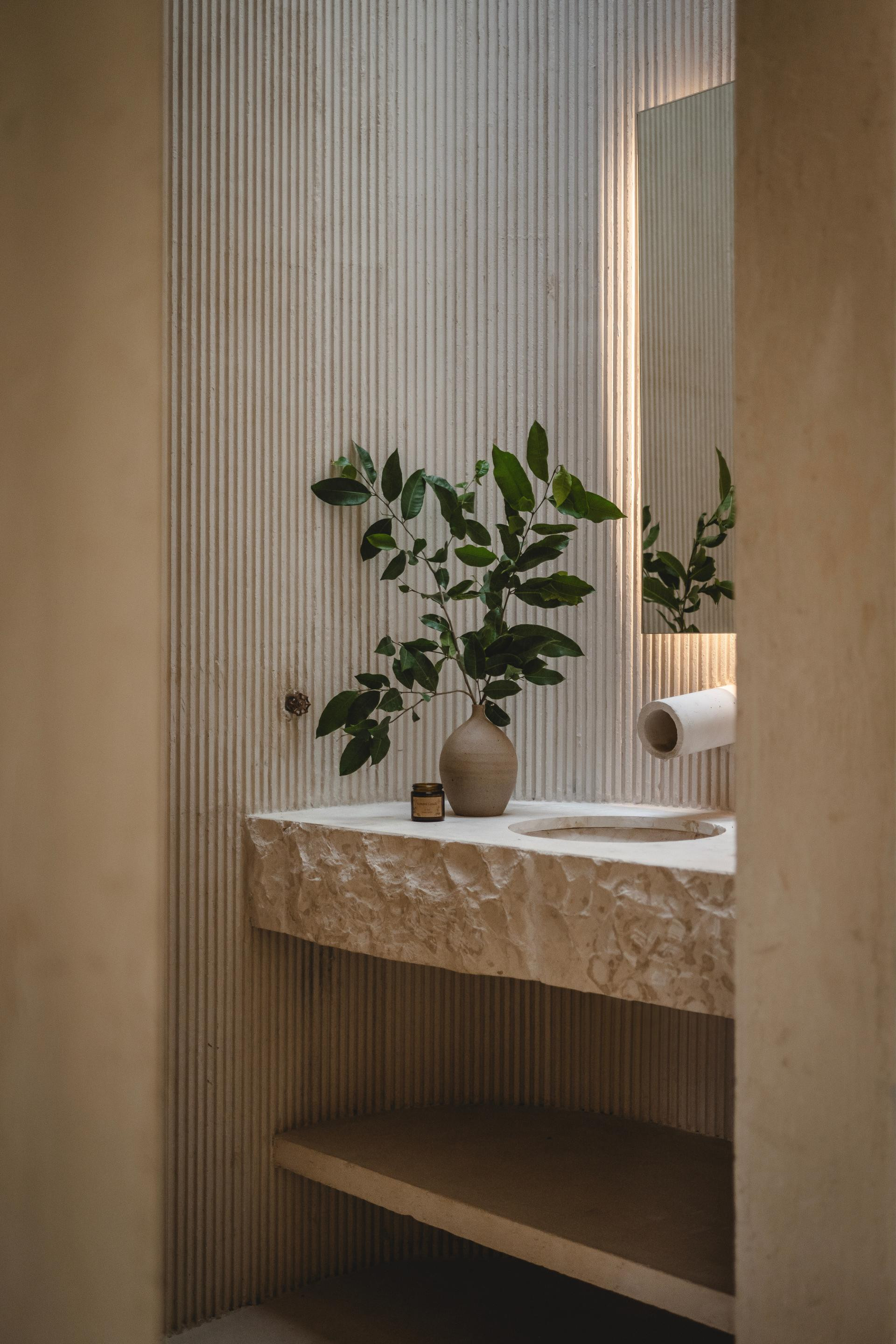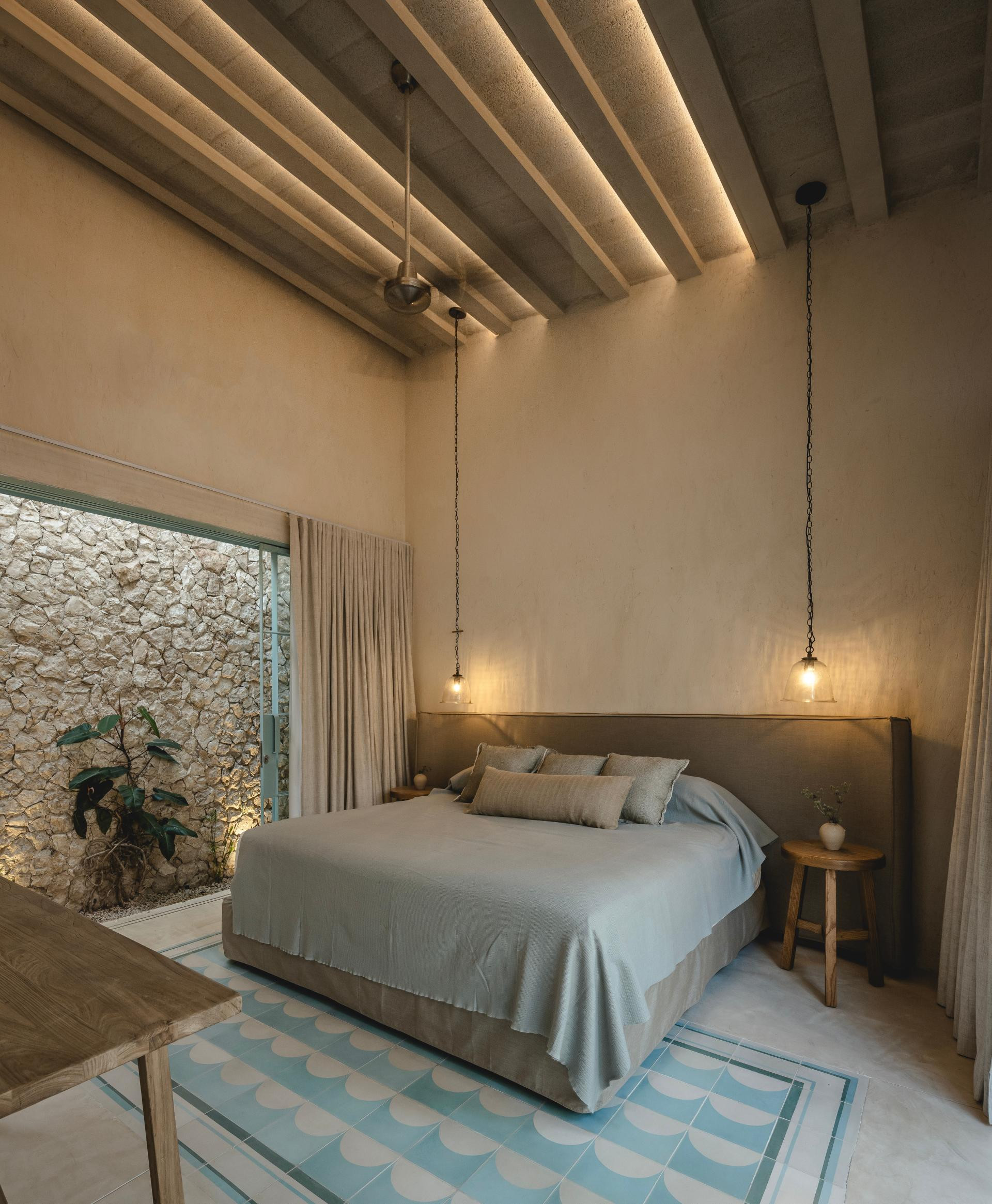 Materijali koji definiraju projekt birani su s posebnom pažnjom. Lokalna vapnena žbuka u toplim prirodnim tonovima i ručno strirani beton u vlažnim zonama, poput kupaonica, naglašavaju taktilnu povezanost s kontekstom. Novi krovovi ostavljeni su nedovršeni, s vidljivim betonskim gredama koje evociraju tradicionalne drvene konstrukcije poznate pod nazivom rollizos. Svaka kupaonica uključuje svjetlarnik u obliku polumjeseca, koji pruža izravan pogled na nebo, detalj koji svakodnevnim radnjama daje meditativnu notu.