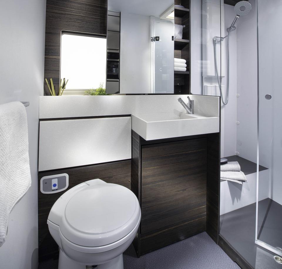 Ono što najviše iznenađuje kod ove kamp-prikolice je kupaonica - ima masivni tuš, umivaonik i veliki prozor, kao u spa.