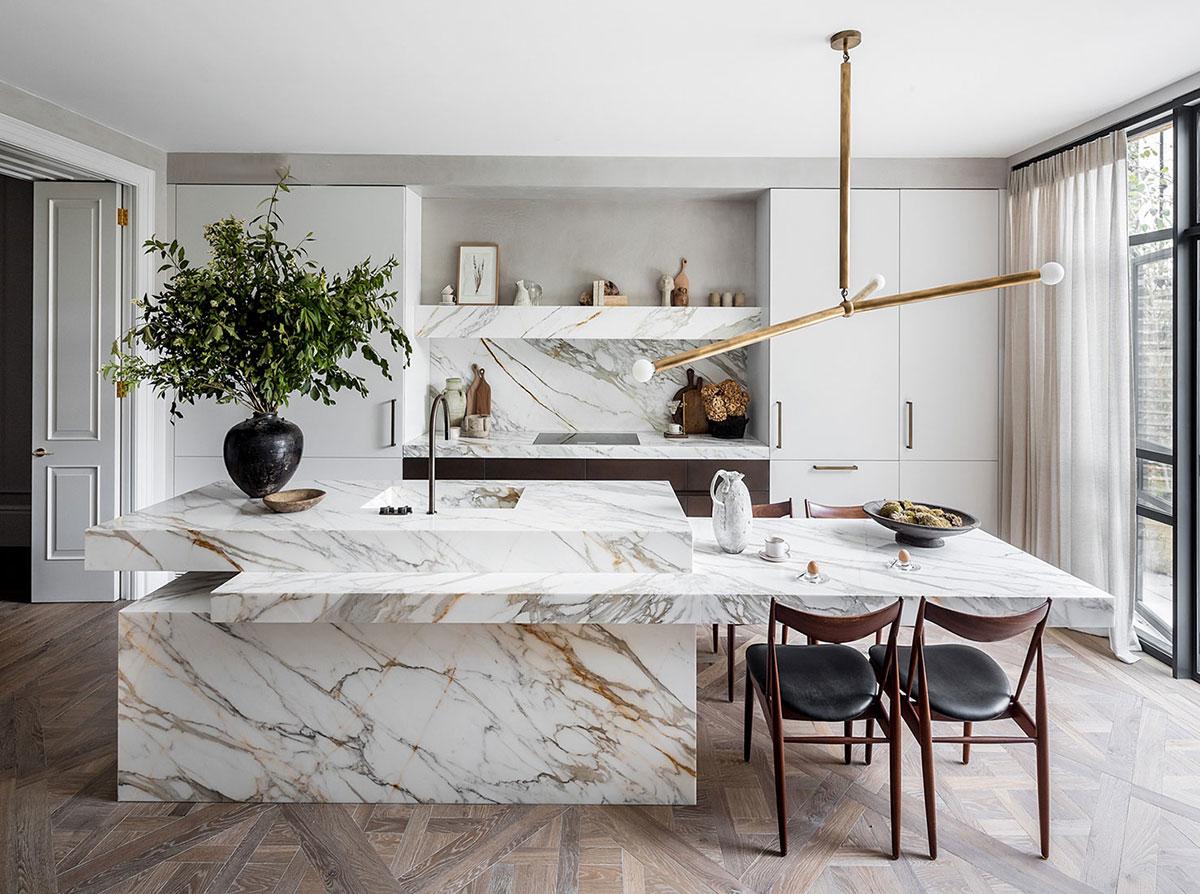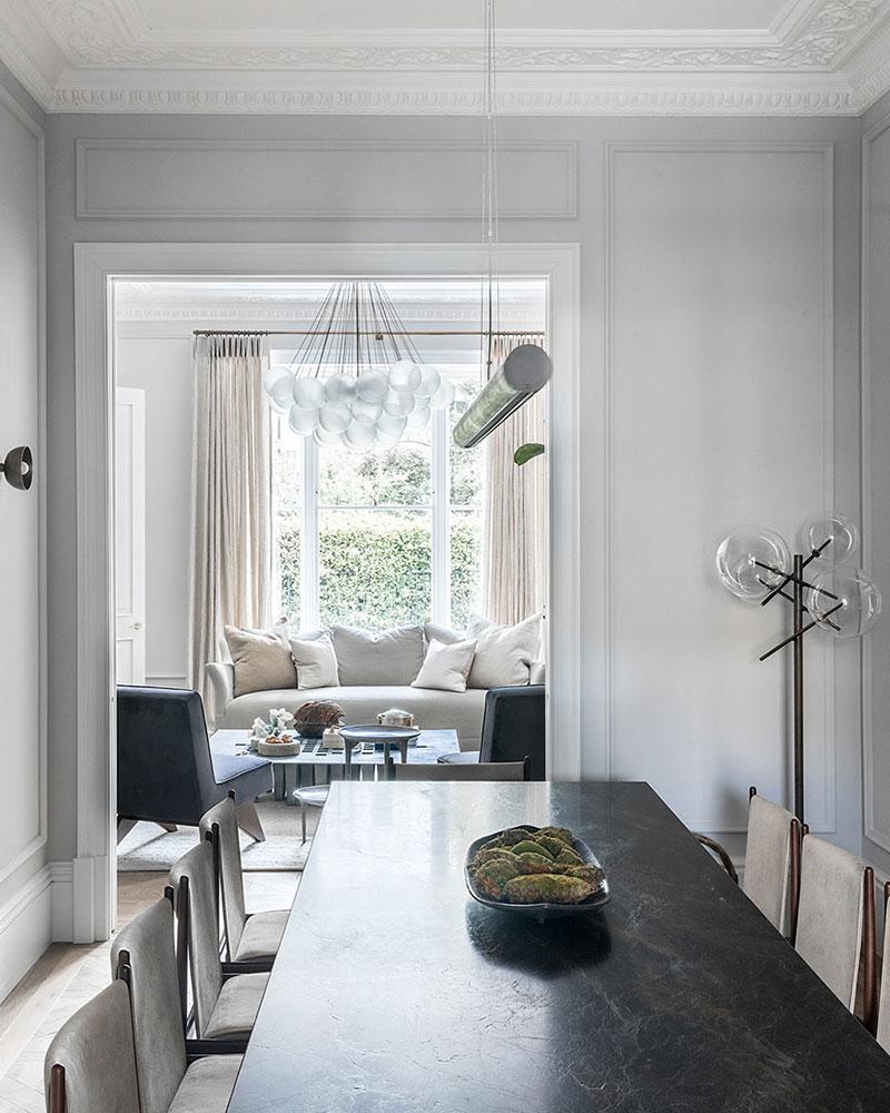 Interijer luksuzne gradske kuće u Notting Hillu u skladu je s duhom ovog popularnog londonskog kvarta - profinjen, povijesni, trendovski i estetski. Shema boja je suzdržana i neutralna, ali dizajneri nisu štedjeli na materijalima i opremi: mramoru, štukaturama, komadima namještaja vodećih svjetskih dizajnera i predmetima suvremene umjetnosti.