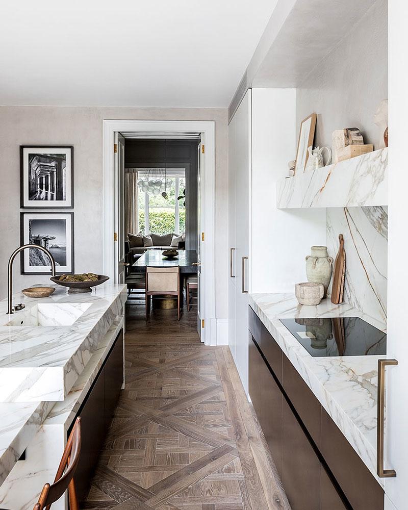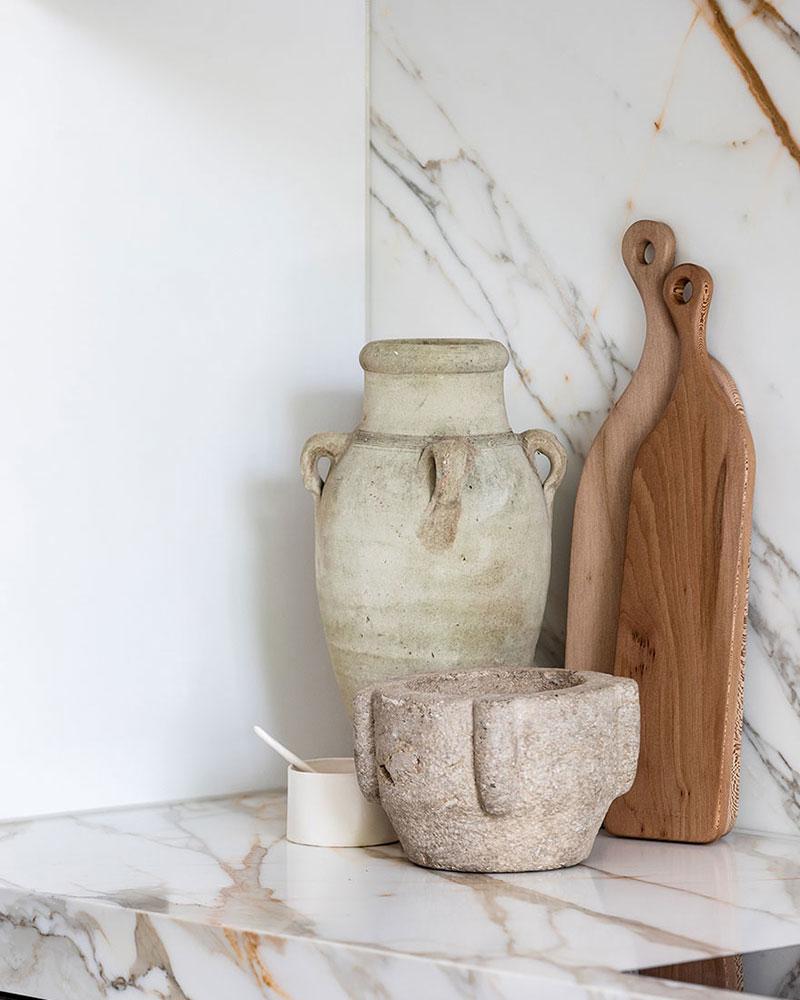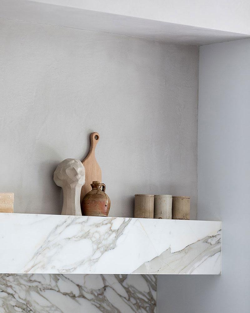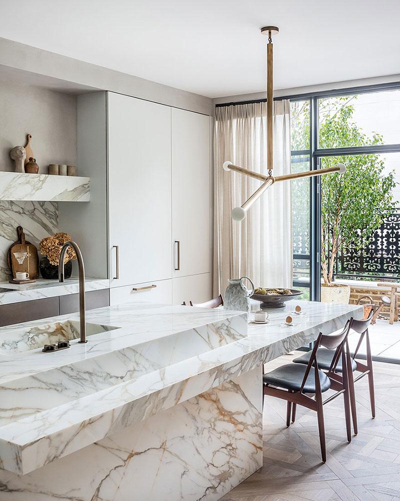 U prostranoj kuhinji u stražnjem dijelu kuće nalazi se naručeni sastav Obumex, francuskog dizajnera Josepha Dirana sa zapanjujućim mramornim konzolnim otokom opremljenim uređajima Gaggenau. Odavde vrata vode na terasu opremljenu klupom po mjeri, djelom Banda Design Studija.