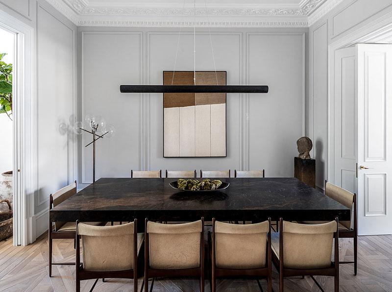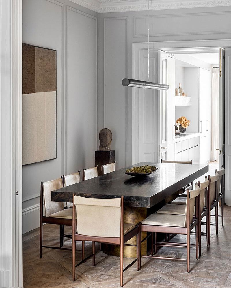 U blagovaonici su Espasso stilske stolice Cantu raspoređene oko ogromnog stola izrađenog po mjeri u mramoru i bronci.