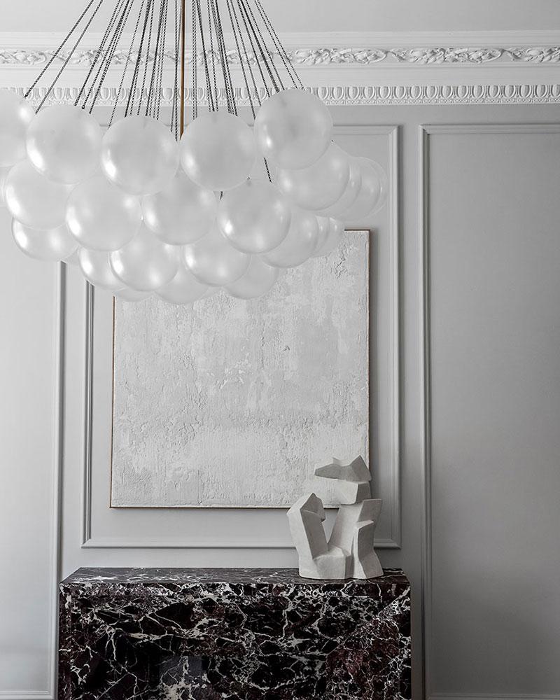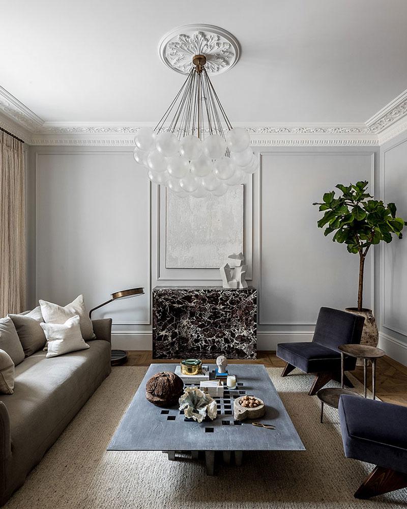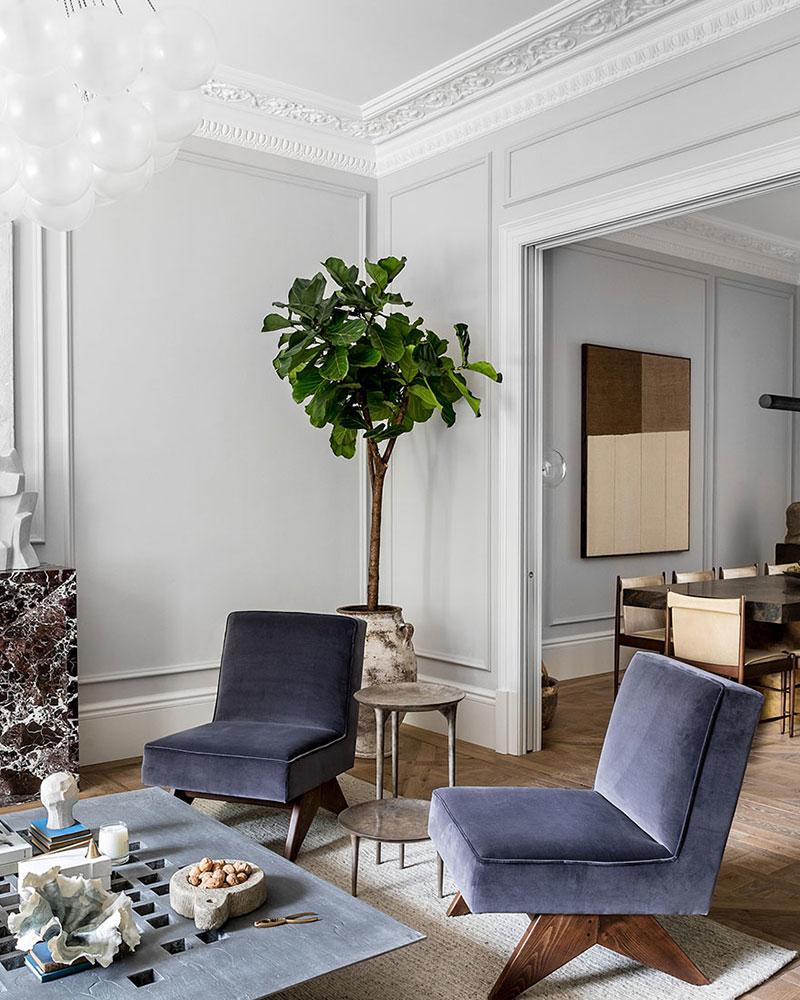 Dnevna soba prepuna je upečatljivih predmeta poput stolića za kavu danskog dizajnera Jana Jansena i pomoćnih stolova Ricka Owensa. Oni su u suprotnosti s mekanim slojevima tkanina (poput presvlake na kauču Olivera Gustava) i detaljima. Dok matirane staklene kuglice emitiraju mekani sjaj, a oponašaju tehniku glazure iz 19. stoljeća. Brončana podna svjetiljka djelo je Vincenza De Cotisa.