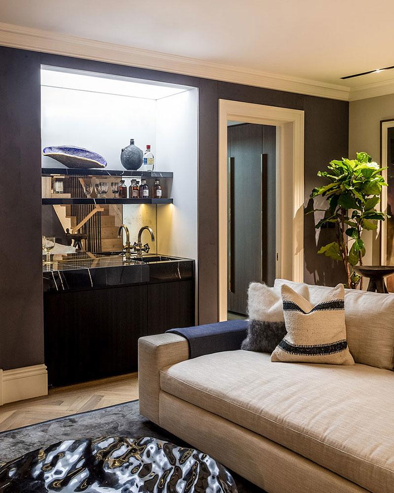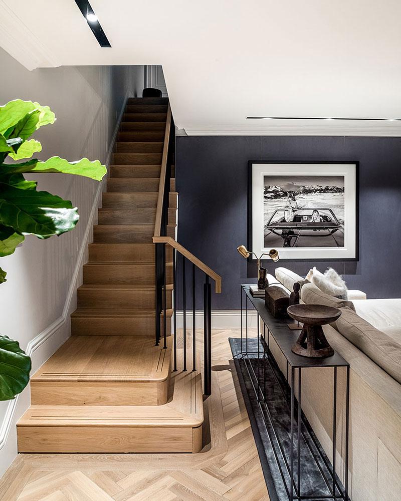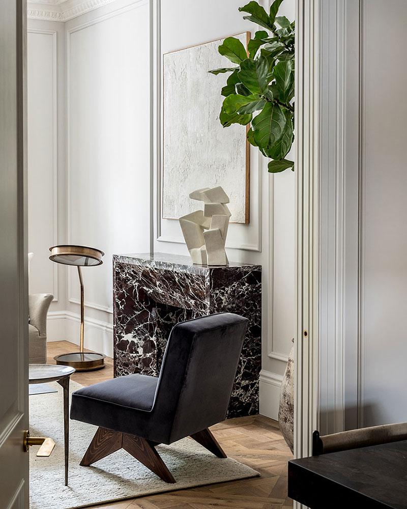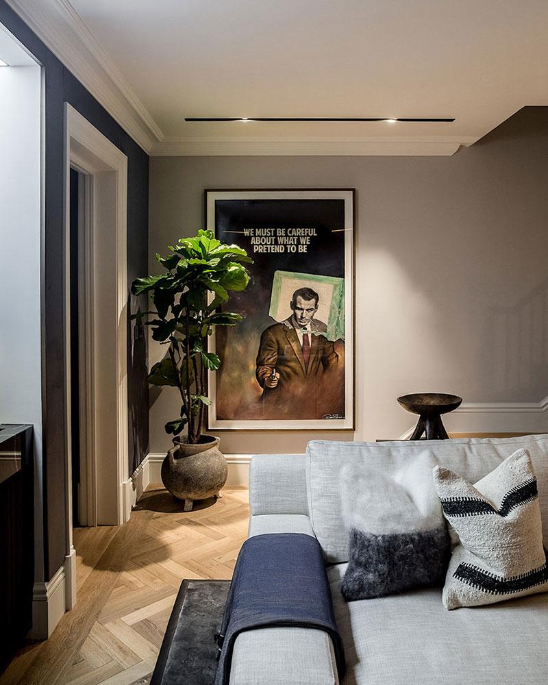 Površina gradske kuće je oko 300 četvornih metara. Duboka topla paleta kombinira tamnoplave i sive tkanine, bogato drvo, polirani mesing, brončane i narančaste tonove te zelenilo poput smokve koja se može vidjeti u cijelom prostoru. Zidovi su obojeni u sivu nijansu tvrtke Farrow & Ball, koja je savršena kulisa za apstraktnu umjetnost i skulpture, kao i upečatljiv mramorni kamin.