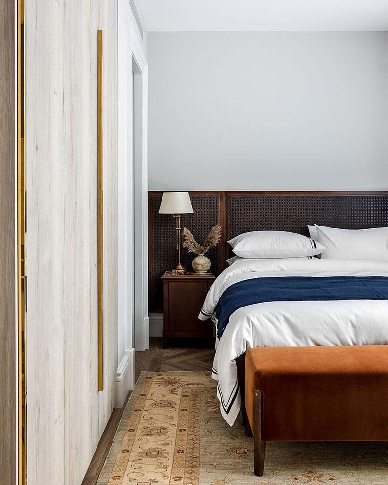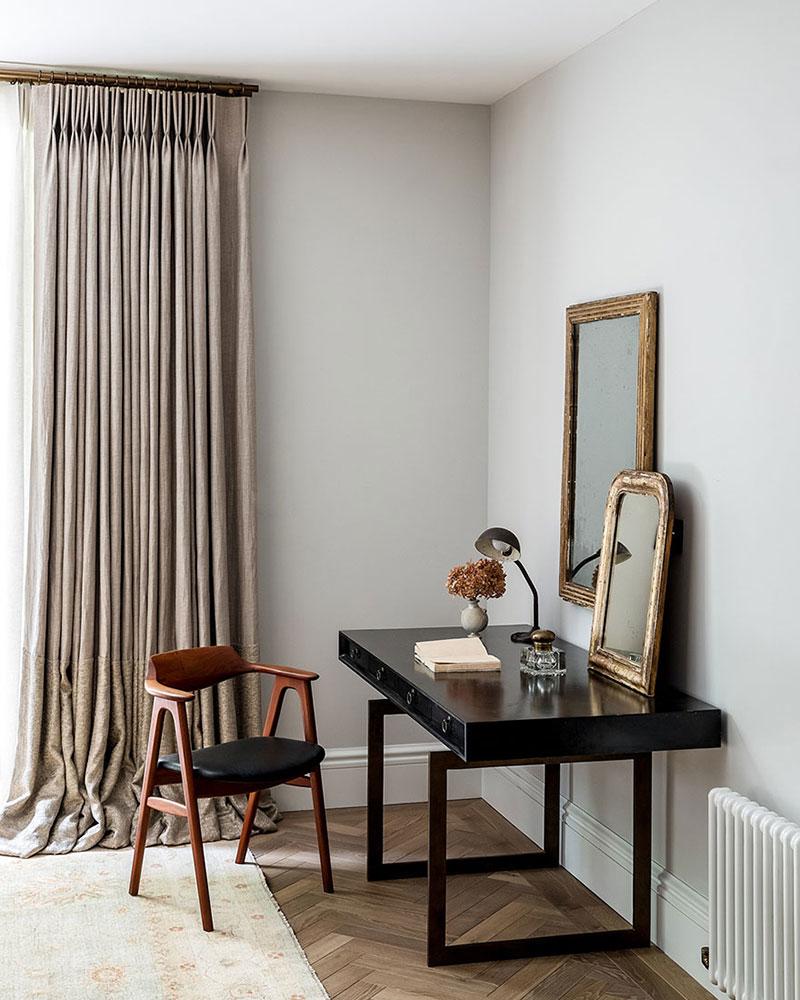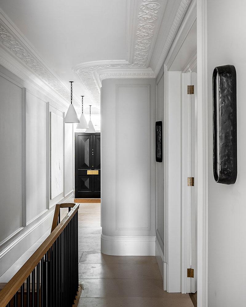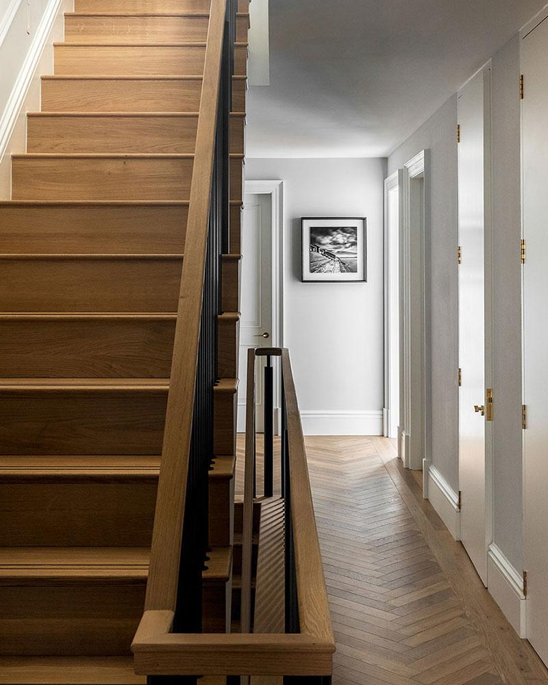Površina gradske kuće je oko 300 četvornih metara. Duboka topla paleta kombinira tamnoplave i sive tkanine, bogato drvo, polirani mesing, brončane i narančaste tonove te zelenilo poput smokve koja se može vidjeti u cijelom prostoru. Zidovi su obojeni u sivu nijansu tvrtke Farrow & Ball, koja je savršena kulisa za apstraktnu umjetnost i skulpture, kao i upečatljiv mramorni kamin.