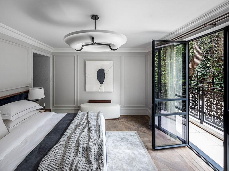 Iz hodnika stepenice vode do dvije gornje razine. Glavna spavaća soba nalazi se unutar donje razine prvog kata: iz nje možete ući u vrt, isprepleten zelenim biljkama. U spavaćoj sobi tekstura je upečatljiva s baršunastim uzglavljem i ležaljkom prekrivenom boucleom. Noćne ormariće od ružinog drveta i mesinga dizajnirali su Sven Engström i Gunnar Mirstrand, a proizvodi ih švedska tvrtka Tingströms. Dizajnu rasvjete posvećena je posebna pažnja: Hector stolne svjetiljke s mramornim postoljem Brigitte Israel i viseća svjetiljka Anneau, s gipsanim prstenom i pocrnjenim brončanim detaljima Erica Schmitta.