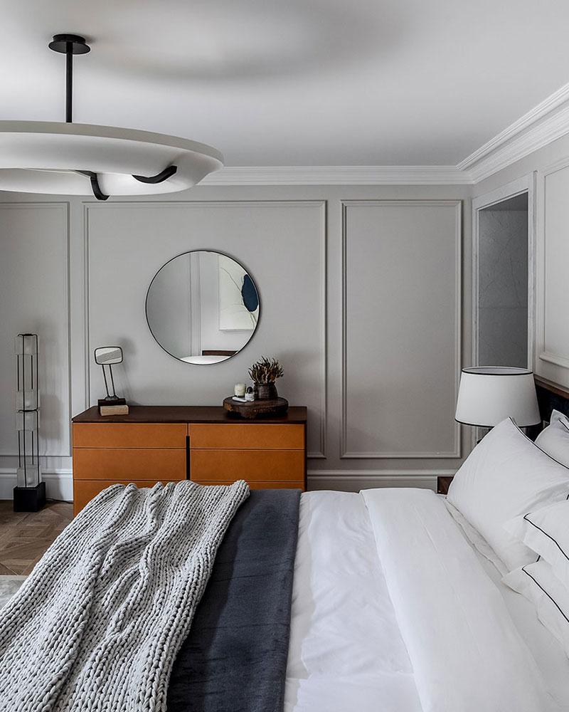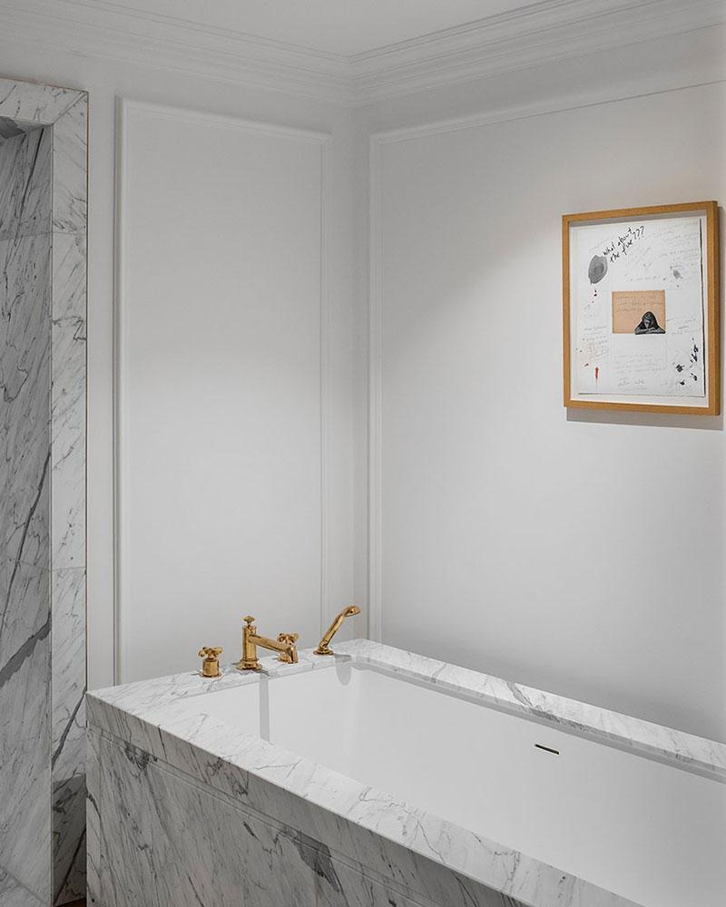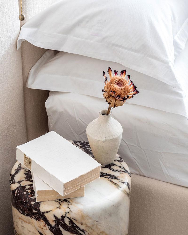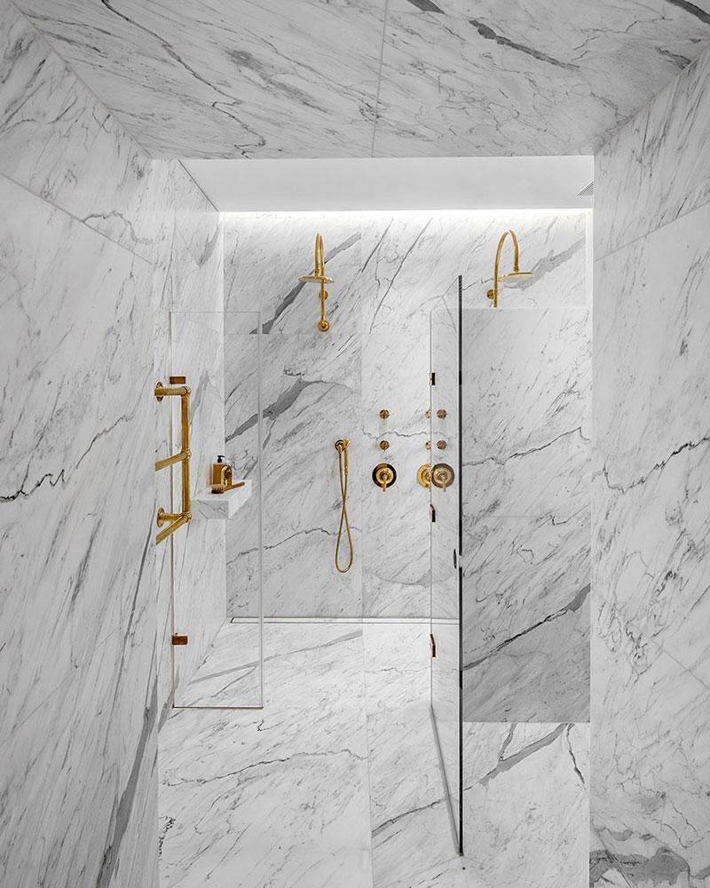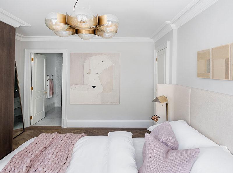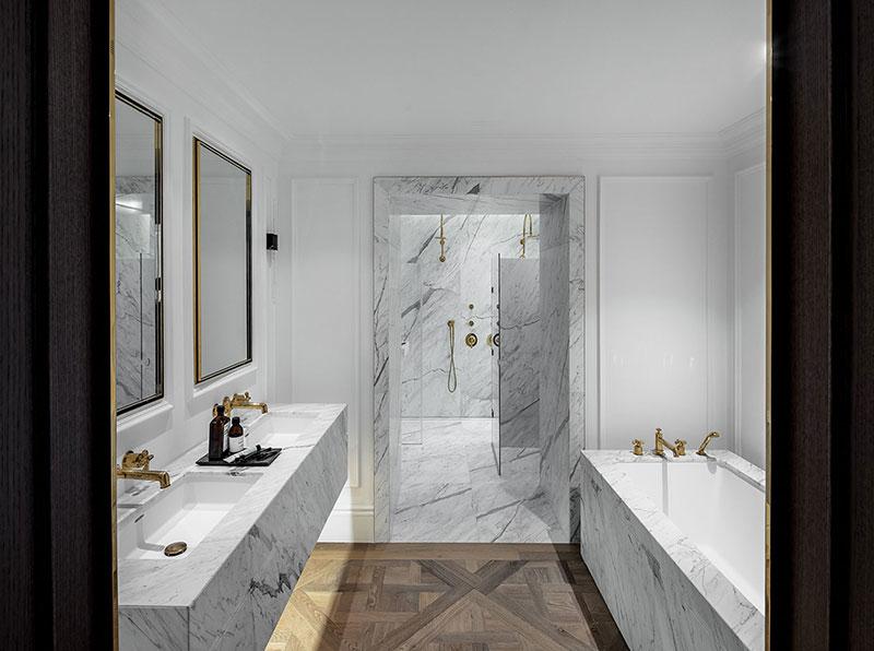 Glavna kupaonica izrađena je od svijetlog mramora (Calacatta Statuario) s dvostrukom tuš kabinom i samostojećom kadom. Na drugom katu nalazi se još jedna kupaonica. Tu je i druga spavaća soba s bračnim krevetom, i prilagođenim zakrivljenim uzglavljem te drvenim oblogama. Osvjetljenje je ovdje također posebno: talijanska viseća svjetiljka tvrtke Stilnovo, izrađena od bakelita, mesinga i bijelog opalovog stakla, definira atmosferu. Prostirač Laine ručno je tkala Sarah Helsinki u Etiopiji: cilj prakse ove dizajnerice je poboljšati životni standard obrtnika koje trenira i unajmljuje u Addis Abebi.