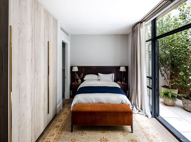 Gostinjska spavaća soba u prizemlju opuštenija je s uzglavljem od orahovog ratana i pomoćnim stolovima koje je izradio Alter London, dok se na vanjskoj terasi nalazi namještaj iz kolekcije Maison Gatti.