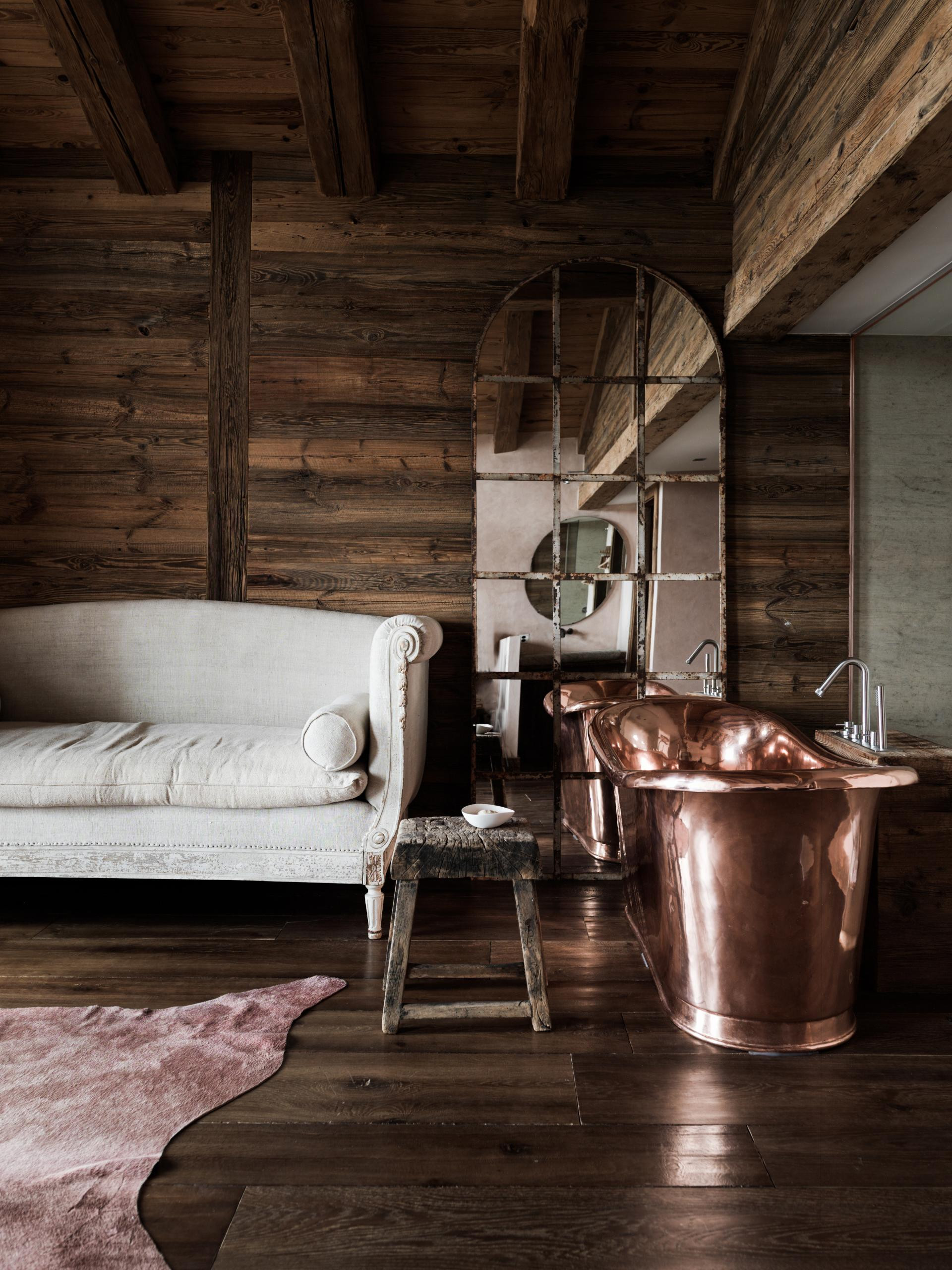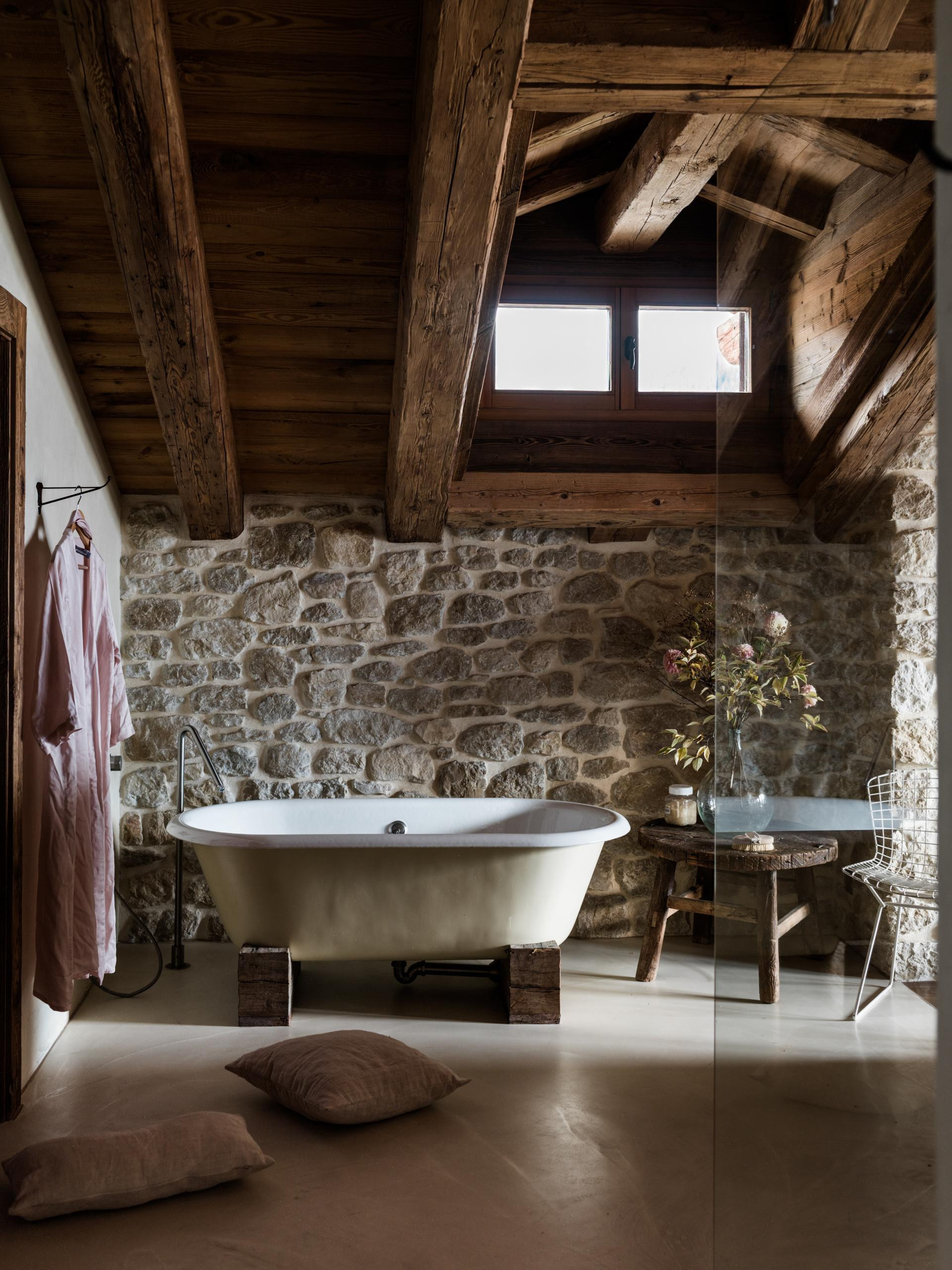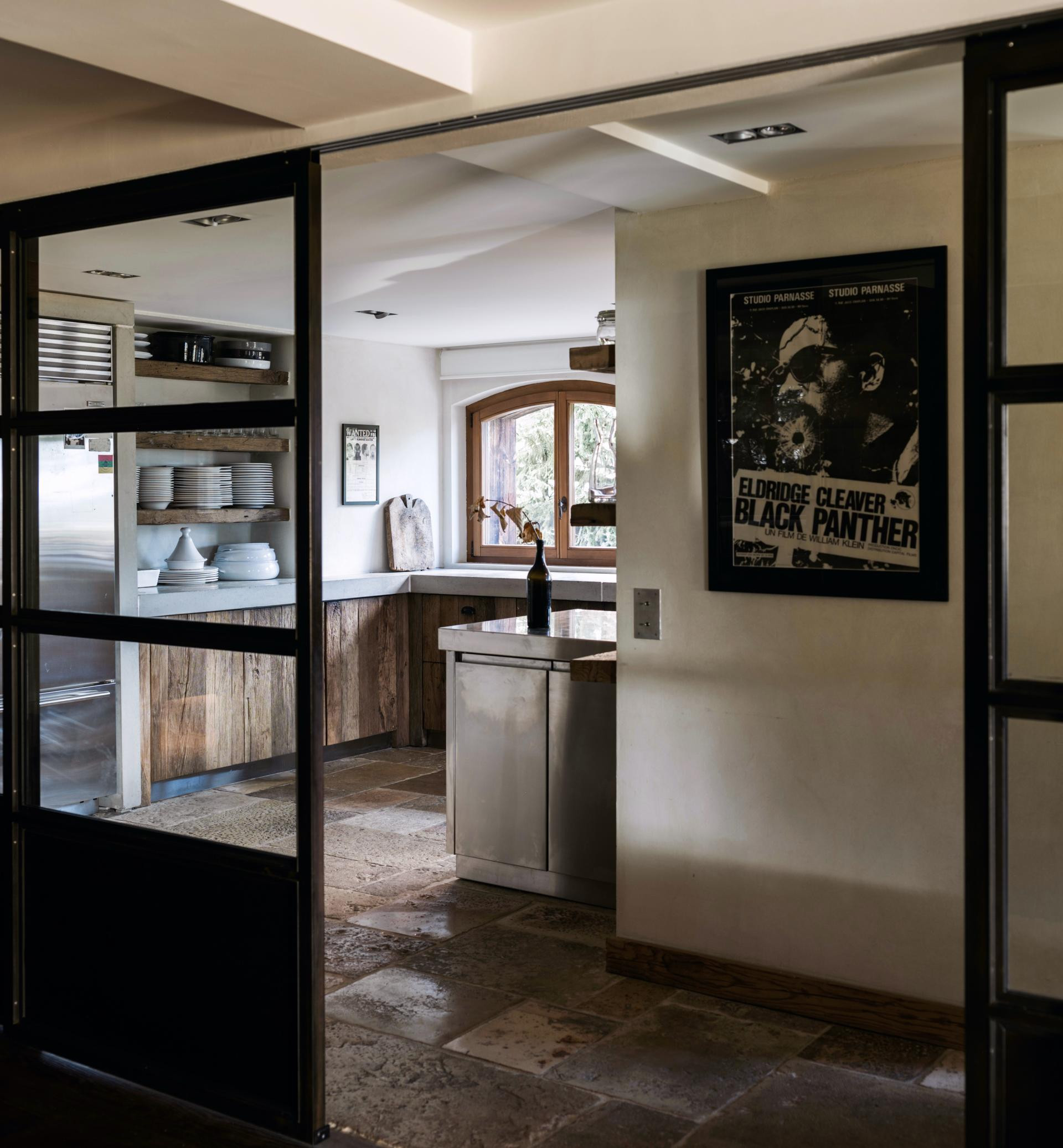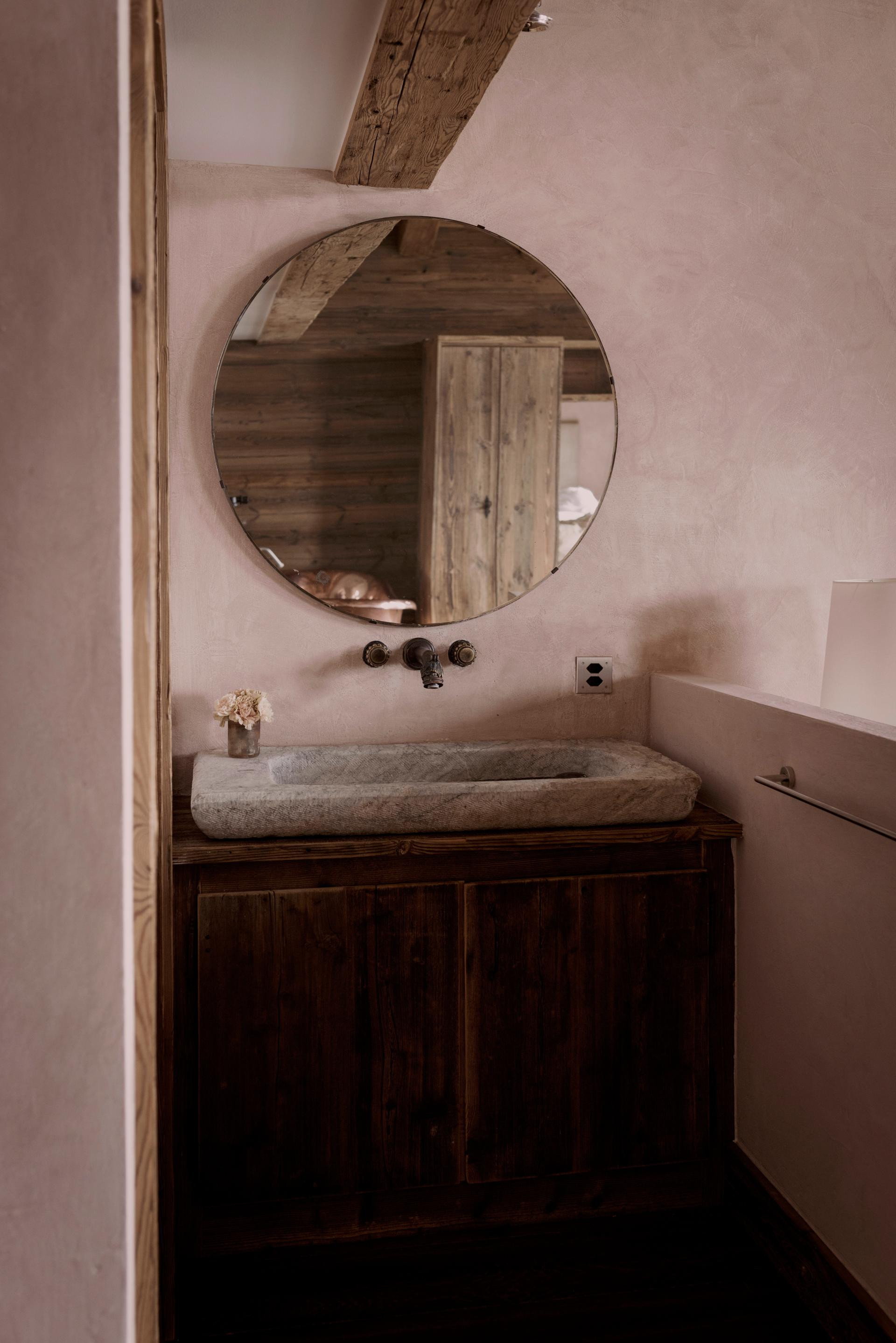 Prirodni materijali korišteni u interijeru, prema riječima dizajnerice, odabrani su zbog svoje sposobnosti da s vremenom dostojanstveno stare. Zidovi su prekriveni mineralnim vapnenim bojama, dok su obloženi drvom skinutim s rušenih alpskih staja. Paleta boja naginje neutralnim tonovima, s posebnim naglaskom na zemljane smeđe i nježne krem nijanse.