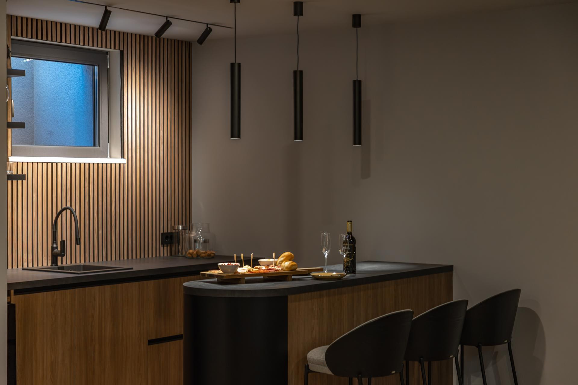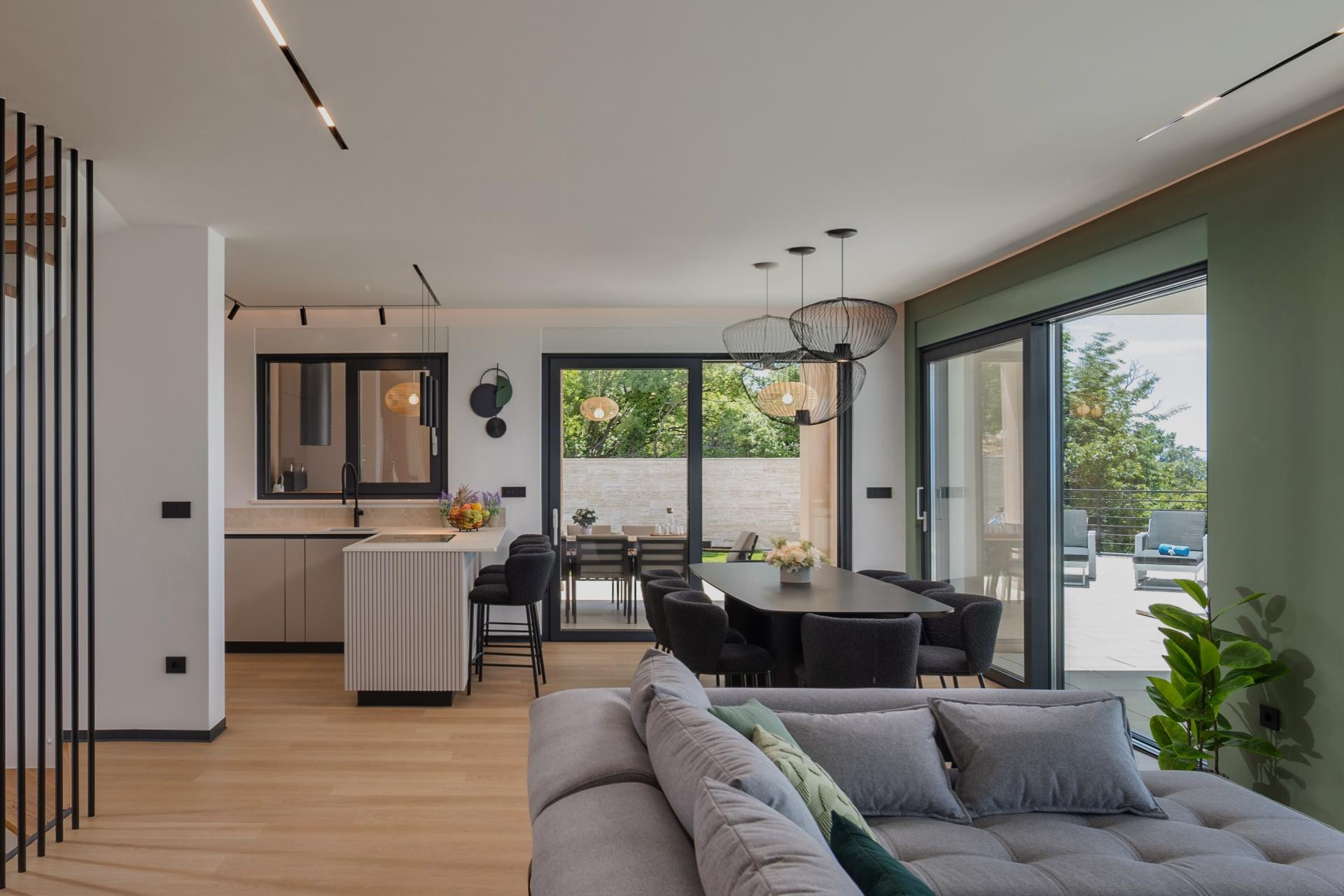 Već od samog ulaza u vilu primjećuje se pažnja koja je poklonjena detaljima. Dnevni je boravak, spoj minimalističke elegancije i topline doma, zasvijetlio u punom sjaju uz pomoć moderne ugradbene magnetne šinske rasvjete s nekoliko različitih rasvjetnih tijela, koja jasno upućuje da riječ o prostoru namijenjenom druženju s prijateljima ili obiteljskom okupljanju.