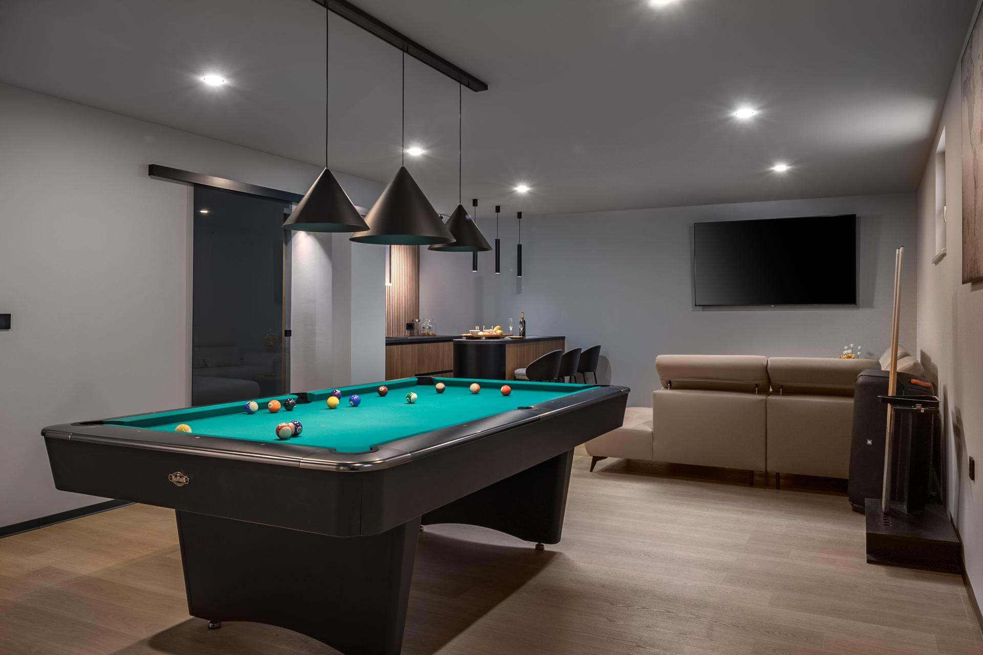 Spavaće su sobe raskošno okupane u svjetlu uz pomoć ugradbene magnetne šinske rasvjete, a uz krevete su postavljene visilice Hermanos i Eye te zidne svjetiljke Easy LED. Kombinacija je to koja prostoru daje opuštajuću toplinu, ali prema potrebi osigurava i precizno osvjetljenje za čitanje. Kupaonice krase ugradbene svjetiljke Uno i trendi visilice Baton postavljene uz ogledala; takva rasvjeta stvara ugodnu atmosferu, ali je i izuzetno praktična pri svim intimnim ritualima pri kojima je svjetlost ključna. Soba za biljar, prostor za opuštanje i igru, oživjela je uz visilice Zenith, koje su dostupne u različitim bojama i veličinama.