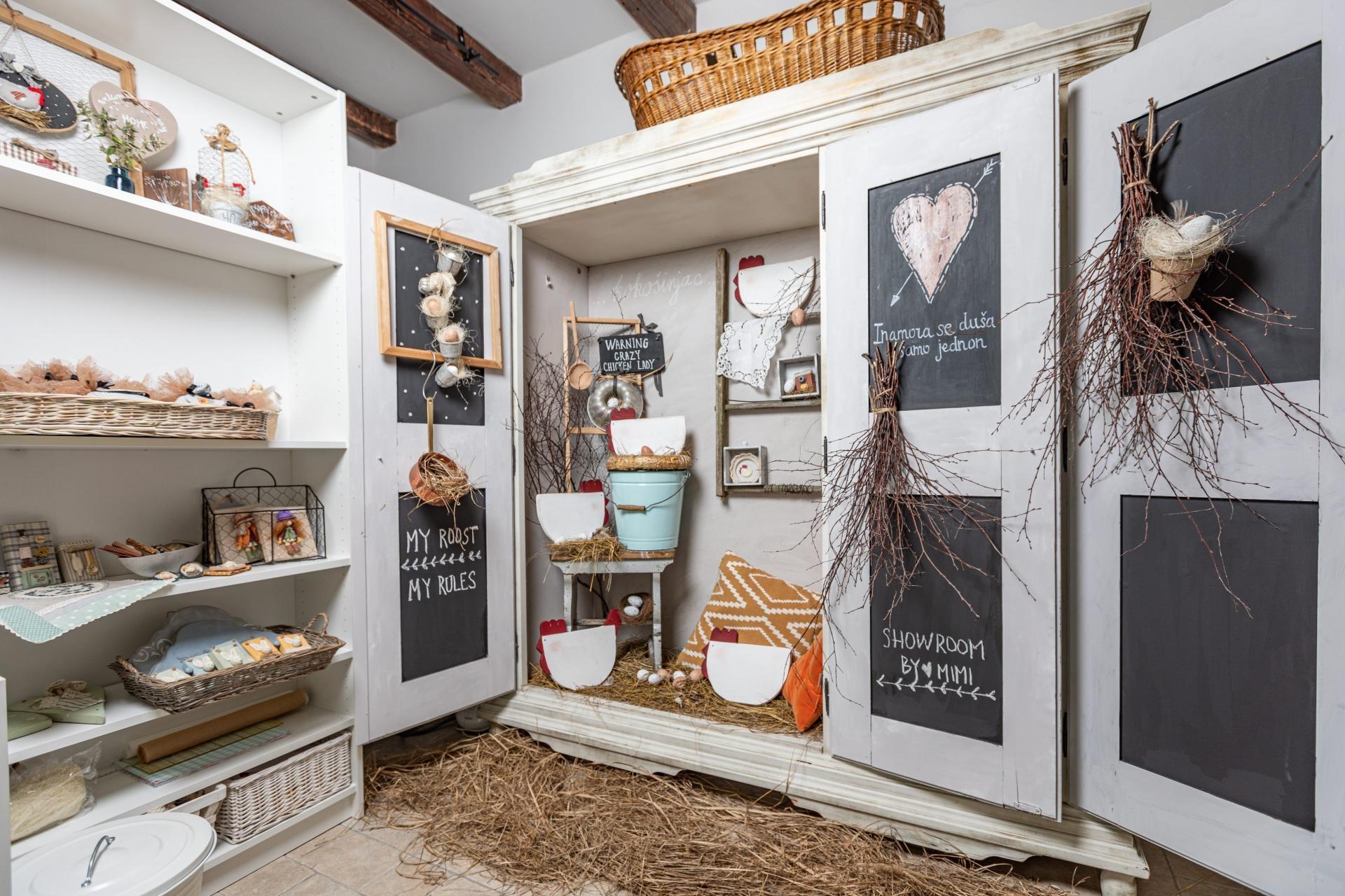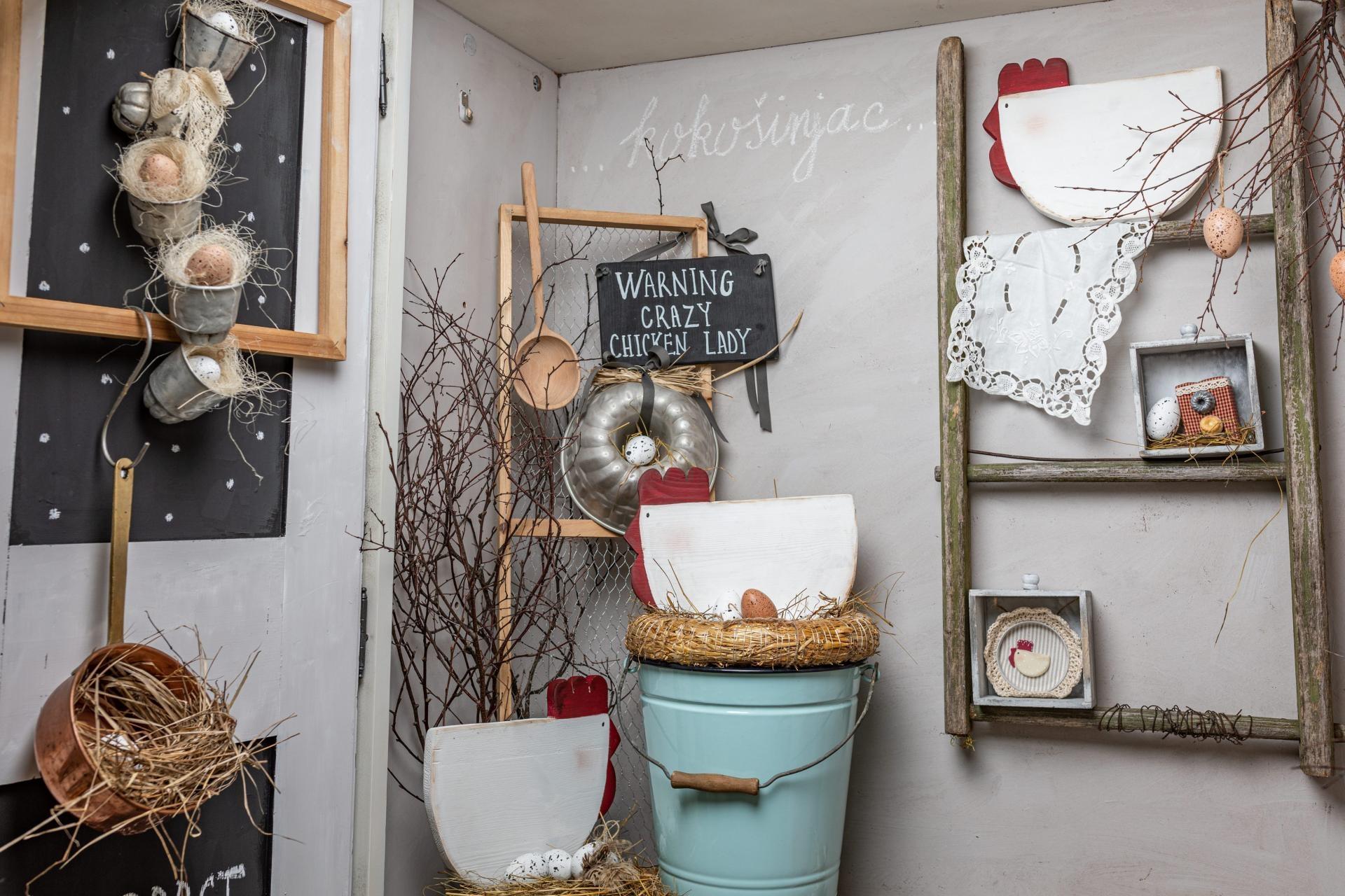 - Volim stare stvari, dati život nečemu što je netko odbacio, bio to lonac, poklopac, ogledalo ili neki komad namještaja. Sve što preuredim, kao detalj pronađe mjesto u mojem ili tuđem domu. Nije mi teško u jednom danu preokrenuti pola stana, prebojiti dio zida... Jednostavno u hodu nastane klik i, eto, napravim showroom. Prvotna ideja zapravo je bila osmisliti interesantan kutak u kojem će se djeca prijatelja slikati kako bi im kasnije ostala uspomena - kaže sa smiješkom i dodaje kako je showroom osmišljen kao prostor koji će se mijenjati ovisno o temi, godišnjem dobu i prigodi. Trenutačno su u prvom planu Uskrsne dekoracije, koje dolaze do izražaja na crnom zidu. Tu su šivani pastelni i crni zečići, vijenci s pisanicama, od materijala prevladavaju sijeno, breza, maslina, vrba, odnosno mica-mace, a neočekivani detalj definitivno je "kokošinjac" s kokama, ručno rađenim drvenim bojanim ukrasima.