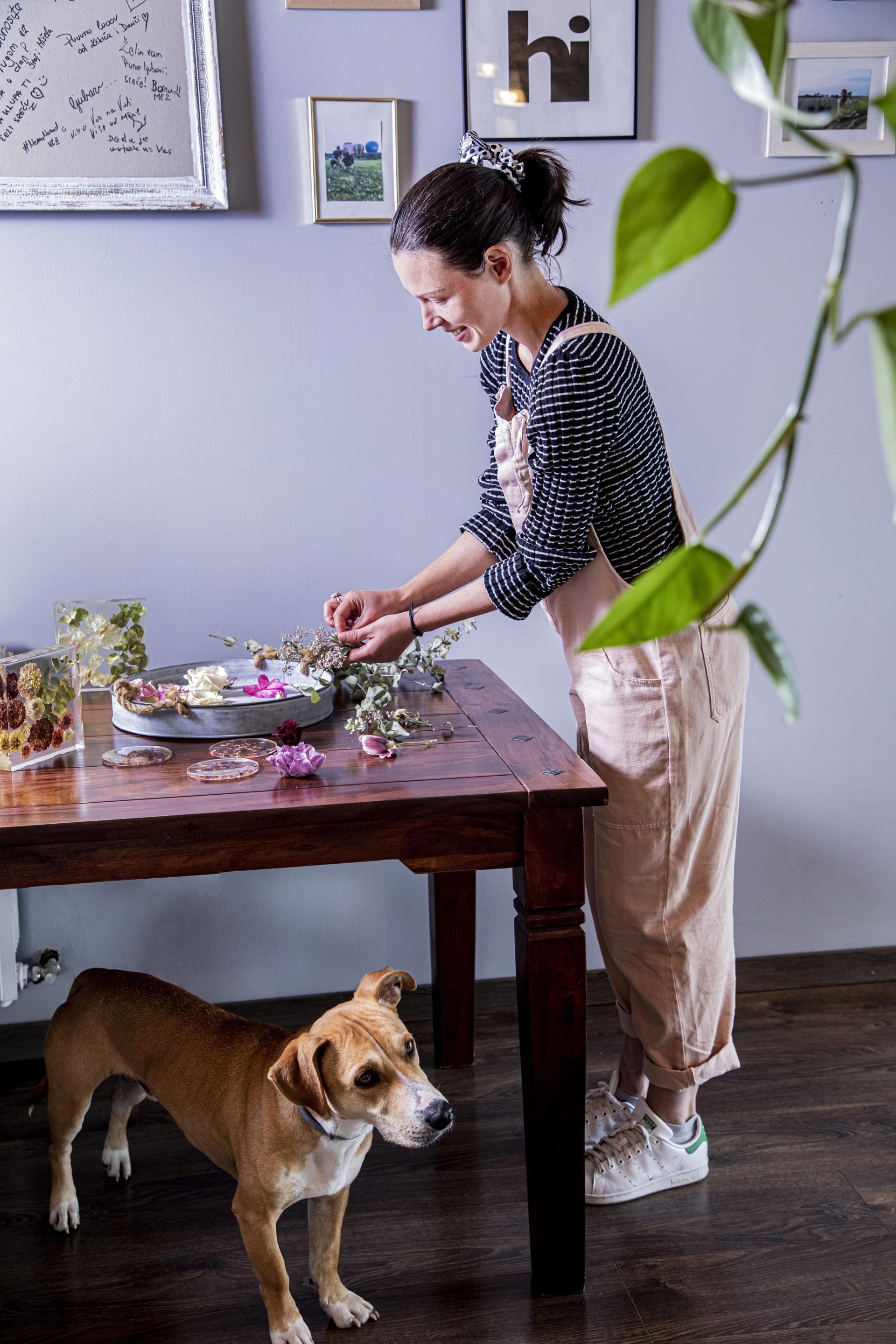 Na žutoj polici uočavamo i Adrianin vjenčani buket koji se posušio, ali ona ponosno ističe kako je u sklopu Bouqueterije pronašla tehniku kojom može sačuvati bukete drugih mladenki. Cijelim prostorom prevladava, naravno, i živo zelenilo: filodendroni, nekoliko vrsta fikusa, orhideje, drvo života, monstera... Dosta toga sade i u dvorištu gdje je bilo močvarno tlo pa su navezli zemlju, presadili božićna drvca, posadili nebesko drvo, izradili povišene gredice...