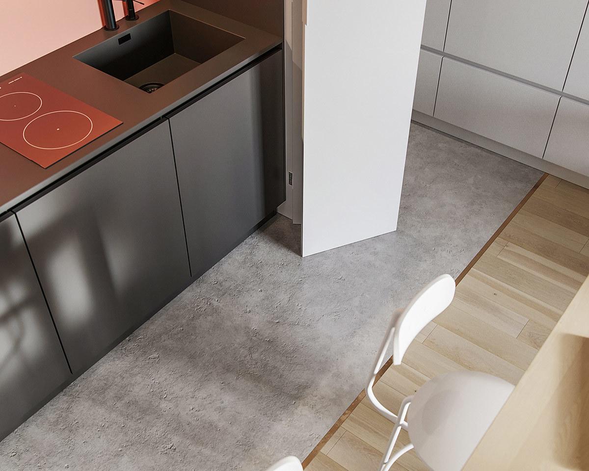 Kako bi interijer bio što funkcionalniji, dizajneri su se dosjetili dvokrilnih vrata koja se povlače i tako otkrivaju zidnu kuhinju s elementima crne i smeđe boje.