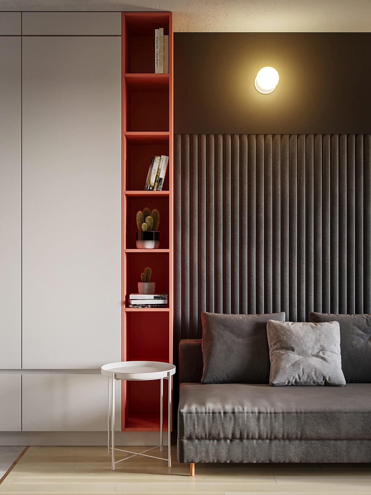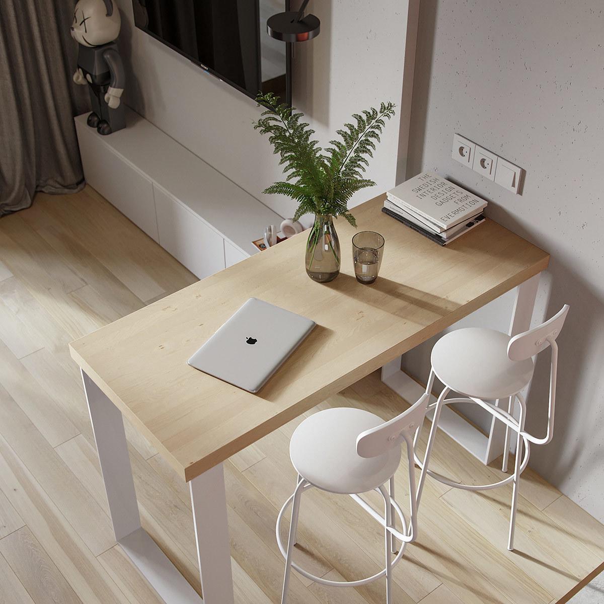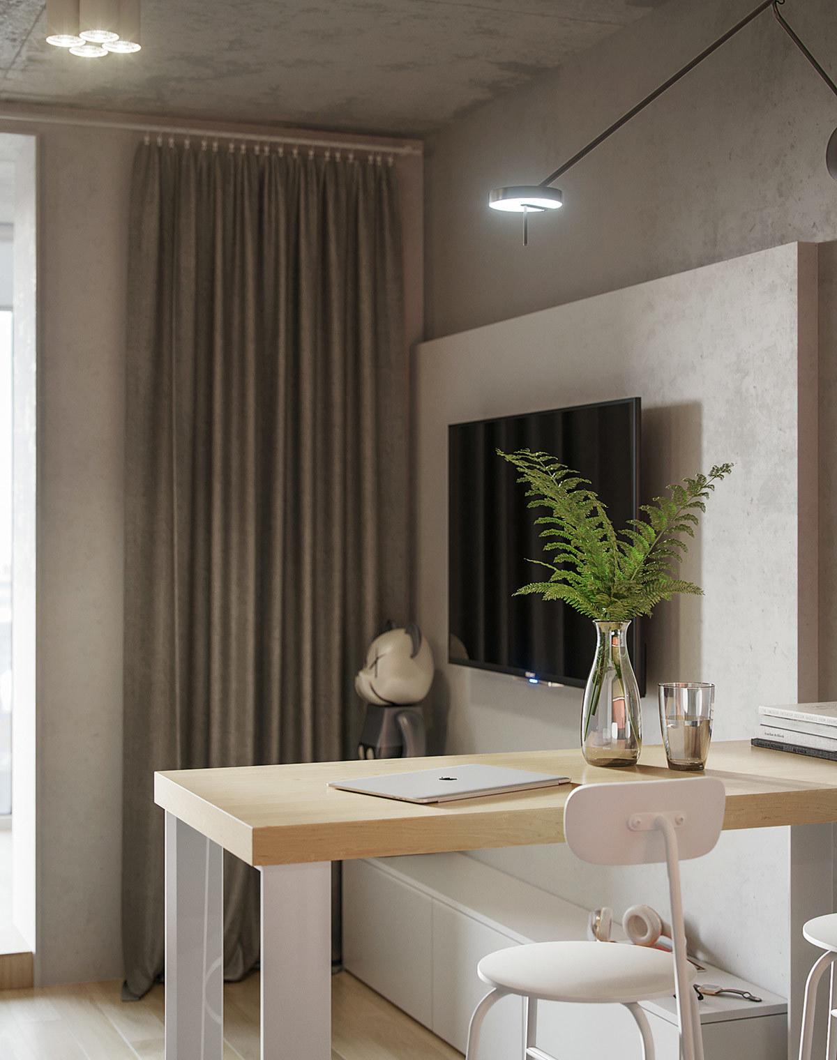 Stan izgleda lijepo i skladno s minimalnim izborom količine namještaja, boja i oblika. Uz zid s TV-om, dizajneri su u dnevni boravak stavili i zanimljivu svjetiljku s pokretnom 'rukom' koja osvjetljava radni stol.